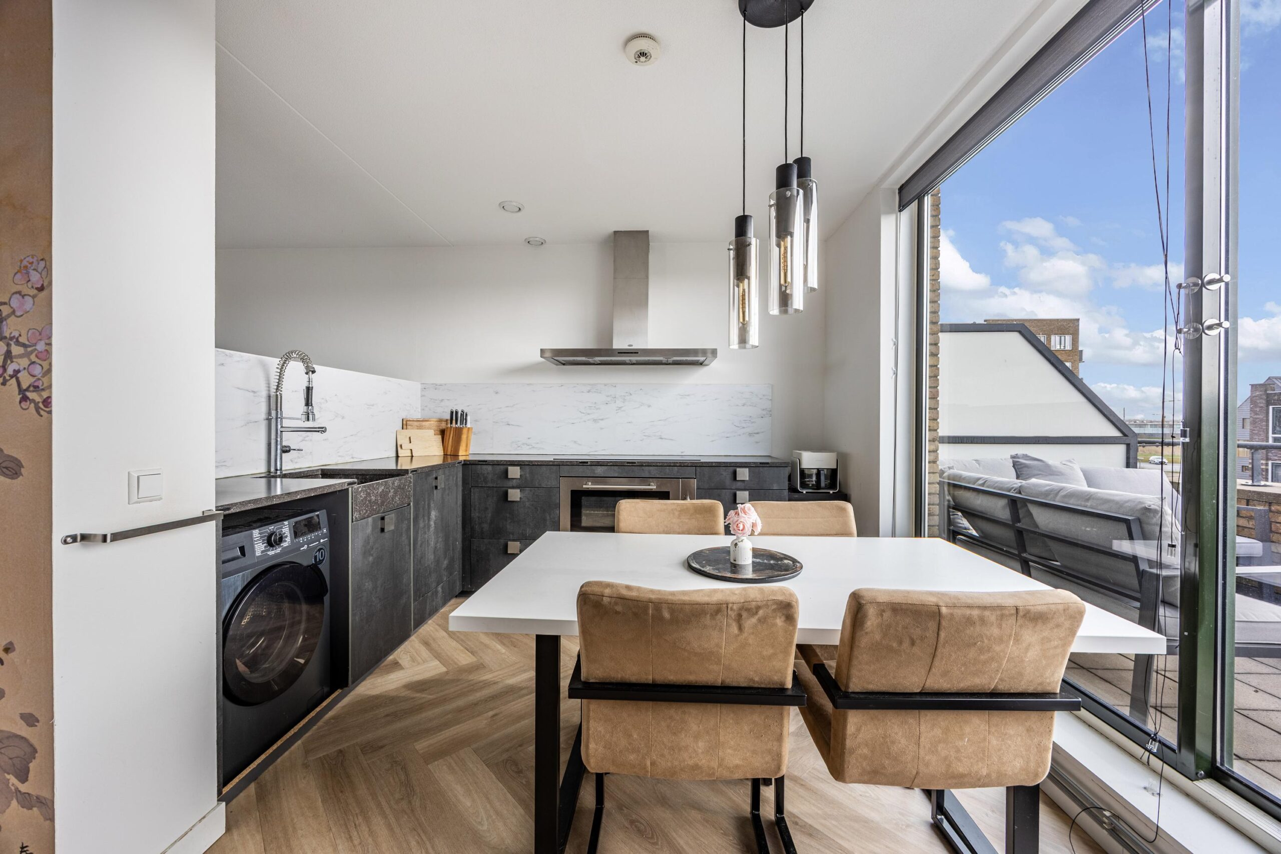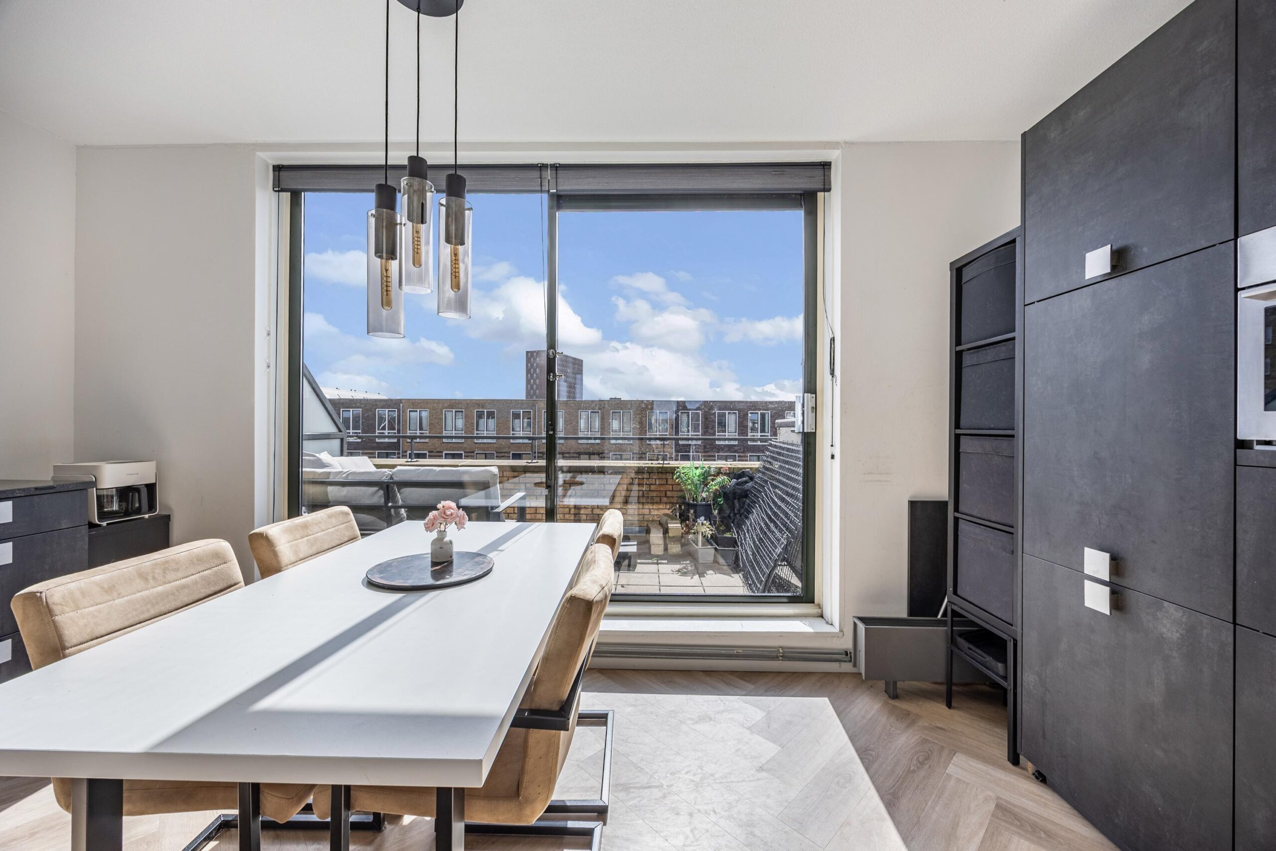 Stap binnen in de ruime en lichte woonkamer, waar de grote raampartijen zorgen voor een prachtige hoeveelheid natuurlijk daglicht en een aangename, open sfeer. Aan de achterzijde vind je de stijlvolle woon-/eetkeuken met directe toegang tot het zonnige dakterras op het zuiden – dé plek om een gezellige zit te creëren en volop te genieten van lange, zonnige dagen.