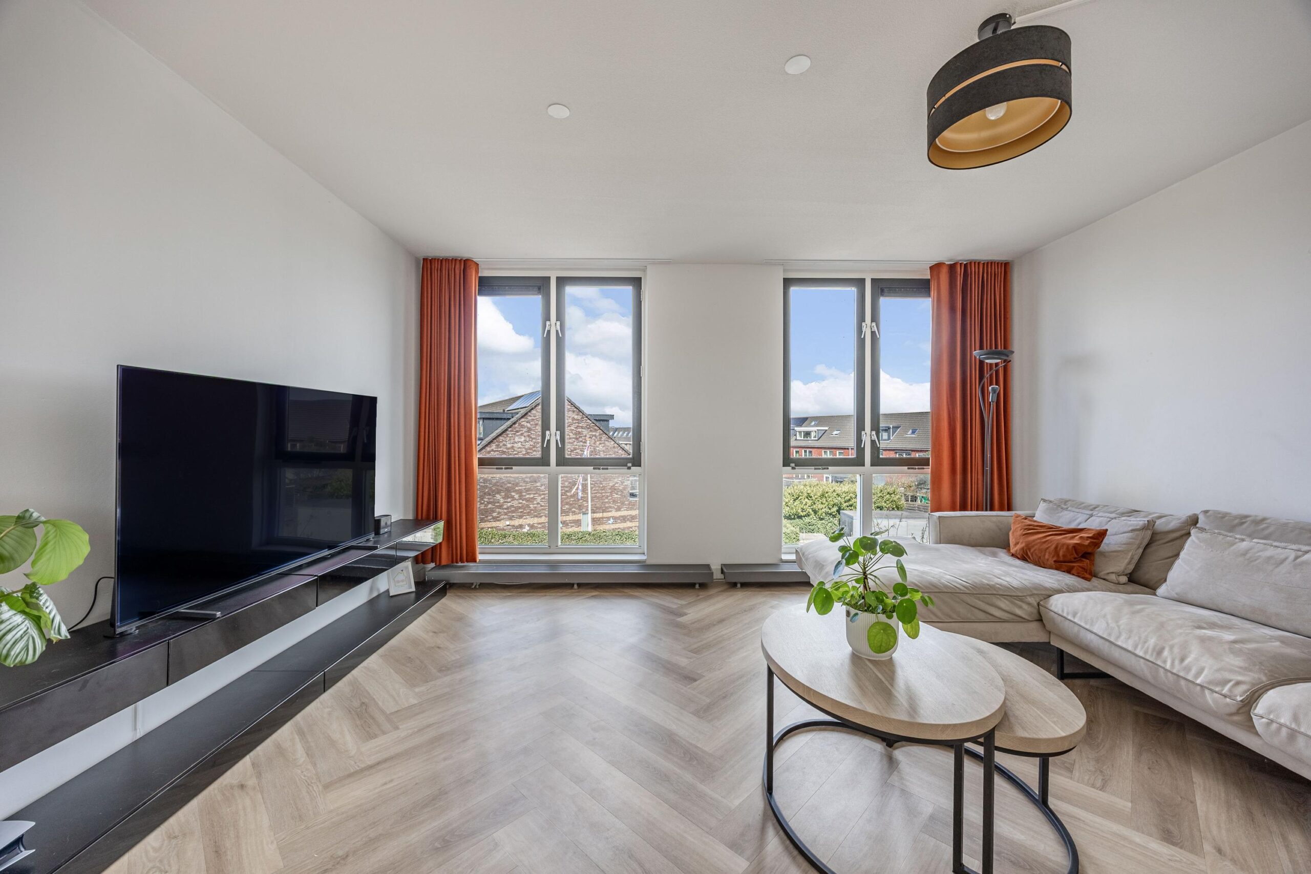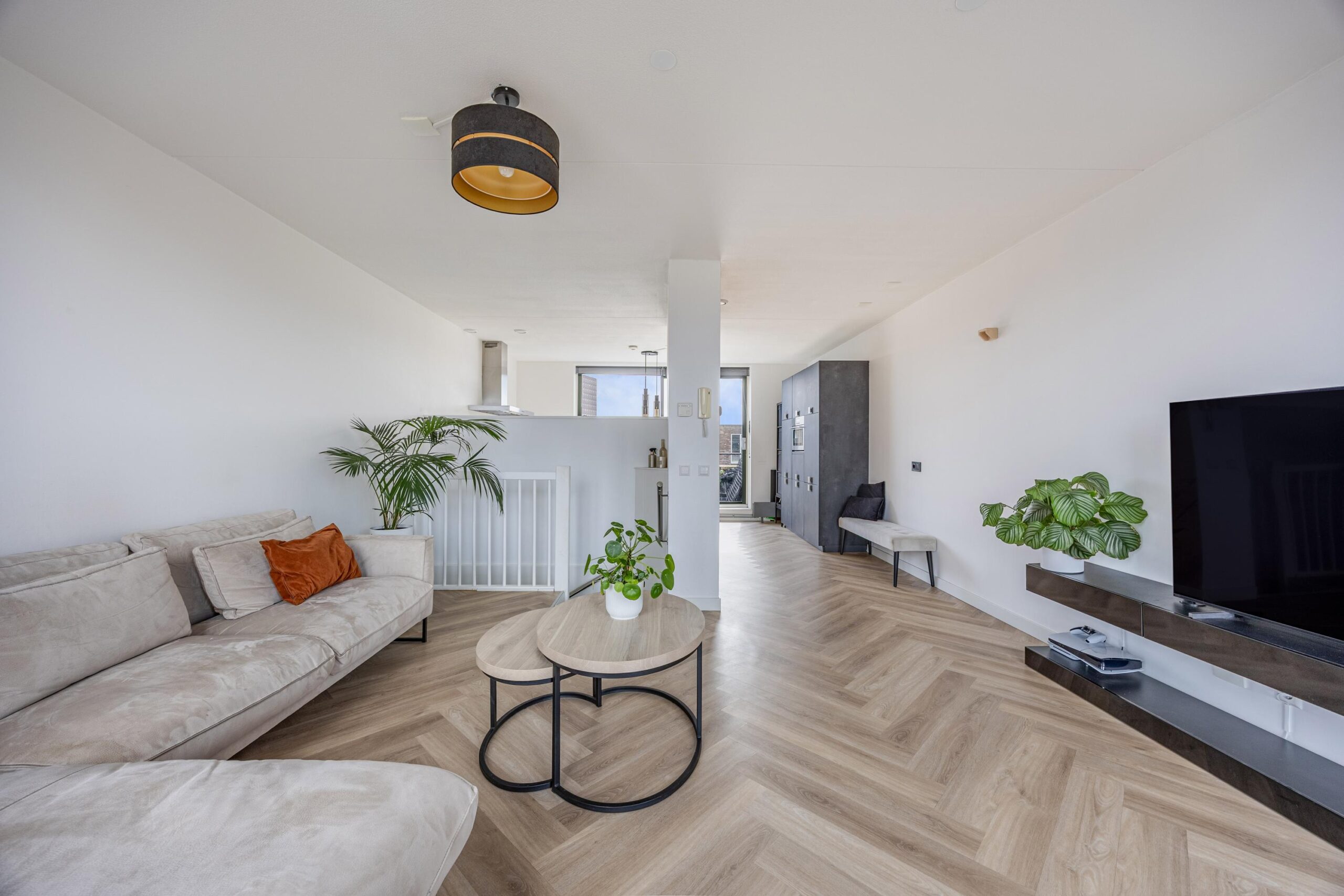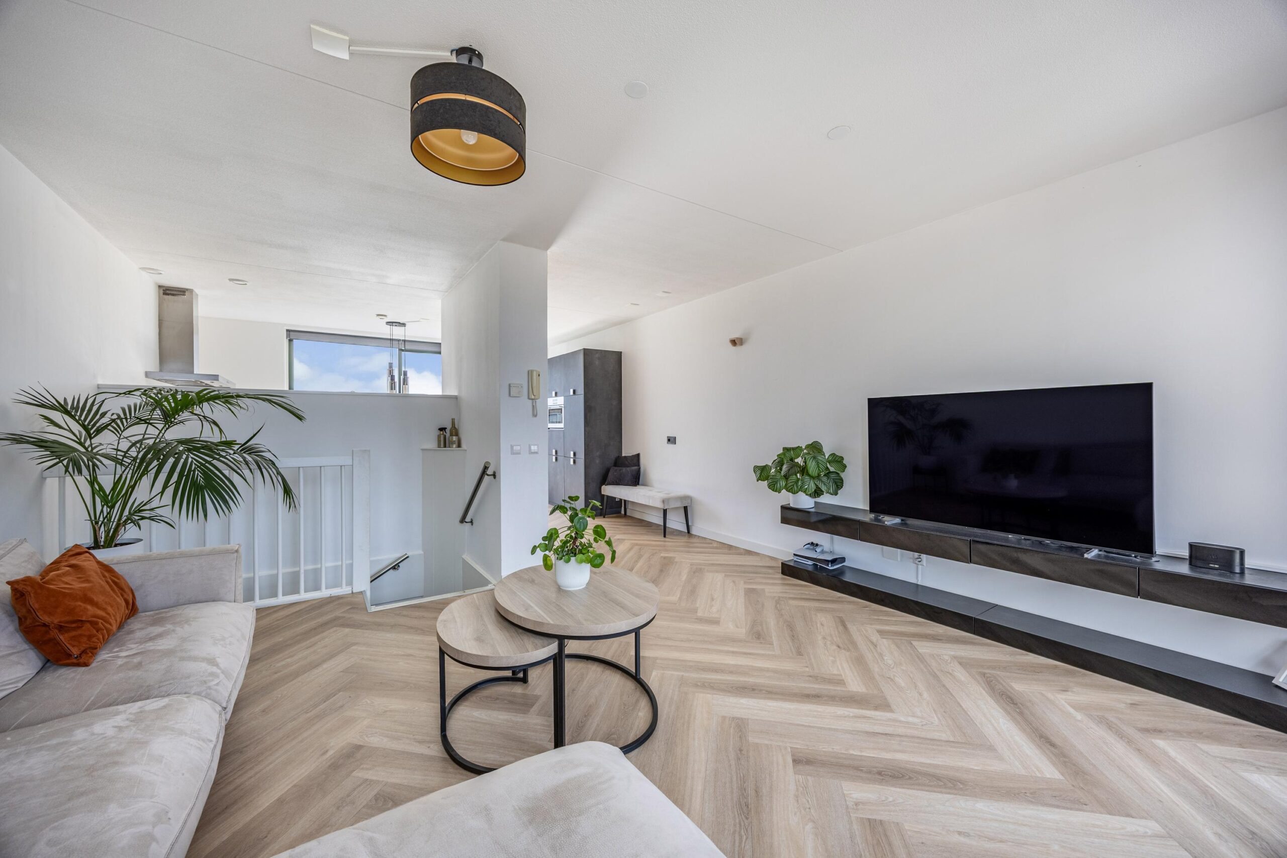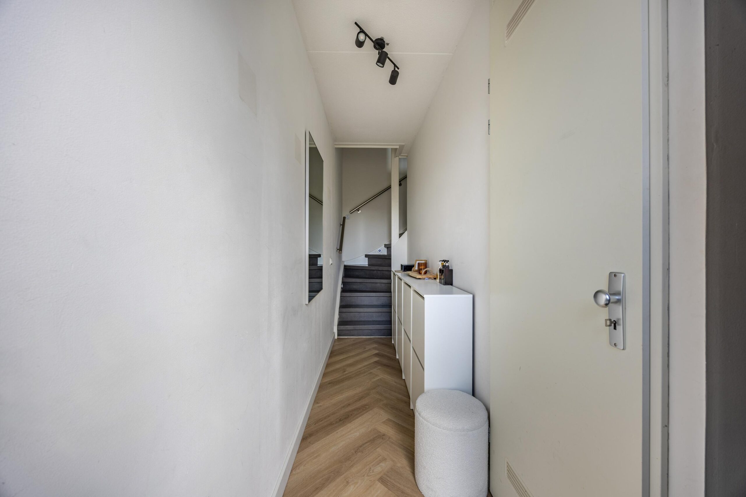 De gehele woning is keurig afgewerkt en voorzien van stijlvolle visgraatvloeren, die zorgen voor een warme, luxe uitstraling en extra sfeer in elke ruimte.