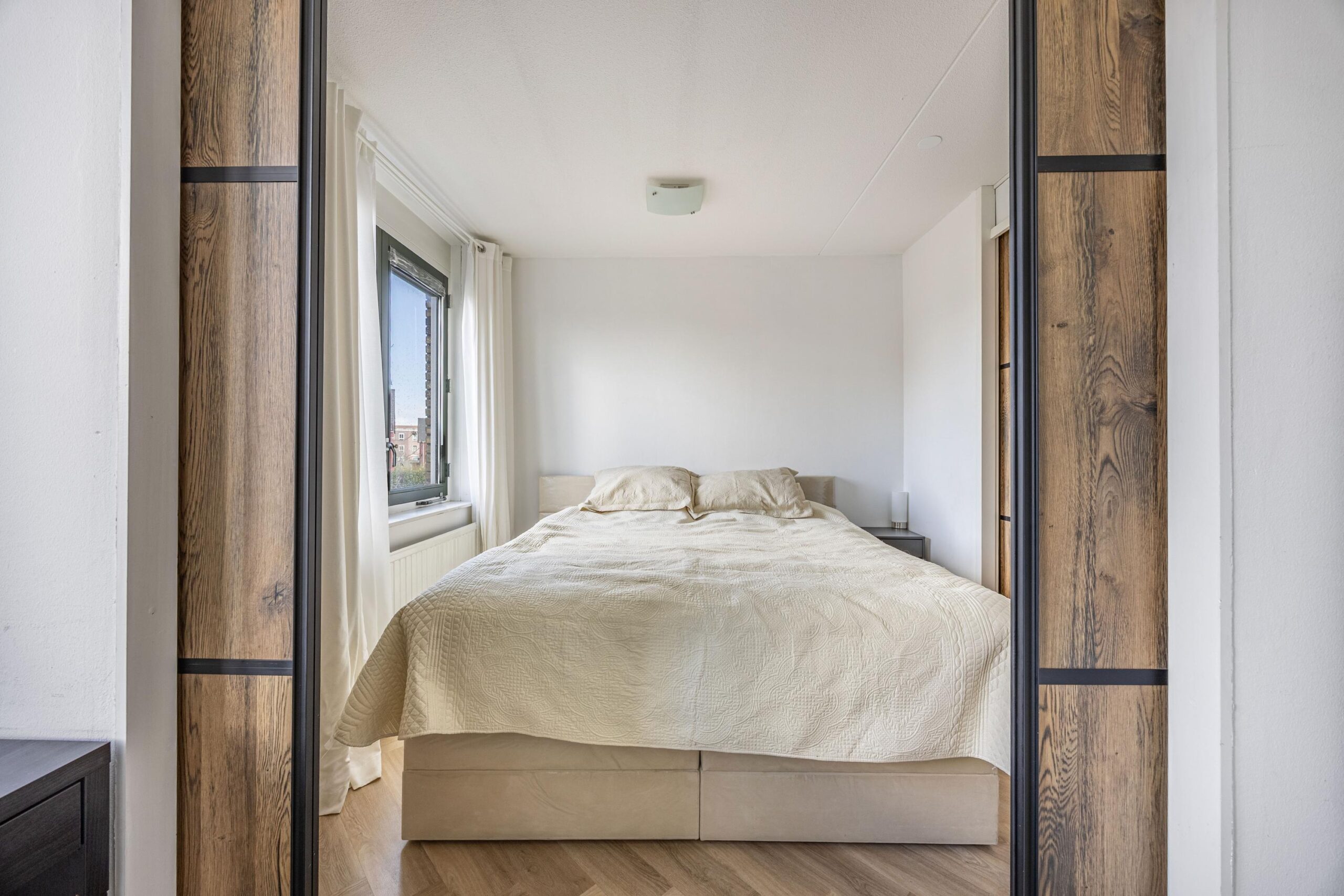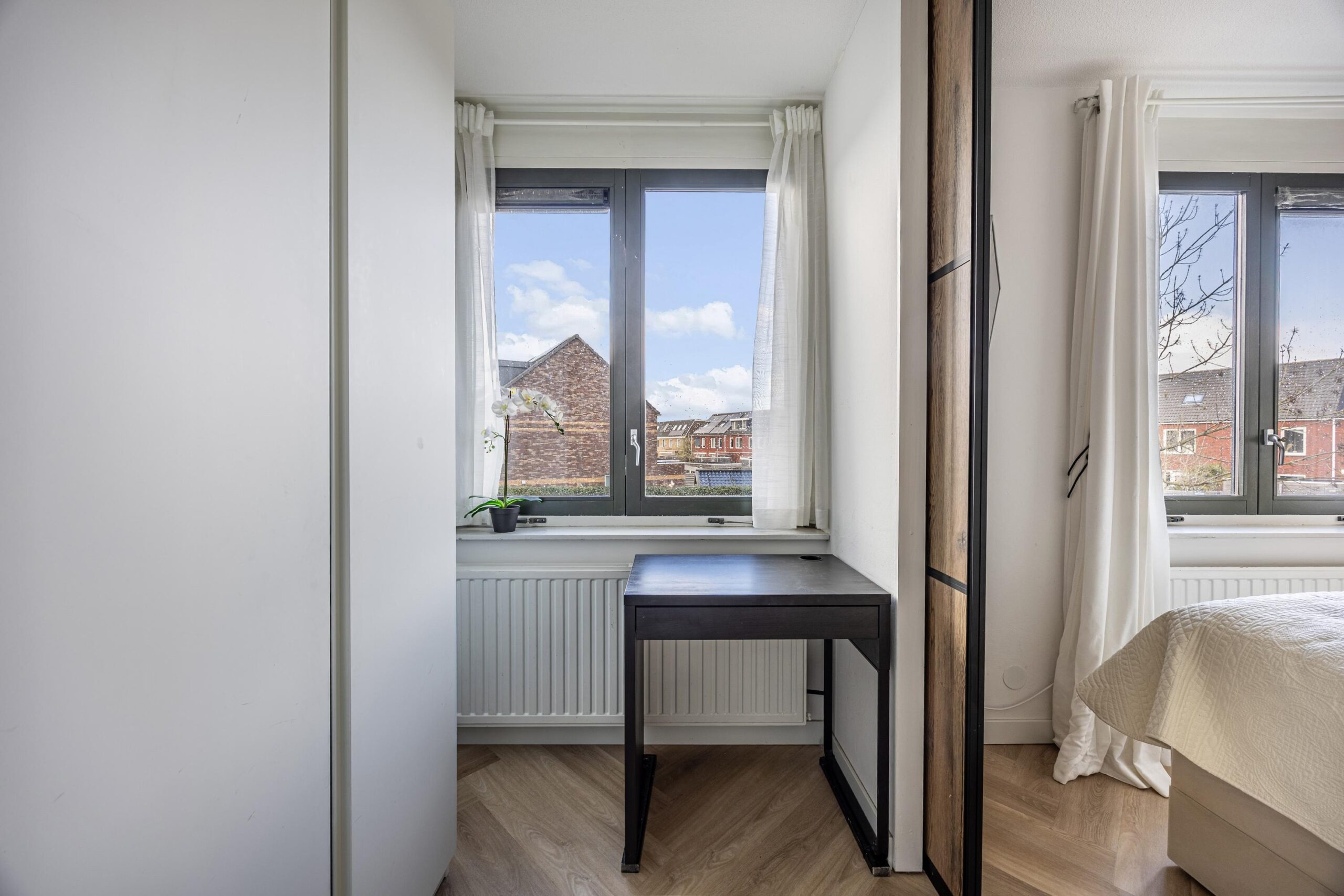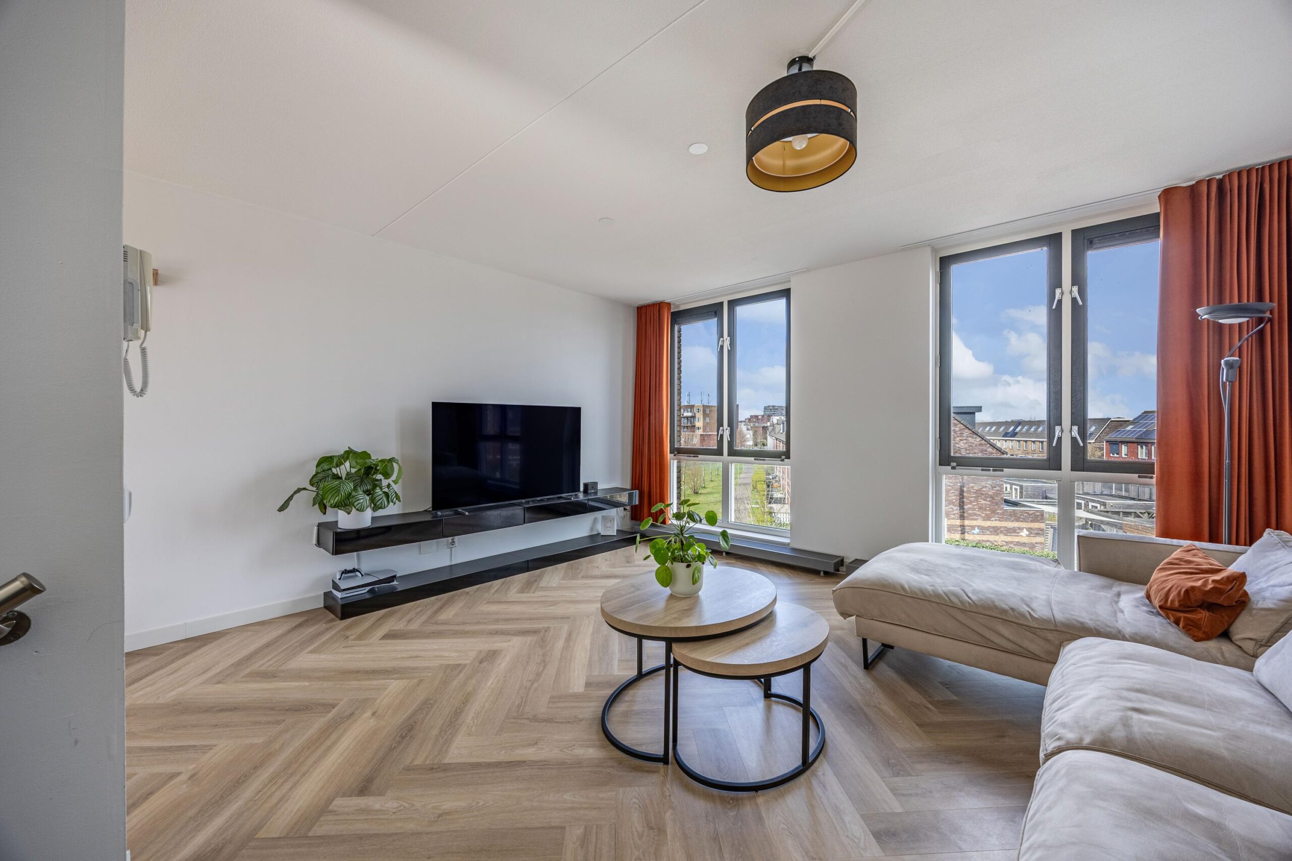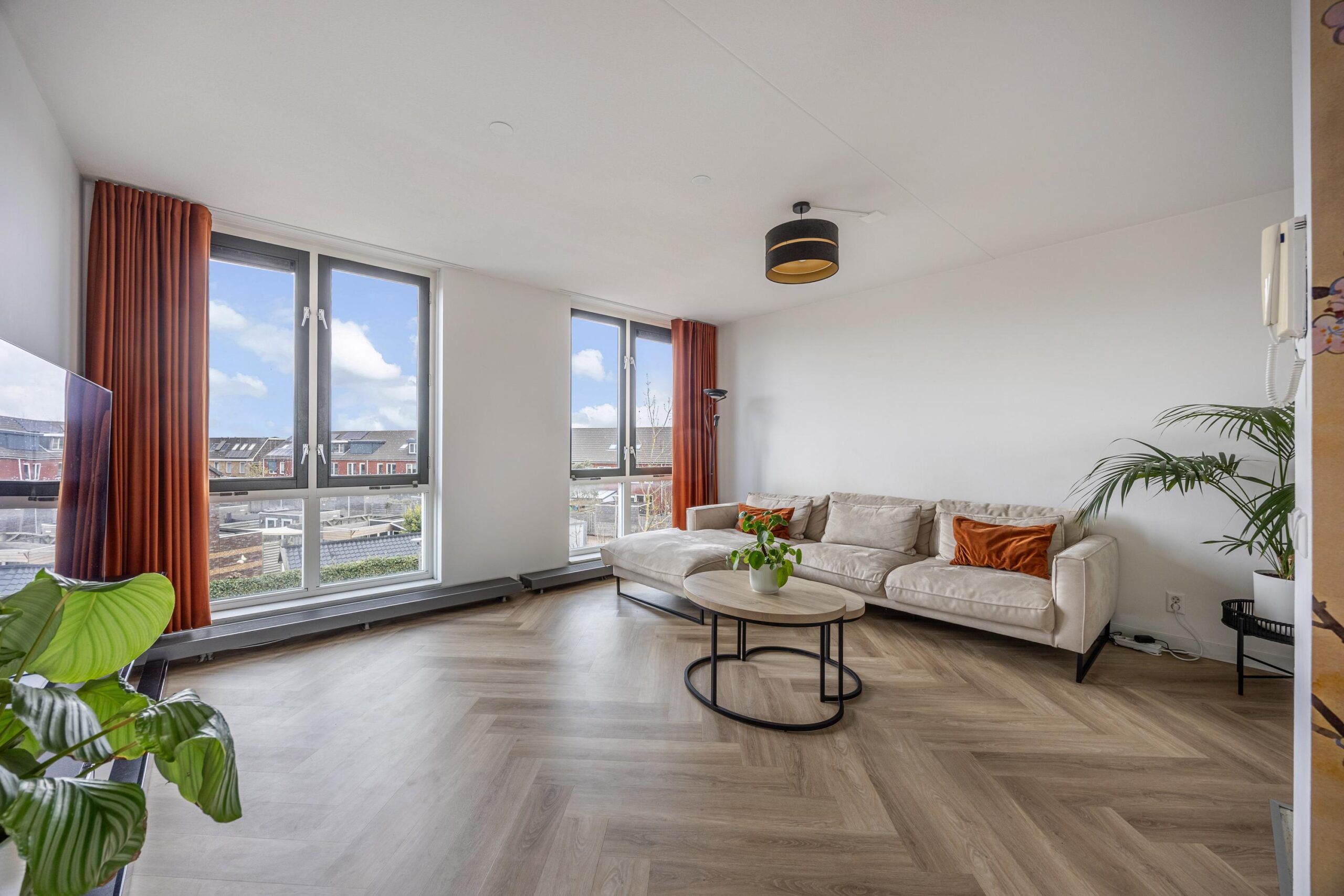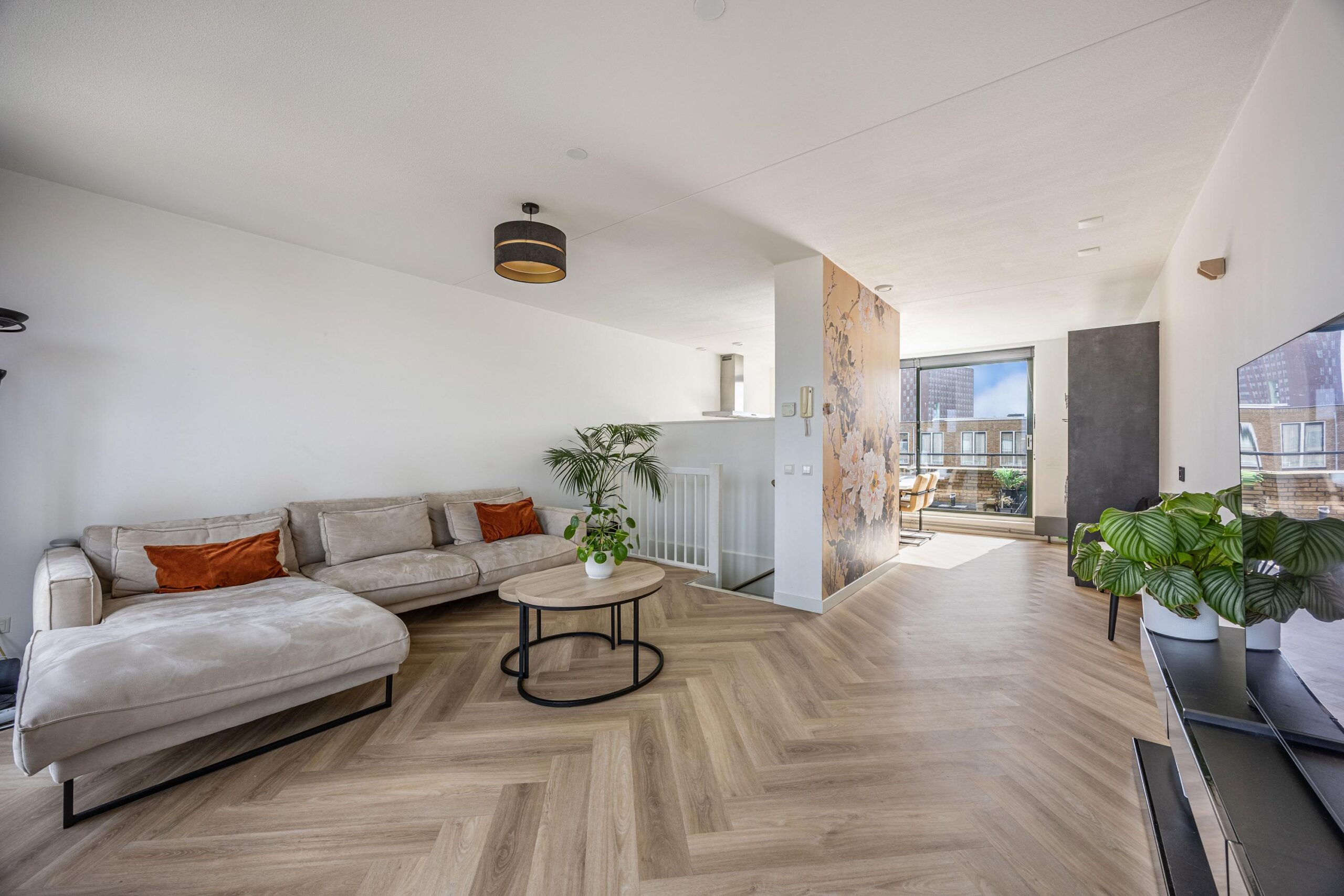 De gehele woning is keurig afgewerkt en voorzien van stijlvolle visgraatvloeren, die zorgen voor een warme, luxe uitstraling en extra sfeer in elke ruimte.