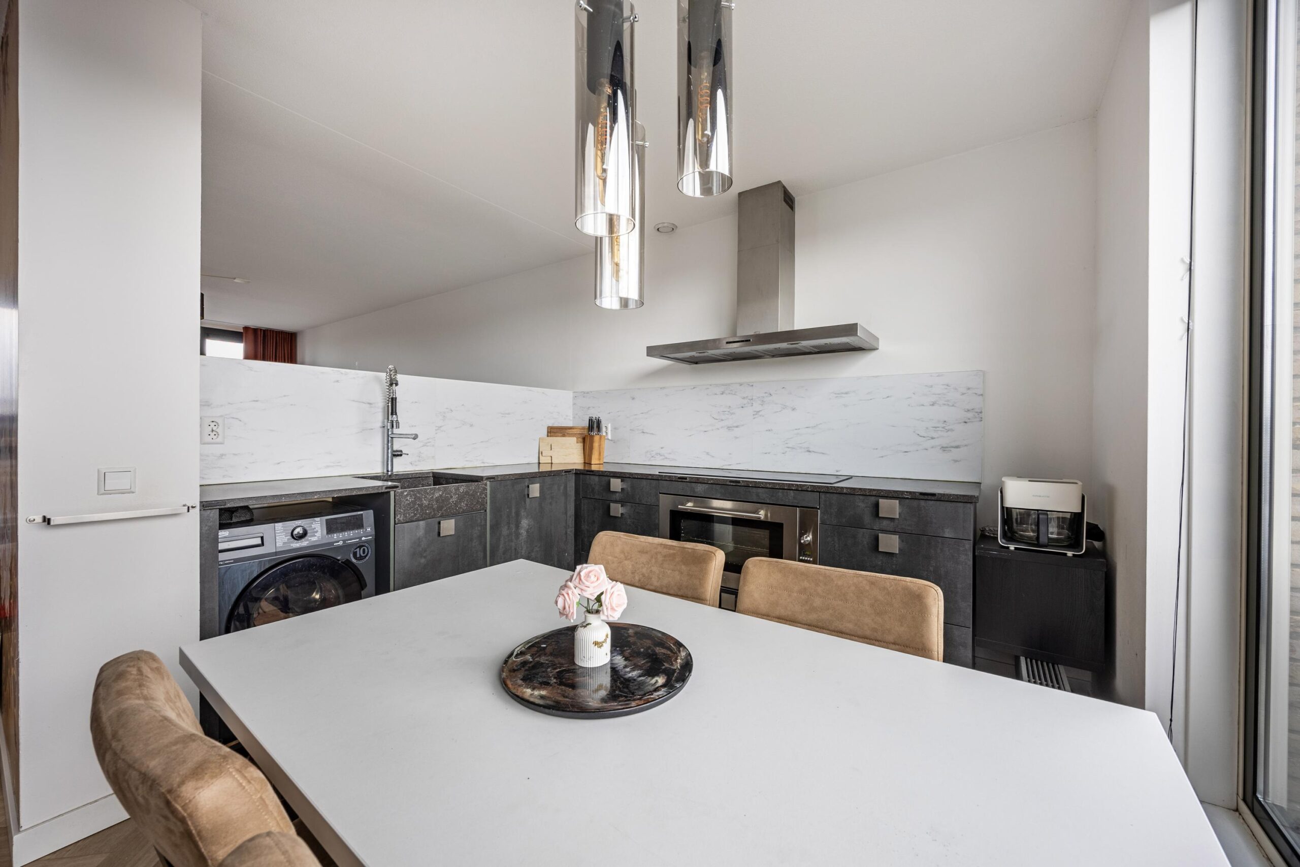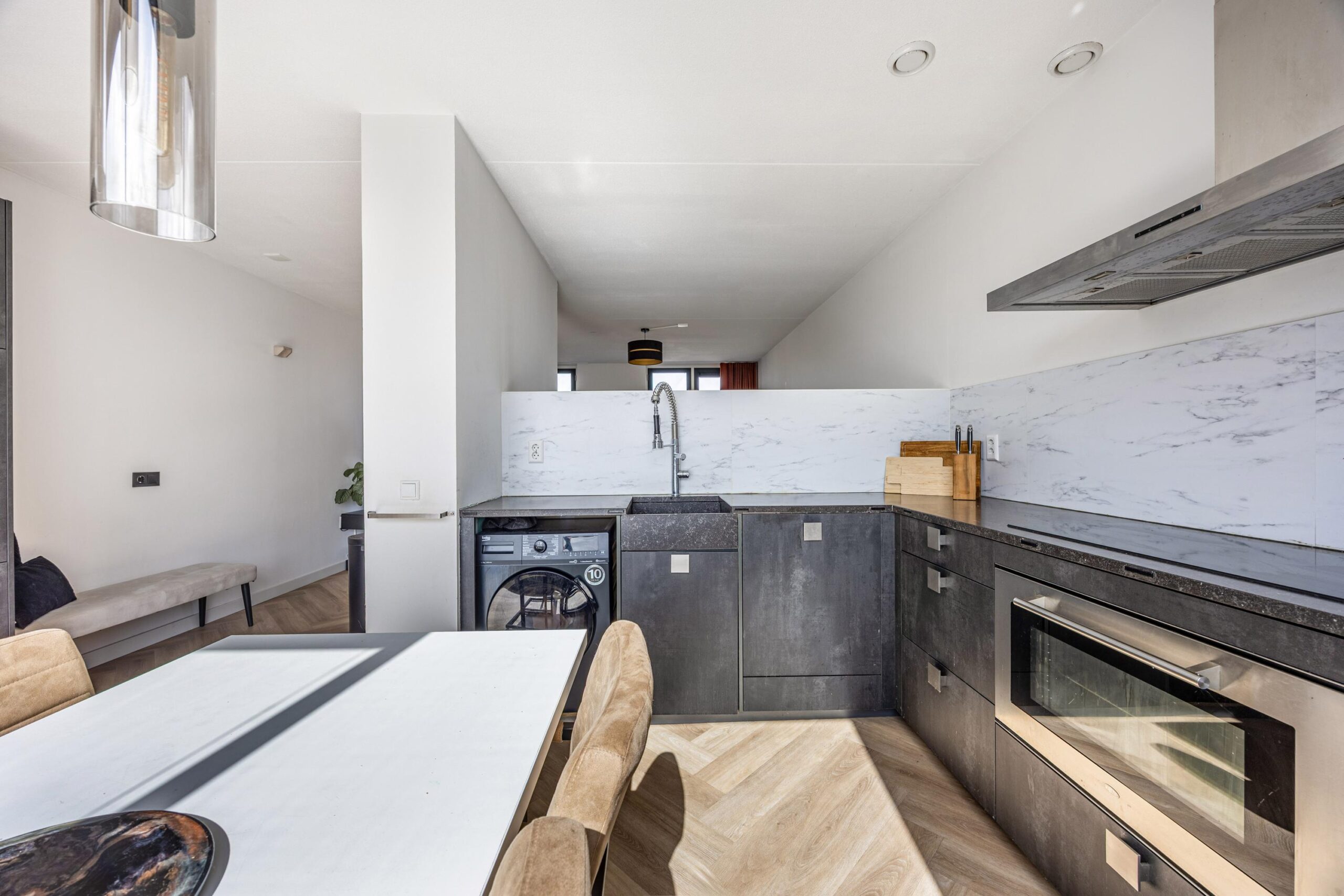 De moderne keuken is afgewerkt met een composieten werkblad en voorzien van diverse inbouwapparatuur. Denk aan een royale inductiekookplaat (2019) met daaronder de oven, een afzuigkap, (combi-)magnetron, koel-/vriescombinatie en vaatwasser. De keukenfronten zijn in 2019 vernieuwd, wat zorgt voor een frisse en eigentijdse uitstraling. Bovendien is de aansluiting voor de wasmachine netjes weggewerkt in één van de keukenkasten.