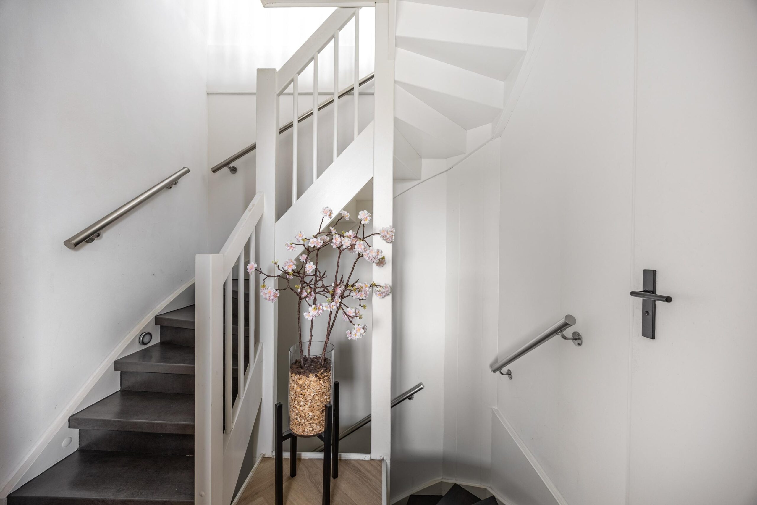 Verzorgde entree met meterkast en trapopgang, die direct een nette eerste indruk geeft. Achter het complex beschik je over een eigen parkeerplaats én een praktische berging – ideaal voor extra opslag en het stallen van bijvoorbeeld fietsen.