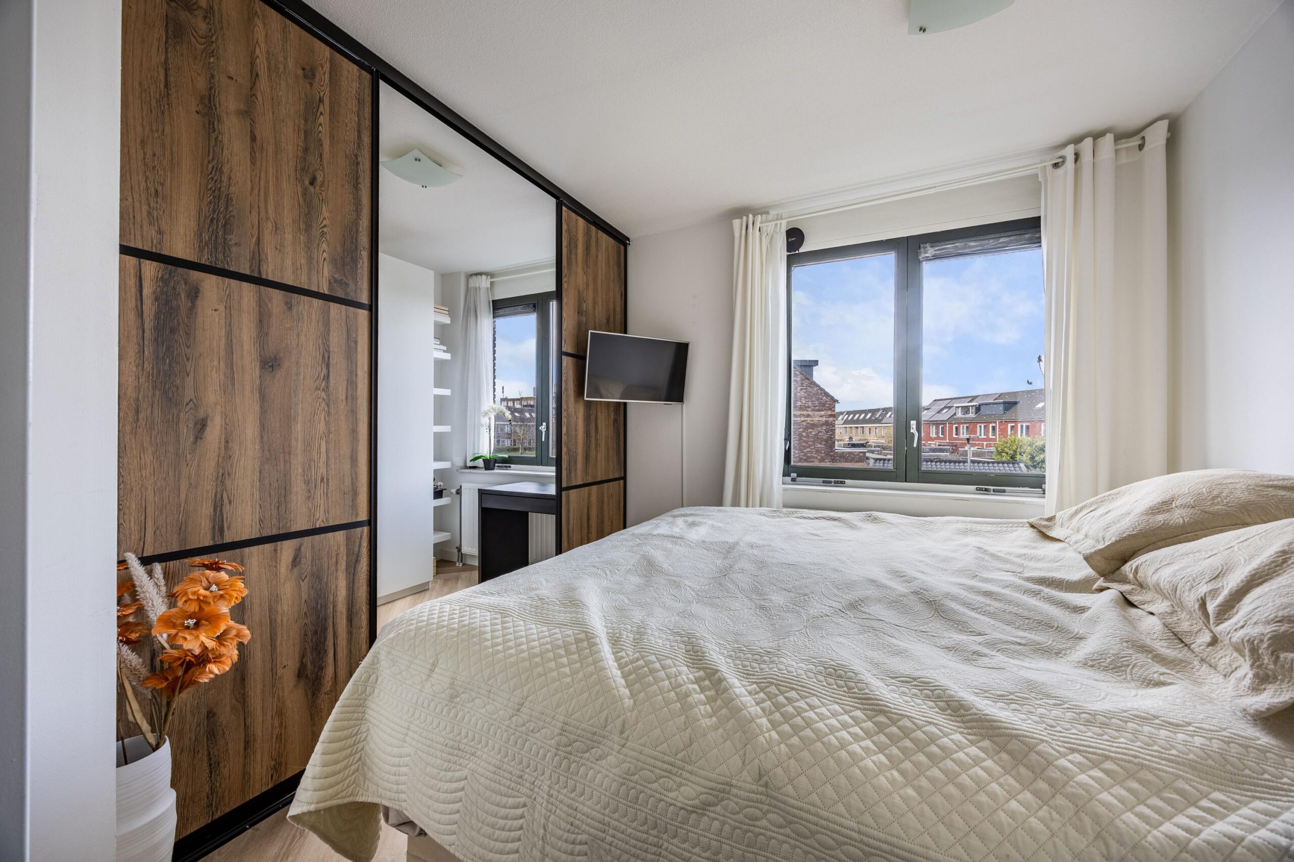 Overloop met toegang tot een royale slaapkamer en de moderne badkamer. De slaapkamer aan de voorzijde is slim ingedeeld en voorzien van schuifdeuren, waardoor een praktische en stijlvolle inloopkast is gecreëerd. De gehele verdieping is netjes afgewerkt en straalt rust en comfort uit.