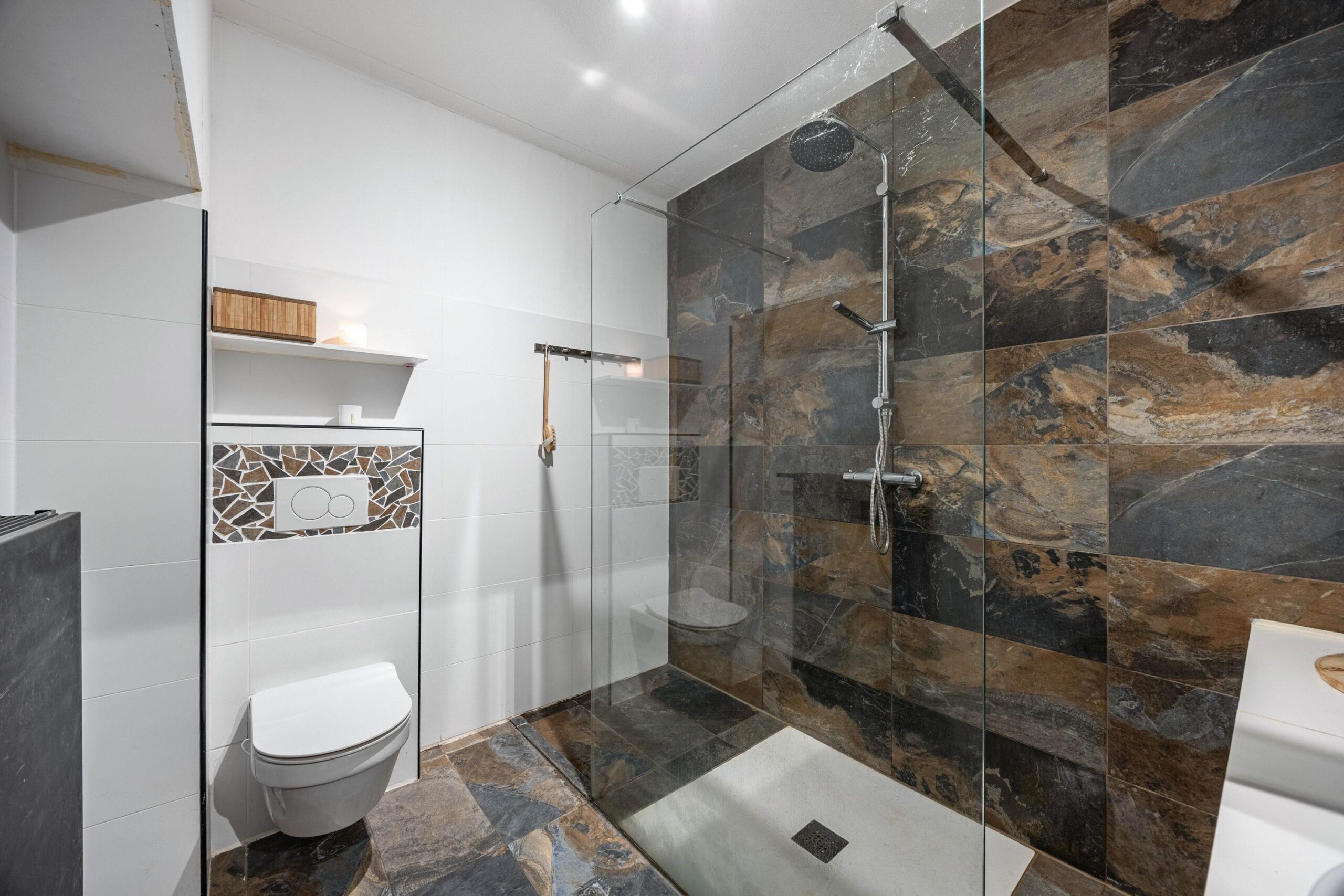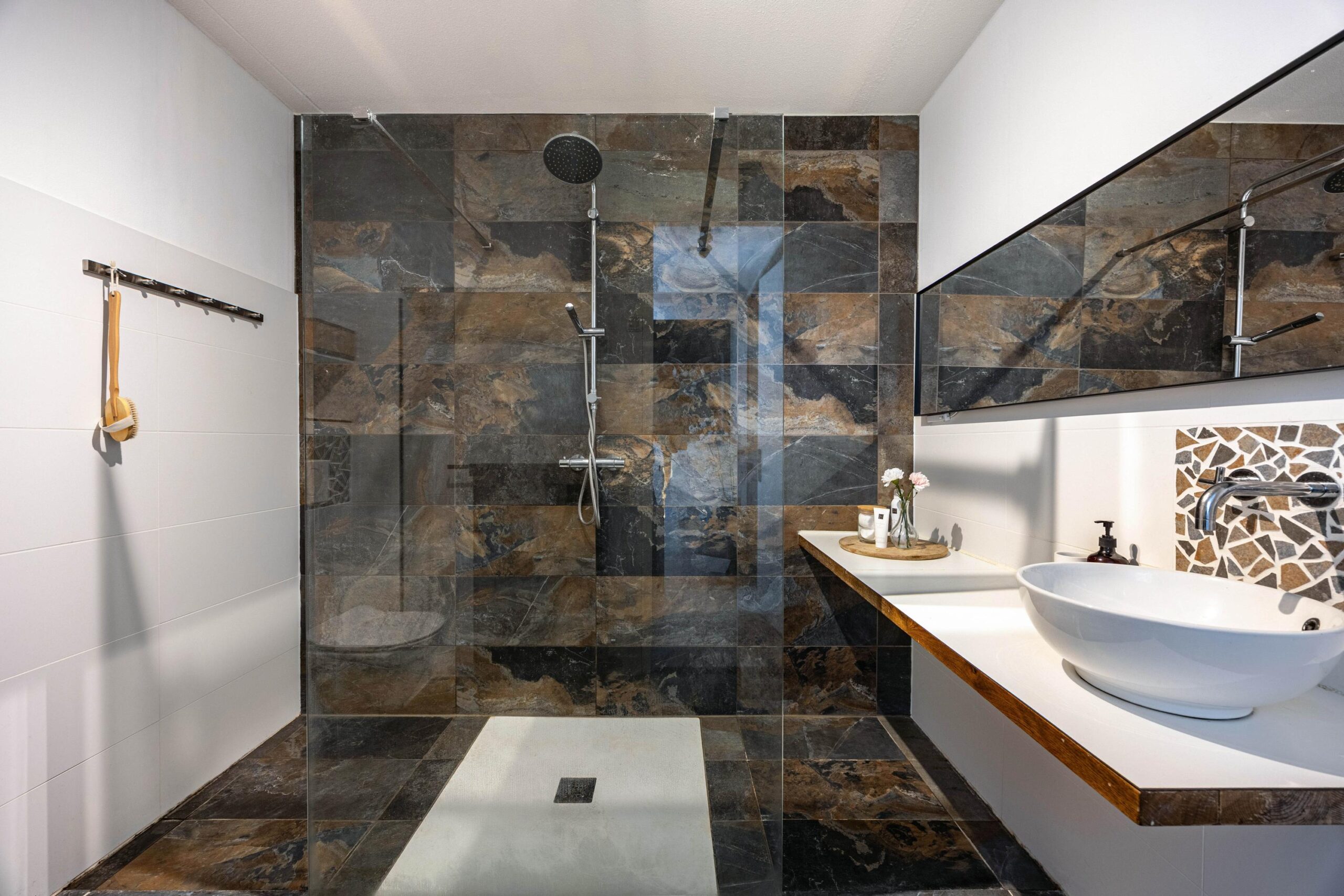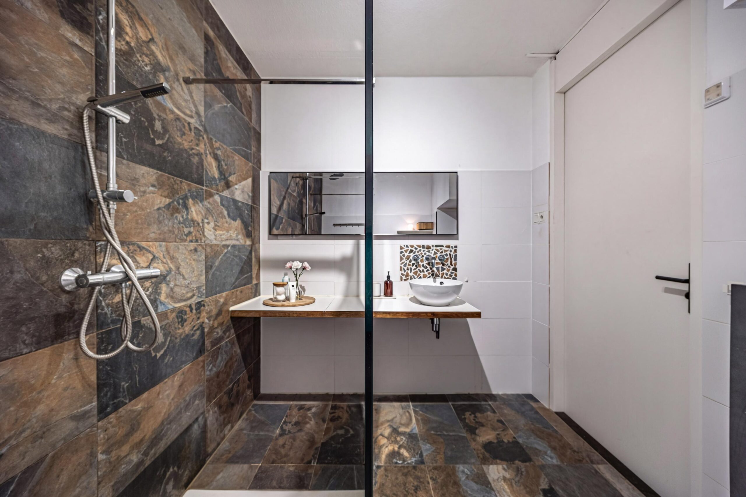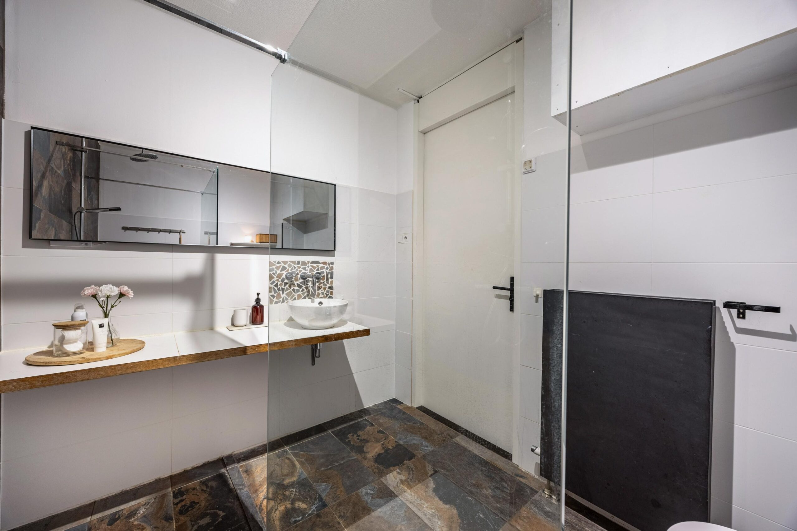 De badkamer is een echte eyecatcher: modern, ruim en in 2018 vergroot en volledig vernieuwd. Centraal bevindt zich de royale inloopdouche, aangevuld met een strak wastafelmeubel en een vrijhangend toilet. De combinatie van bijzondere vloertegels en deels betegelde wanden zorgt voor een luxe en stijlvolle uitstraling. Het frisse witte tegelwerk is bovendien in 2021 vernieuwd, wat het geheel een eigentijdse en verzorgde look geeft.