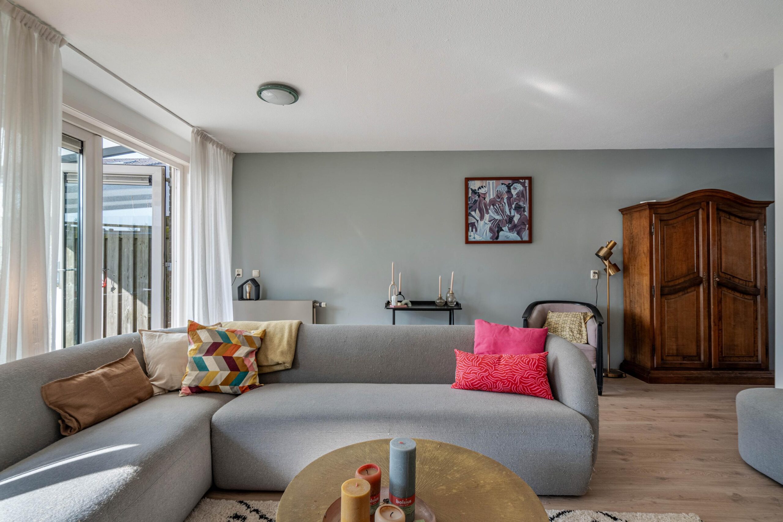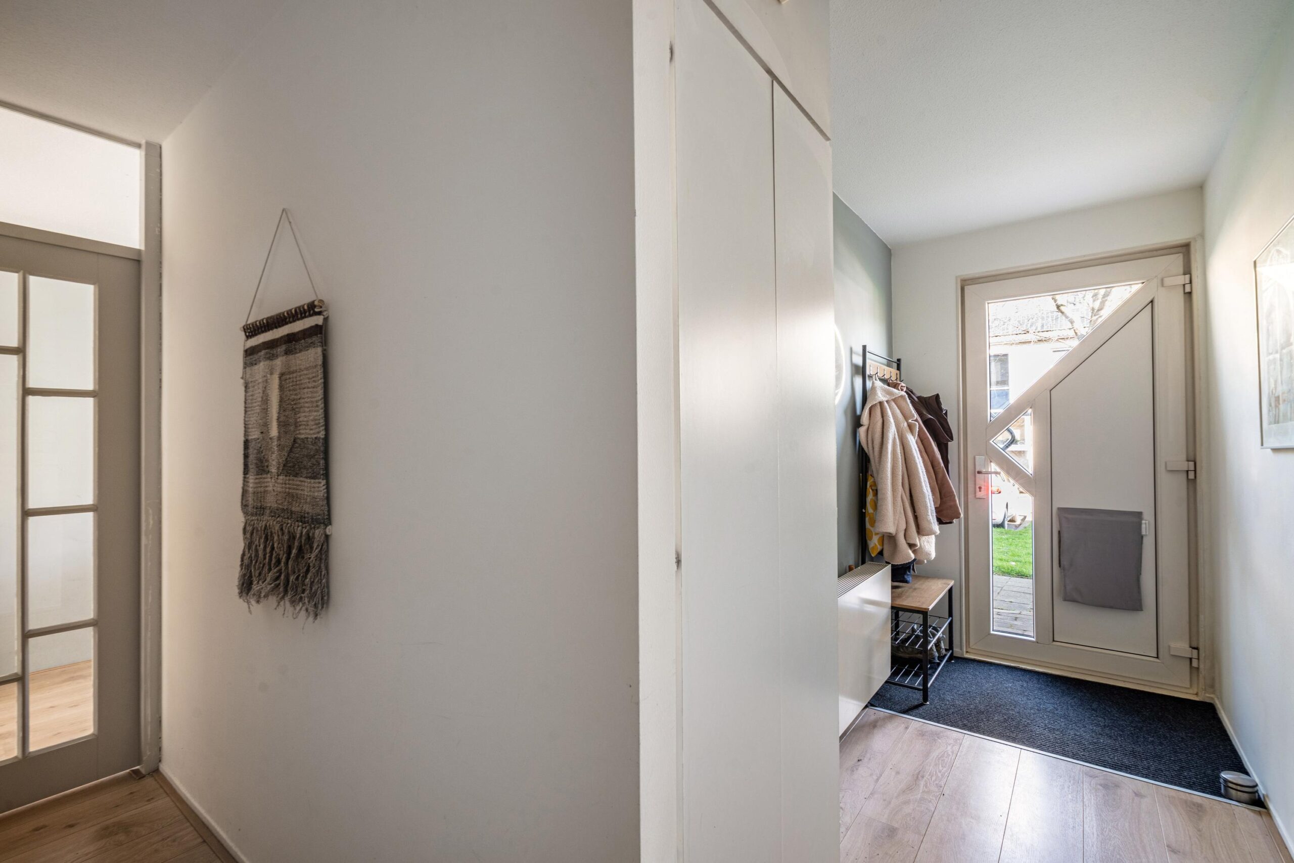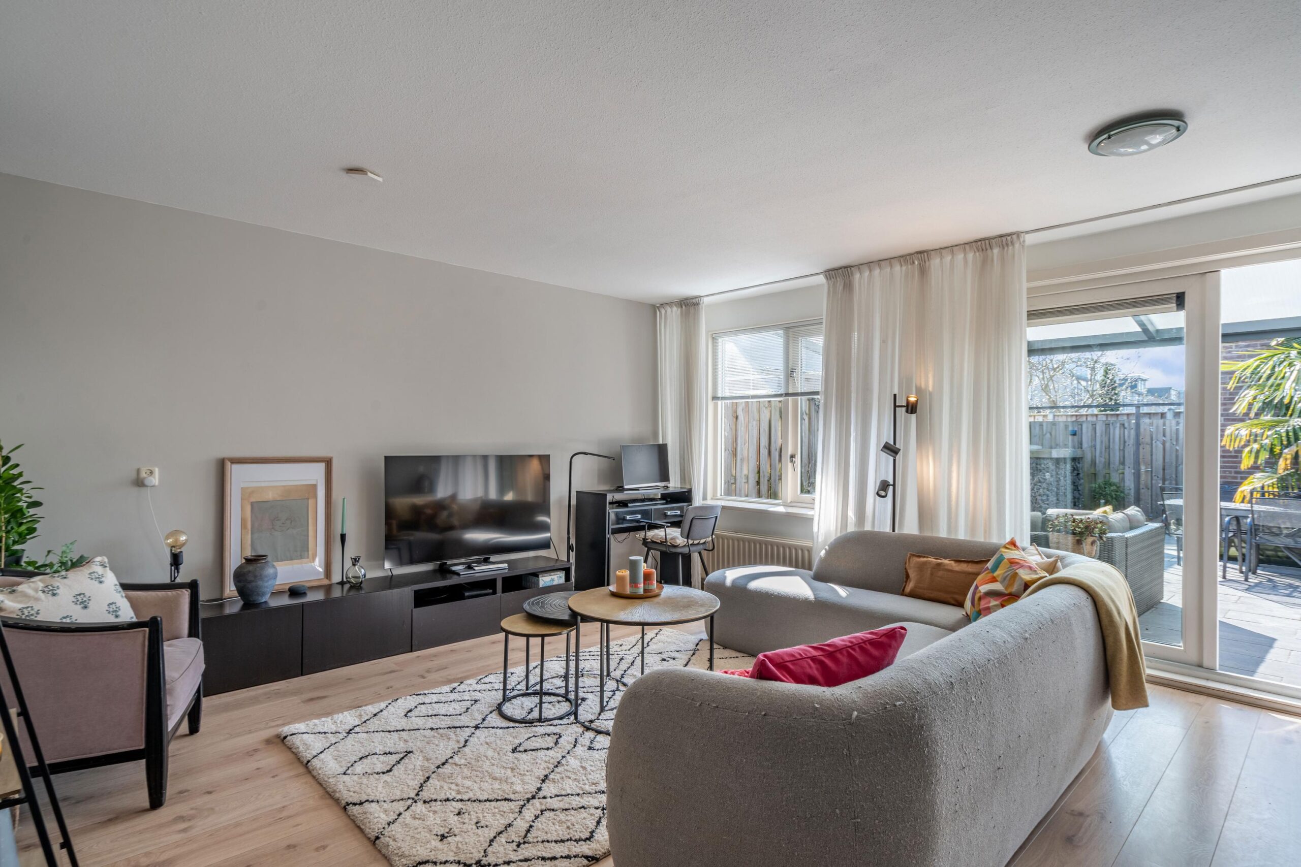 In de hal vindt u ruimte voor jassen en schoenen, de meterkast (met o.a. glasvezelaansluiting), het toilet met fonteintje en de trapopgang naar de eerste verdieping. Vanuit de hal bereikt u de ruime woonkamer via een glazen tussendeur, welke is gesitueerd aan de achterzijde van de woning. Er is voldoende ruimte voor het plaatsen van een ruime zithoek. De wanden zijn keurig gladgestuukte en er is een nette laminaatvloer aanwezig. Vanuit de woonkamer bereikt u middels de openslaande deuren (2006, HR++) de zonnige achtertuin.