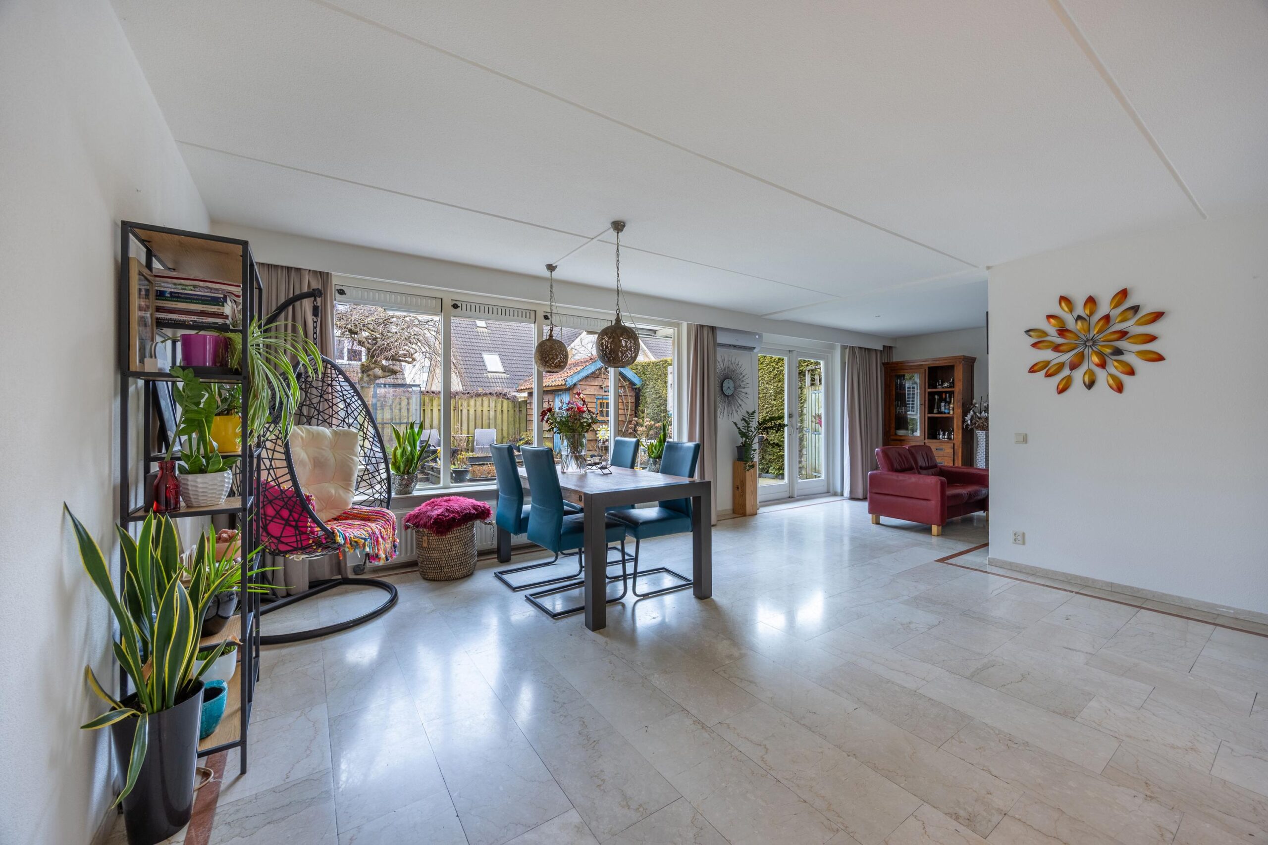 Aan de achterzijde bevindt zich de ruime woonkamer met grote raampartijen en een airco voor een comfortabel binnenklimaat. Er is voldoende ruimte voor zowel een gezellige eethoek als een royale zithoek. Via de tuindeur bereikt u de achtertuin.