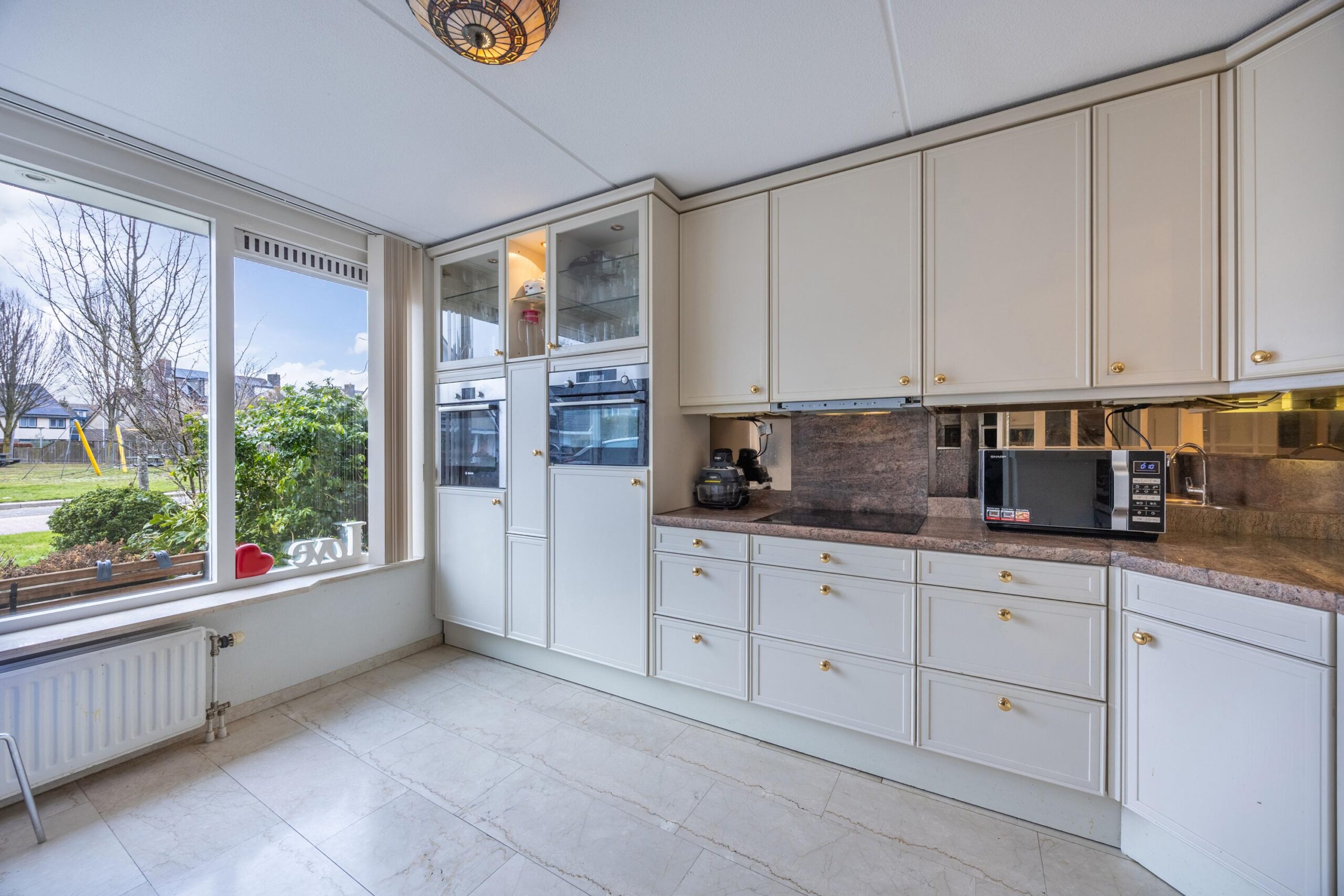 De keuken ligt aan de voorzijde en heeft inbouwapparatuur waarvan het merendeel in 2022/2023 is vernieuwd. De keuken beschikt over een vaatwasser, oven, combi-magnetron, inductiekookplaat met afzuigkap naar buiten, en een koelkast. Daarnaast is er een losstaande Amerikaanse koelkast met vriezer aanwezig.