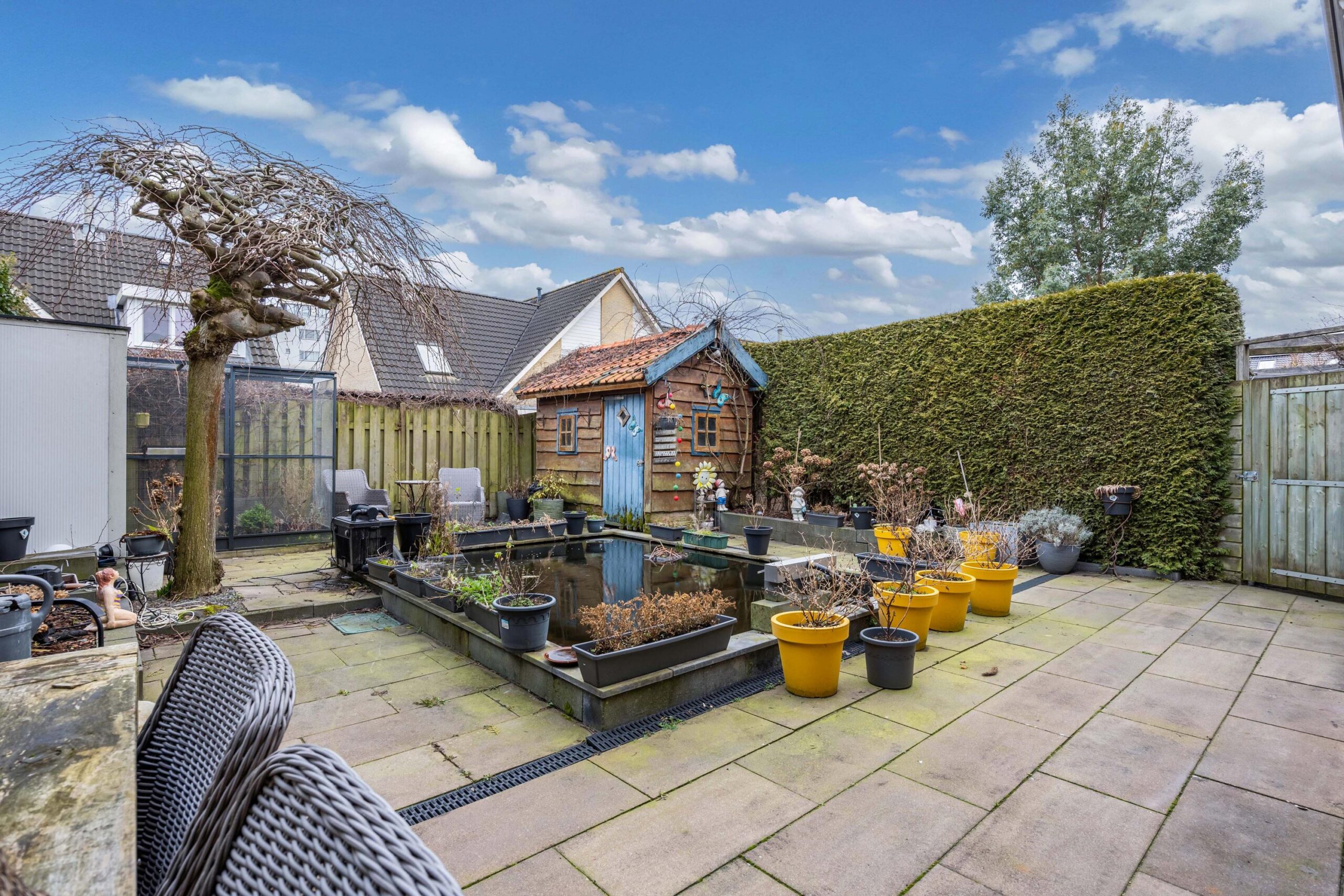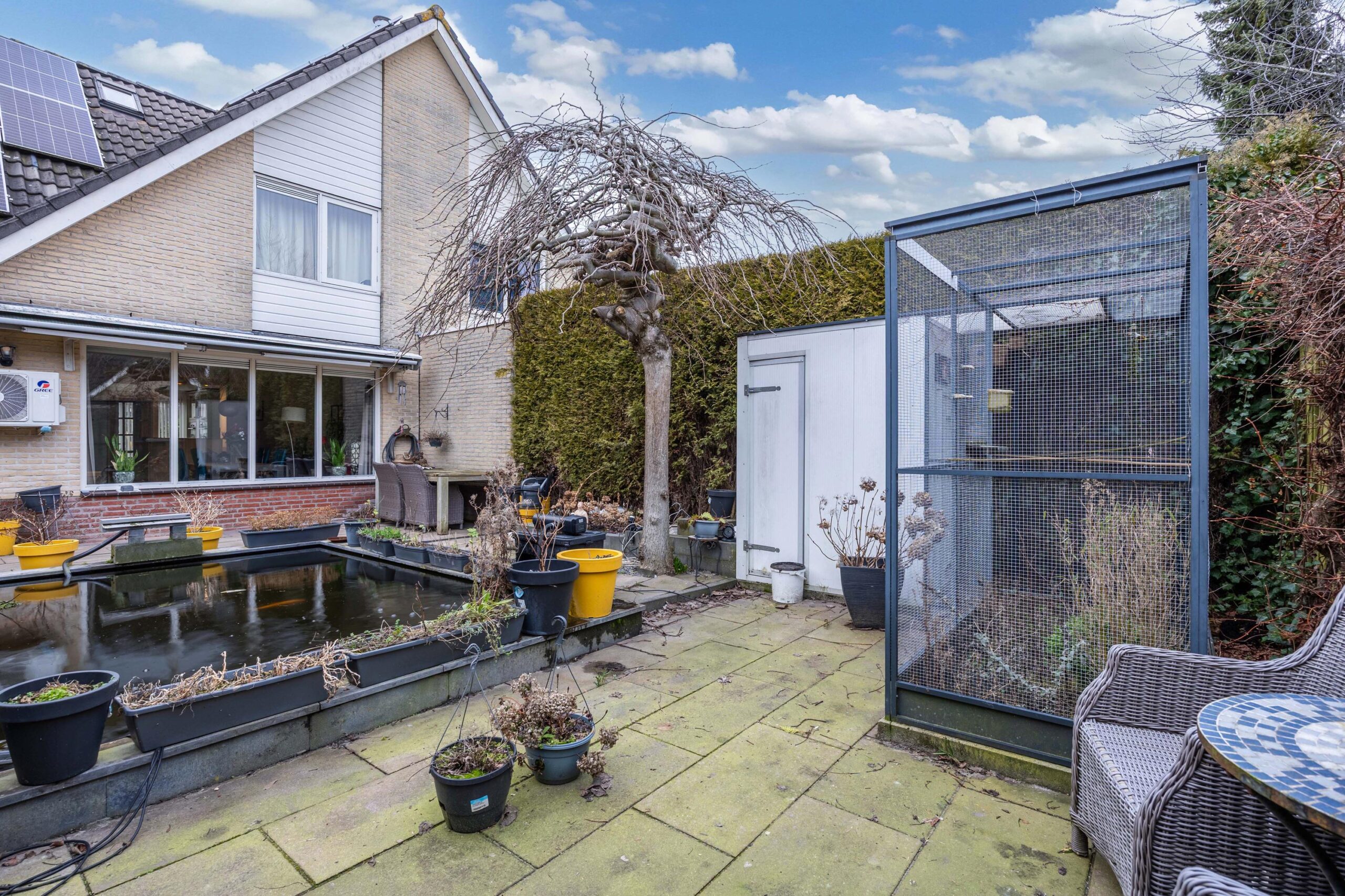 - Zonnige tuin met vijver, berging, zonnescherm (nieuw doek) en buitenkraan;