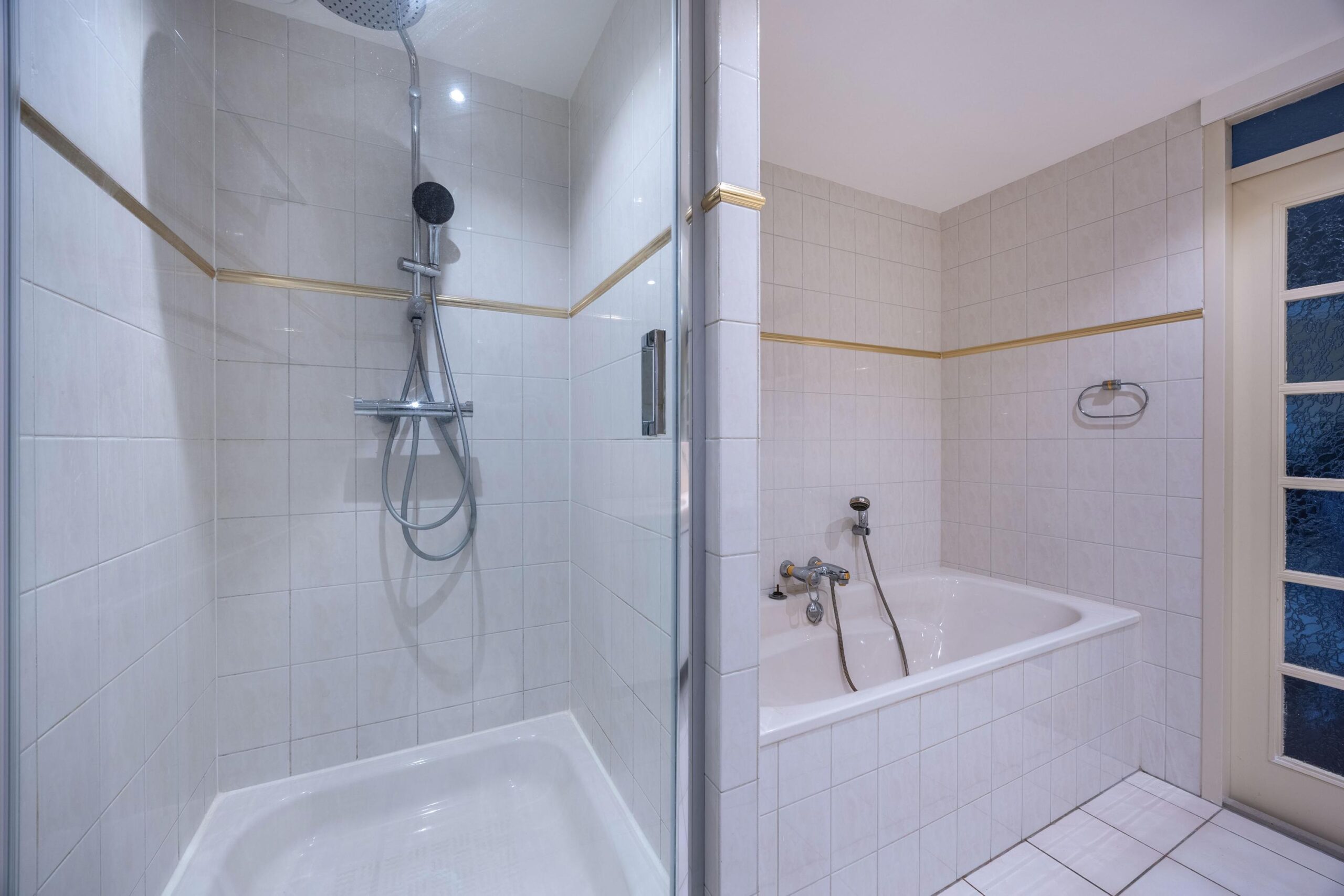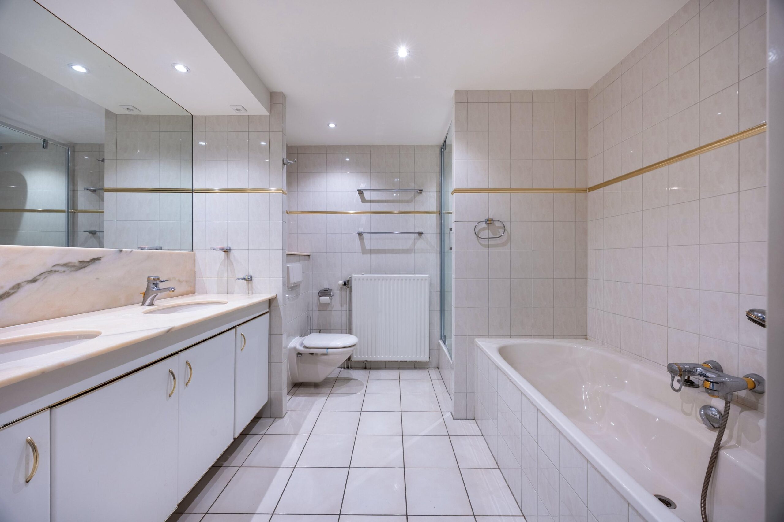 De ruime, inpandige badkamer is voorzien van een dubbele wastafel in een groot meubel met kastruimte, een spiegelwand, een ligbad, een tweede toilet en een douchehoek met vernieuwde hand- en regendouche.