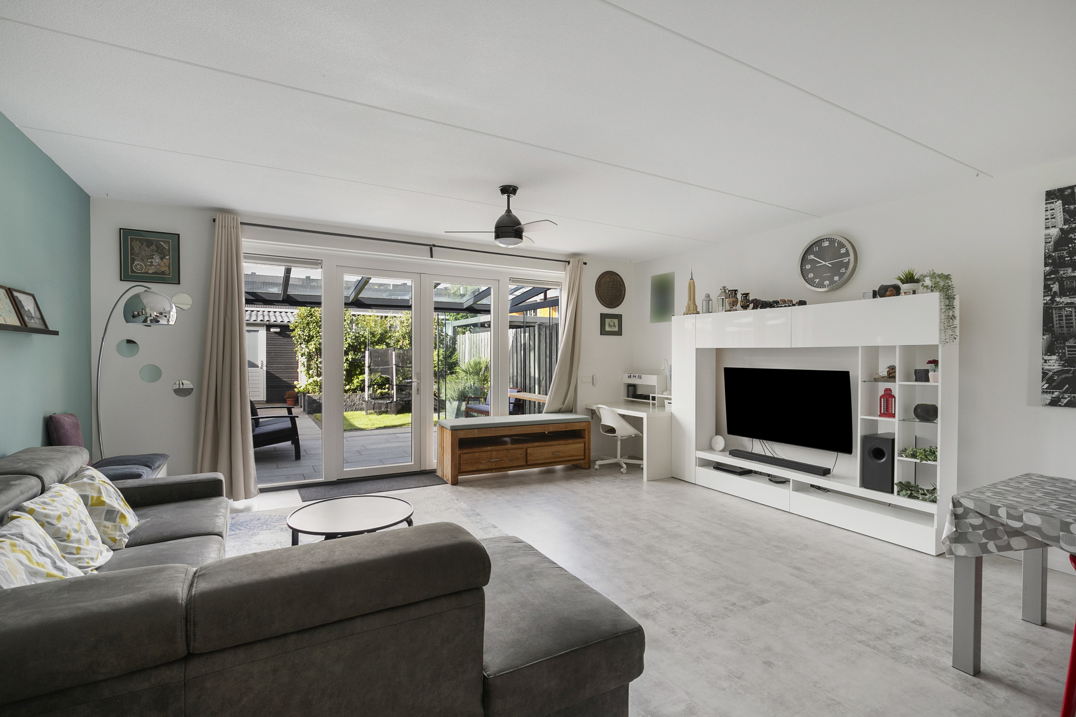 De woonkamer is gelegen aan de achterzijde van de woning. De woonkamer is zeer breed en heeft veel lichtinval door de raampartijen aan de achterzijde. Er is voldoende ruimte voor het plaatsen van een grote zit-/ en eethoek. Vanuit de woonkamer bereikt u middels de openslaande deuren de achtertuin. De begane grond is voorzien van een mooie PVC vloer met vloerverwarming.