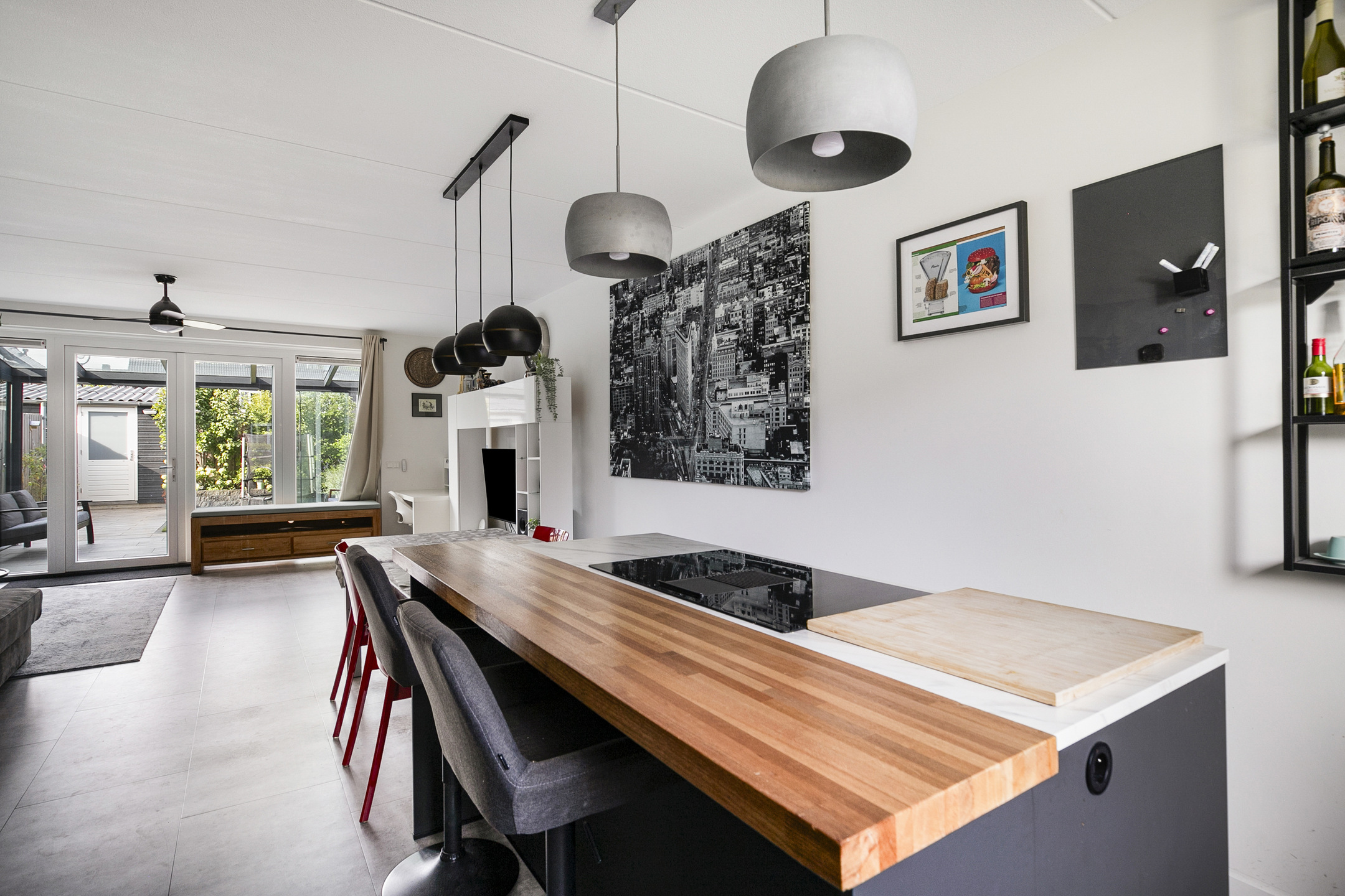 U betreedt de woning via de voortuin. Via de entree komt u uit in de hal met meterkast, toilet met fonteintje, bergkast met de verdeler voor de vloerverwarming en de trapopgang naar de eerste verdieping. Vanuit de hal heeft u toegang tot de moderne open keuken gelegen aan de voorzijde van de woning en de ruime woonkamer aan de achterzijde. De keuken is geplaatst in een hoekopstelling en kookeiland en is voorzien van een kunststof werkblad. Het kookeiland beschikt over een inductiekookplaat met geïntrigeerde afzuiging en ruimte voor een bar, daarnaast zijn er diverse stopcontacten voor het gebruik van keukenapparatuur. In de vaste kasten is er inbouwapparatuur waaronder de vaatwasser, oven, combi-magnetron, koelkast en een vriezer.