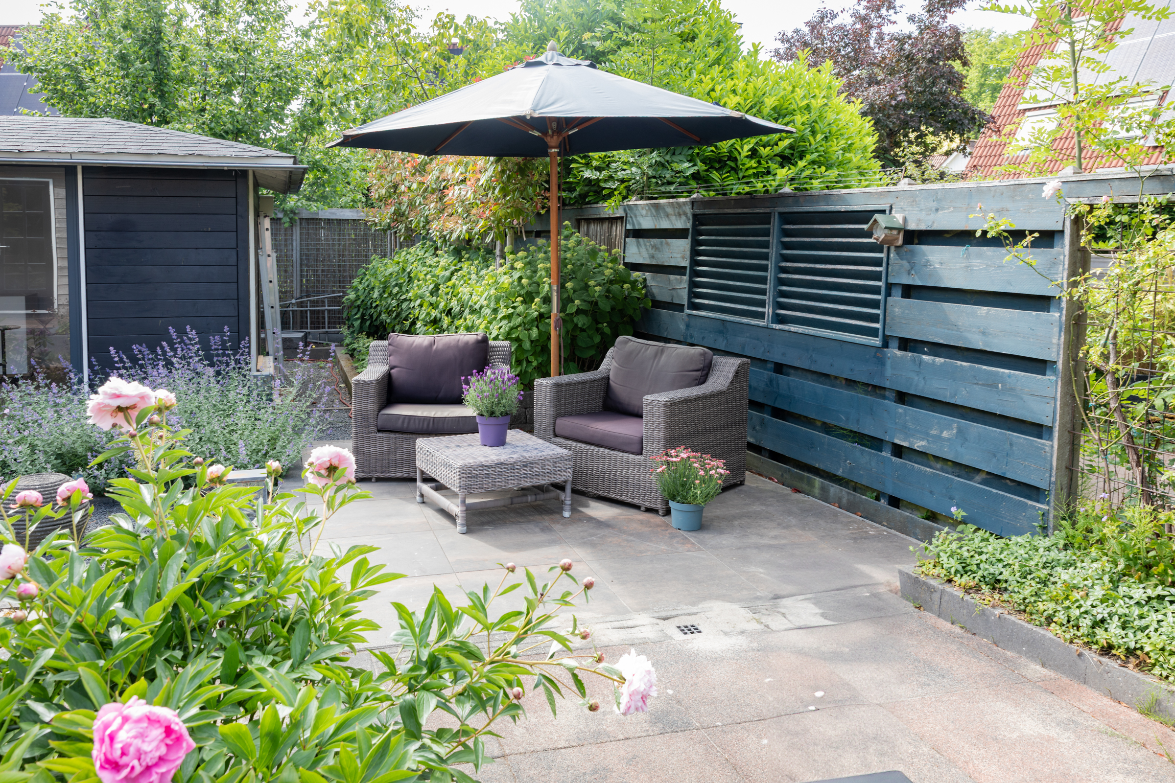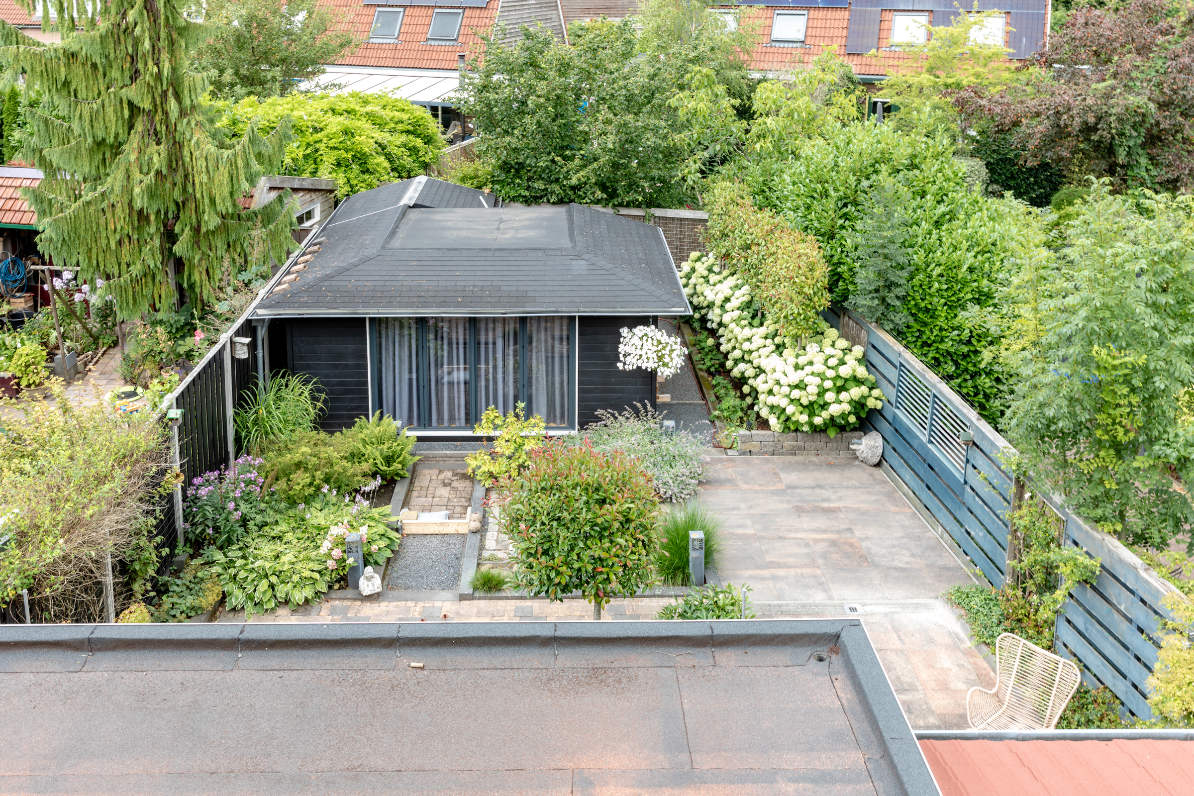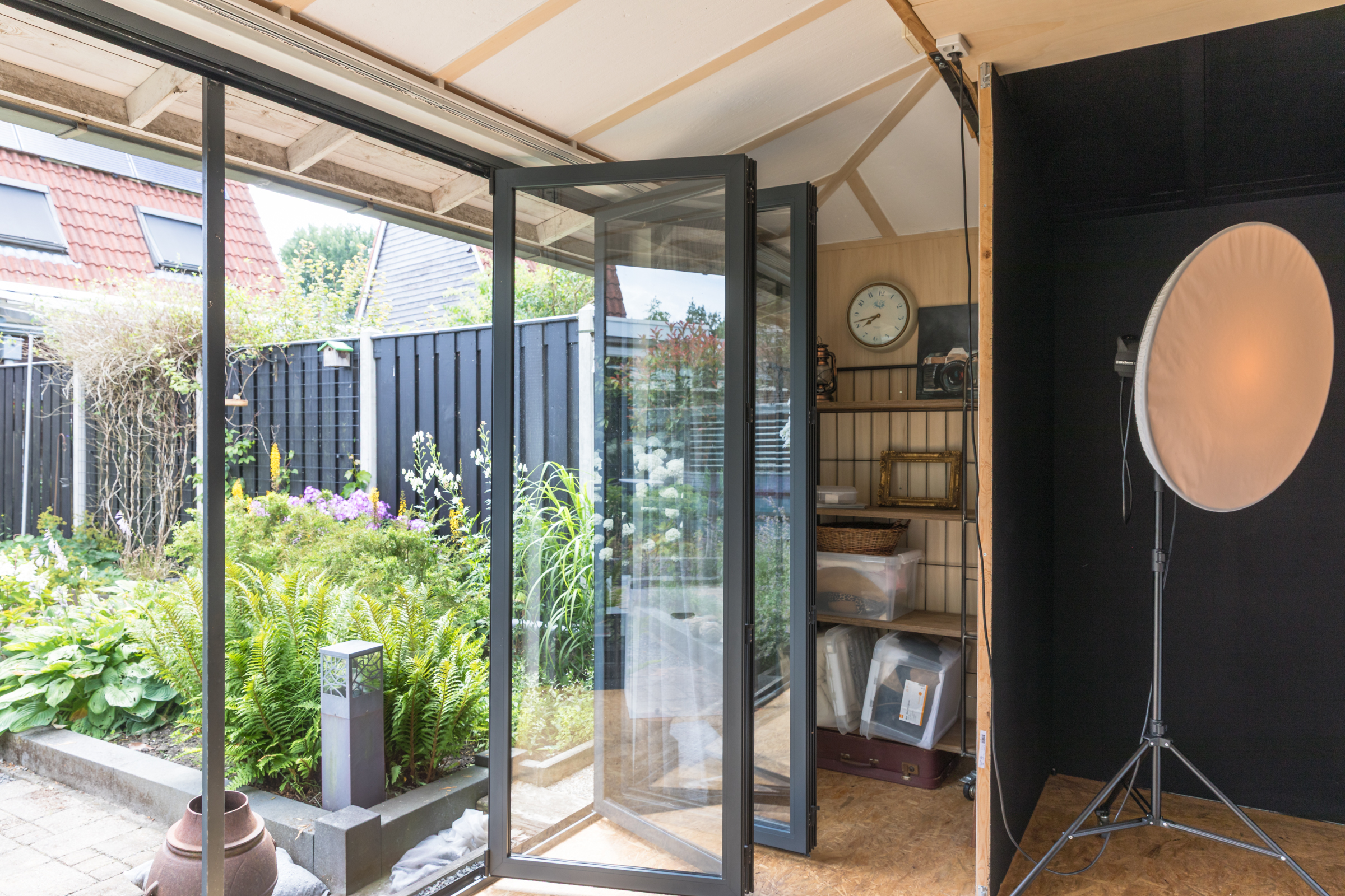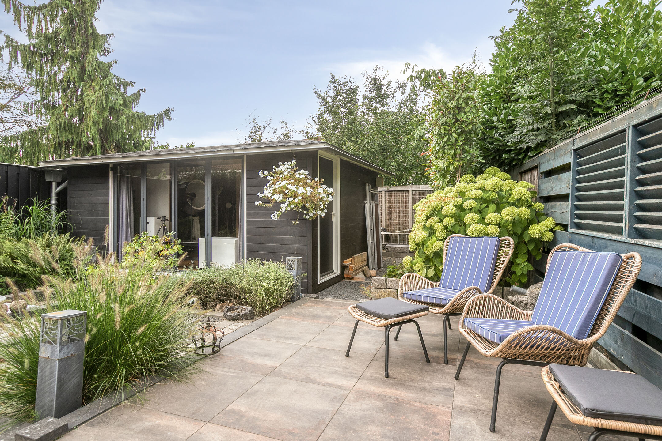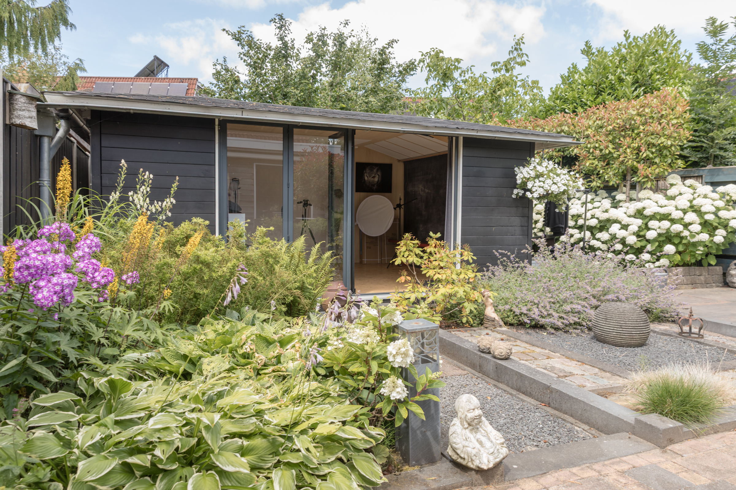 De achtertuin is keurig aangelegd met tegels en diverse borders vol met groen. De tuin is omheind met houten schuttingen en beschikt over diverse elektra-/ en waterpunten. Tegen de achtergevel is een groot elektrisch zonnescherm geplaatst en naast de woning is een grote overkapping. Achterin de tuin staat een mooie studio welke is geïsoleerd en beschikt over elektra. De studio kunt u gebruiken als werkplek, hobbyruimte of u kunt het verbouwen naar een slaapkamer met badkamer (waterpunt ligt naast de studio). Ideaal voor een thuiswonend kind! De studio heeft harmonicadeuren die u kunt openzetten om de tuin erbij te betrekken. Achter de studio heeft u nog een houten schuur voor extra opslag van uw tuingereedschap.