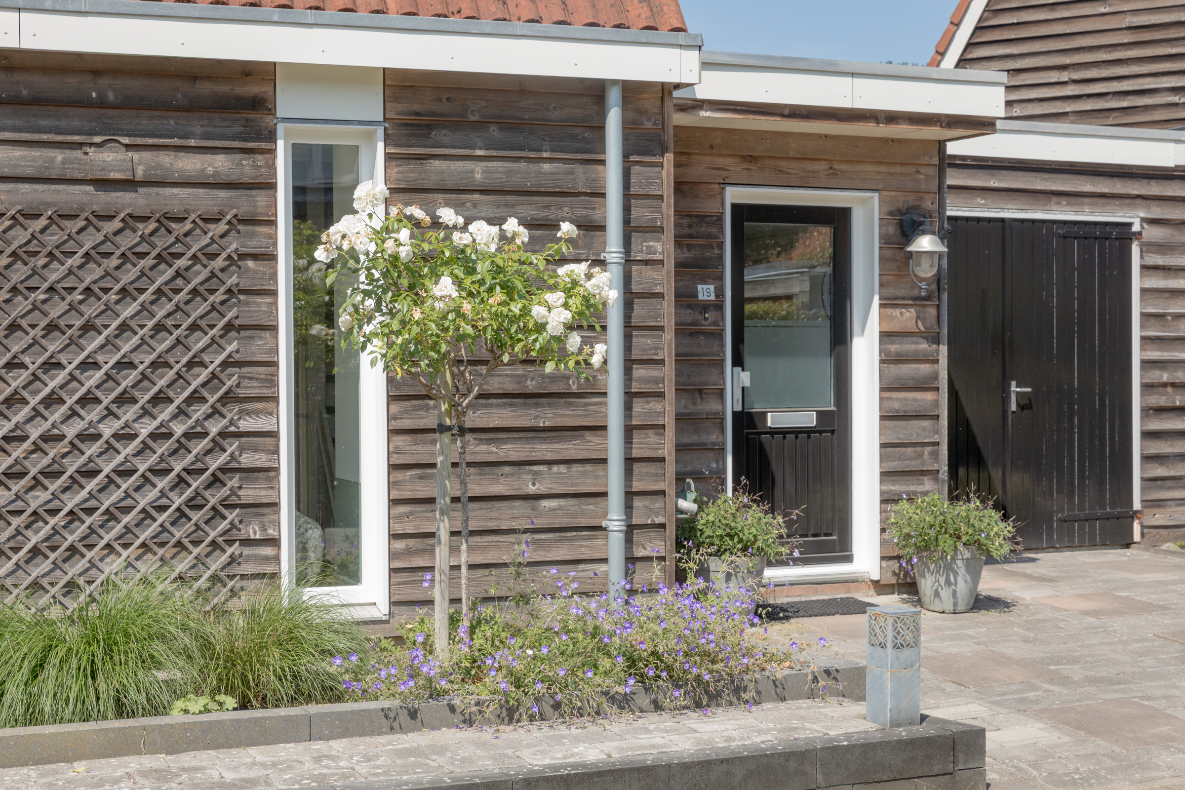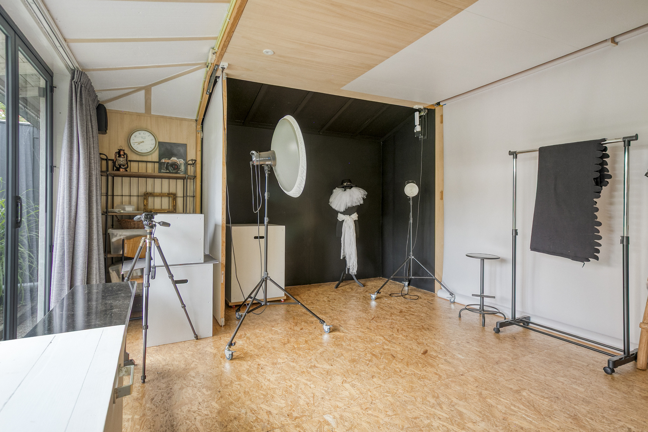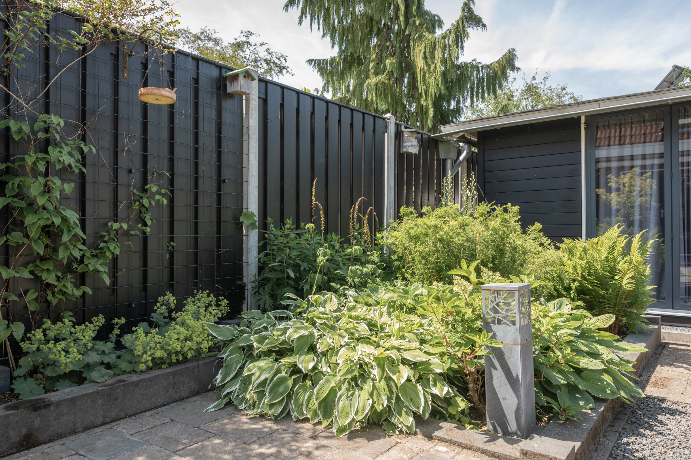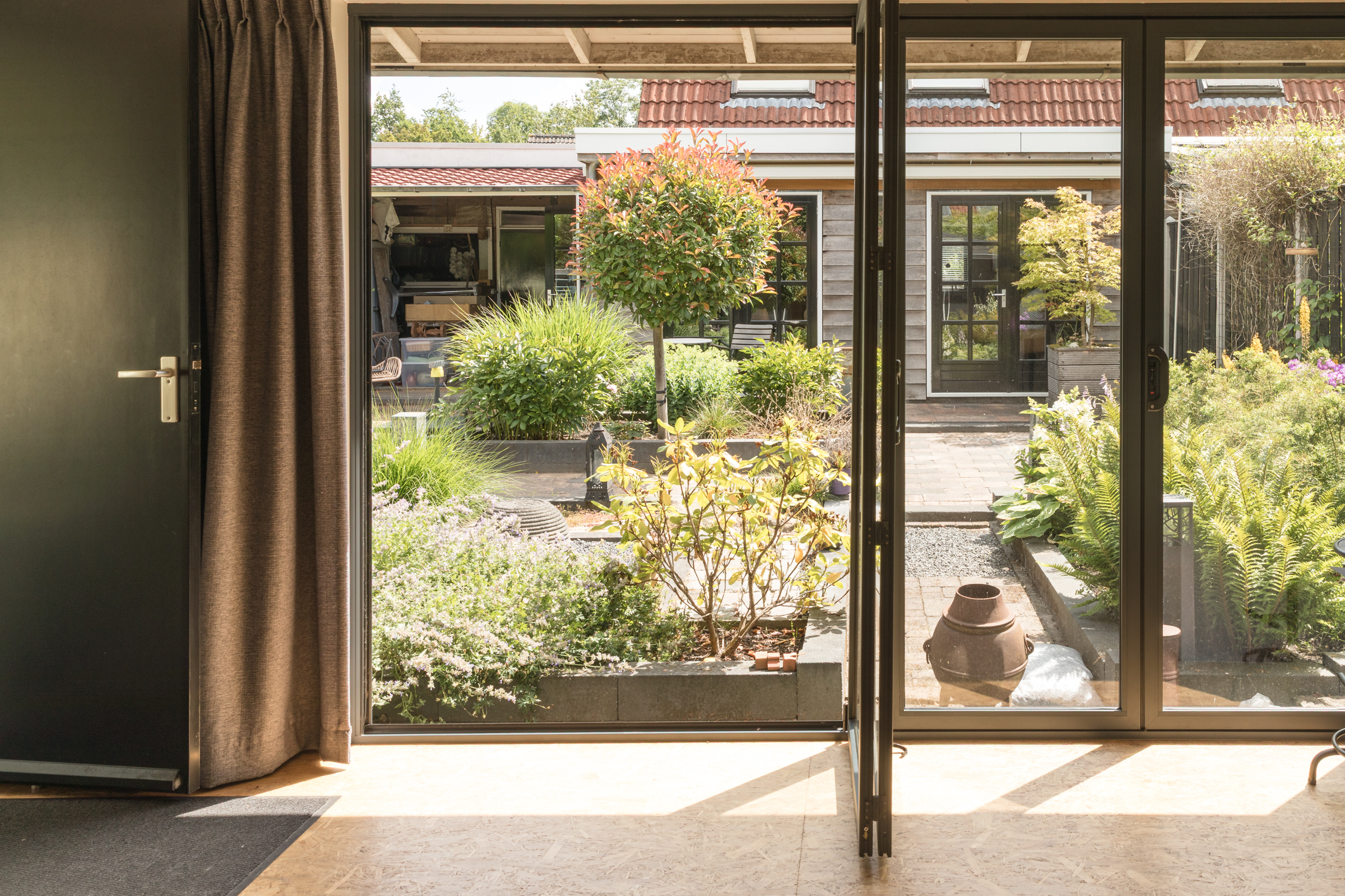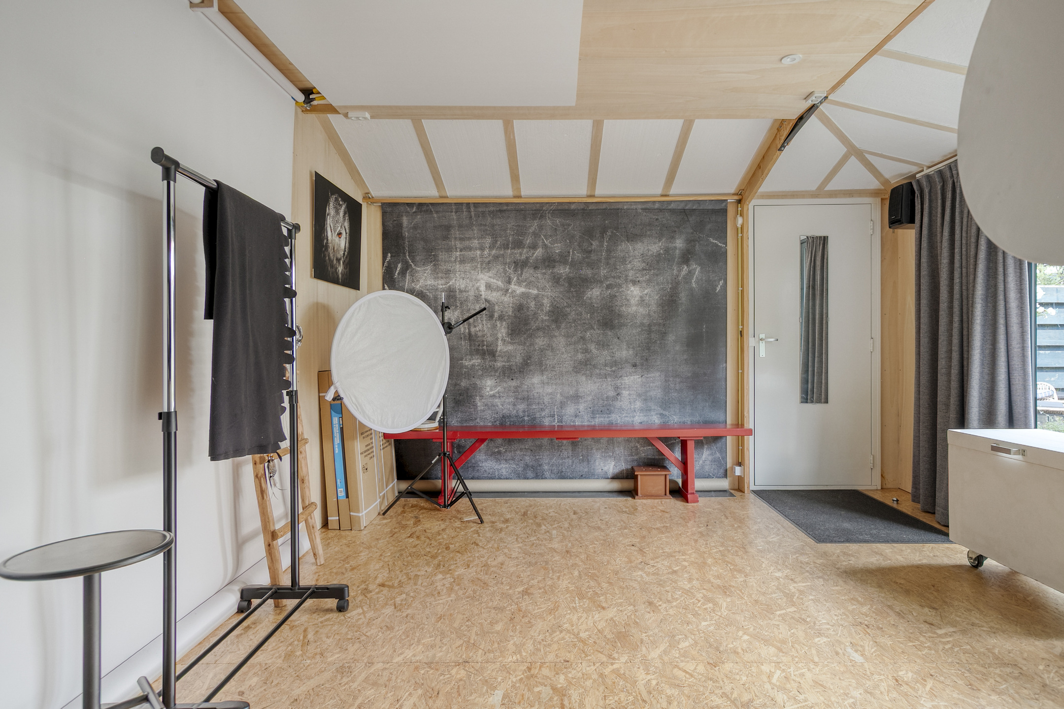 De achtertuin is keurig aangelegd met tegels en diverse borders vol met groen. De tuin is omheind met houten schuttingen en beschikt over diverse elektra-/ en waterpunten. Tegen de achtergevel is een groot elektrisch zonnescherm geplaatst en naast de woning is een grote overkapping. Achterin de tuin staat een mooie studio welke is geïsoleerd en beschikt over elektra. De studio kunt u gebruiken als werkplek, hobbyruimte of u kunt het verbouwen naar een slaapkamer met badkamer (waterpunt ligt naast de studio). Ideaal voor een thuiswonend kind! De studio heeft harmonicadeuren die u kunt openzetten om de tuin erbij te betrekken. Achter de studio heeft u nog een houten schuur voor extra opslag van uw tuingereedschap.