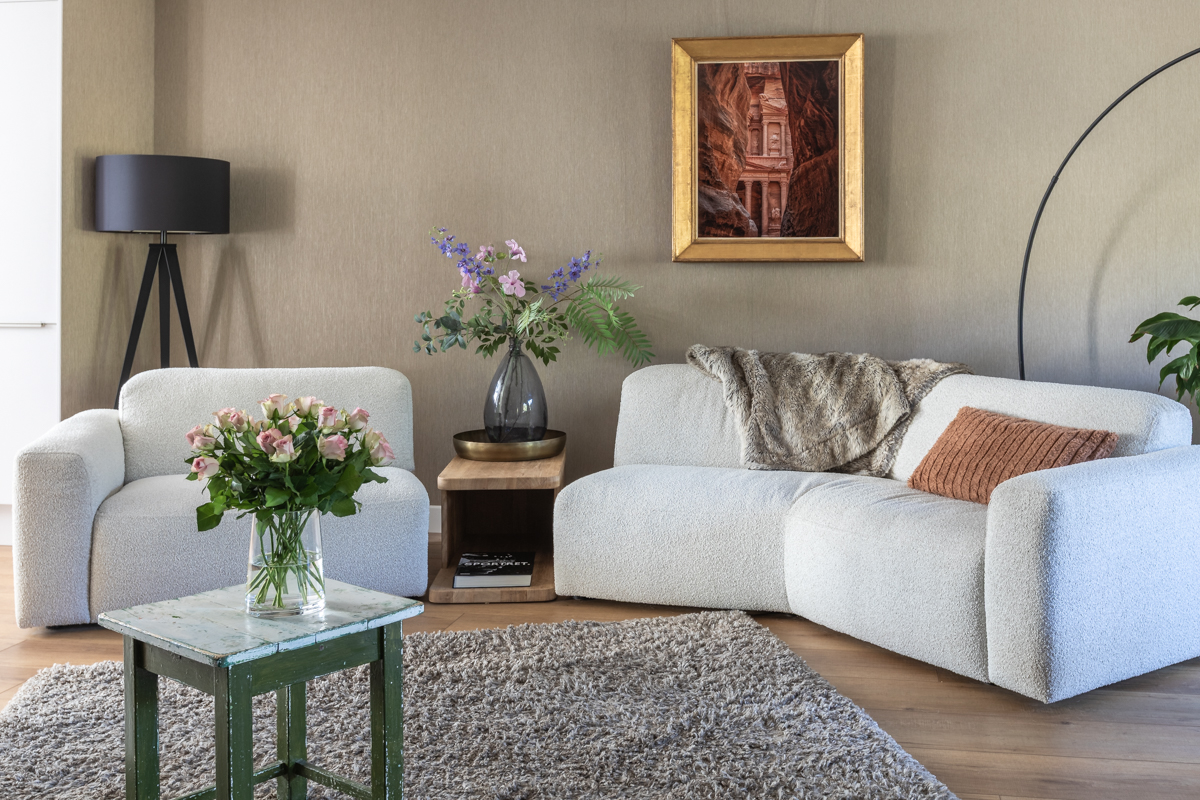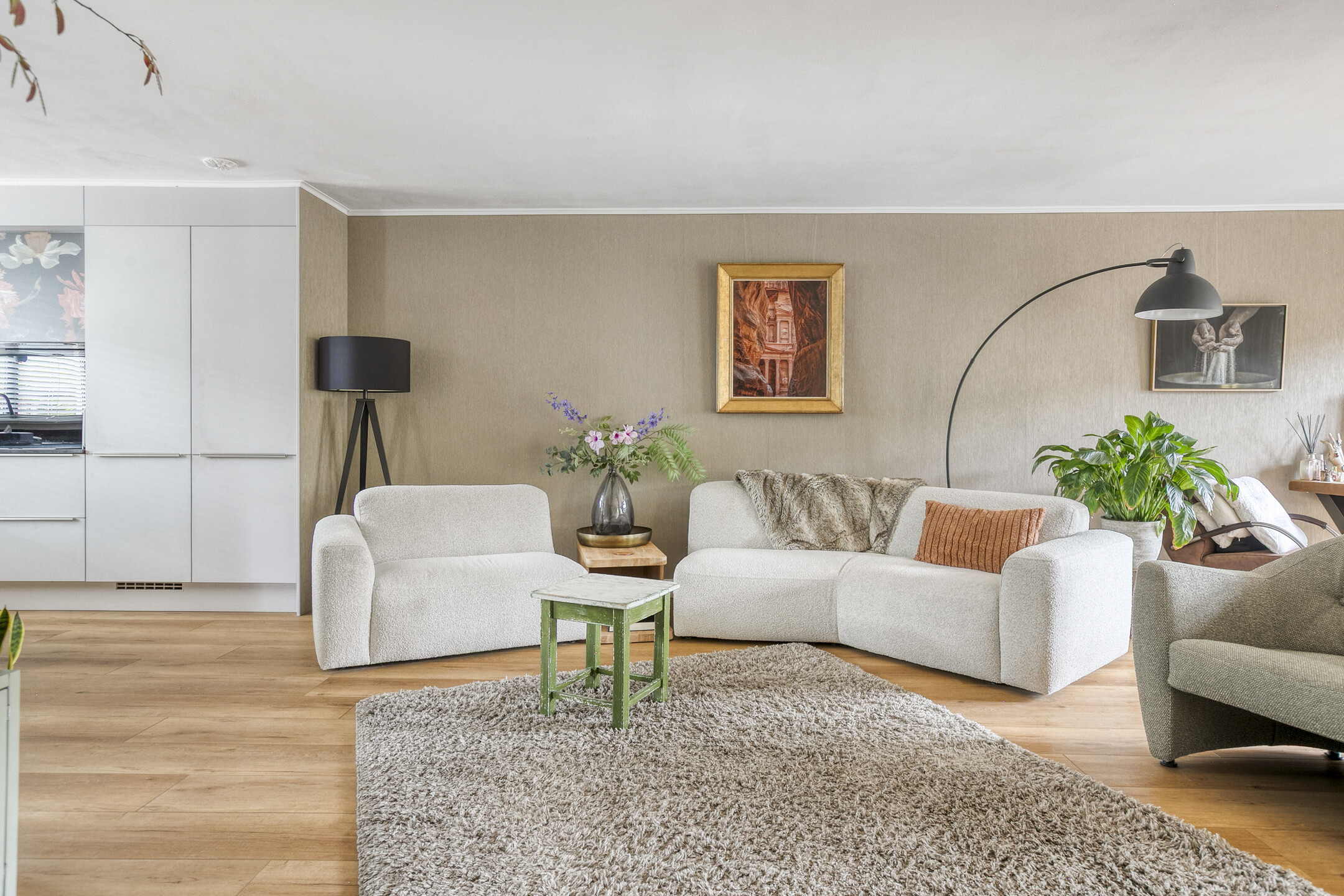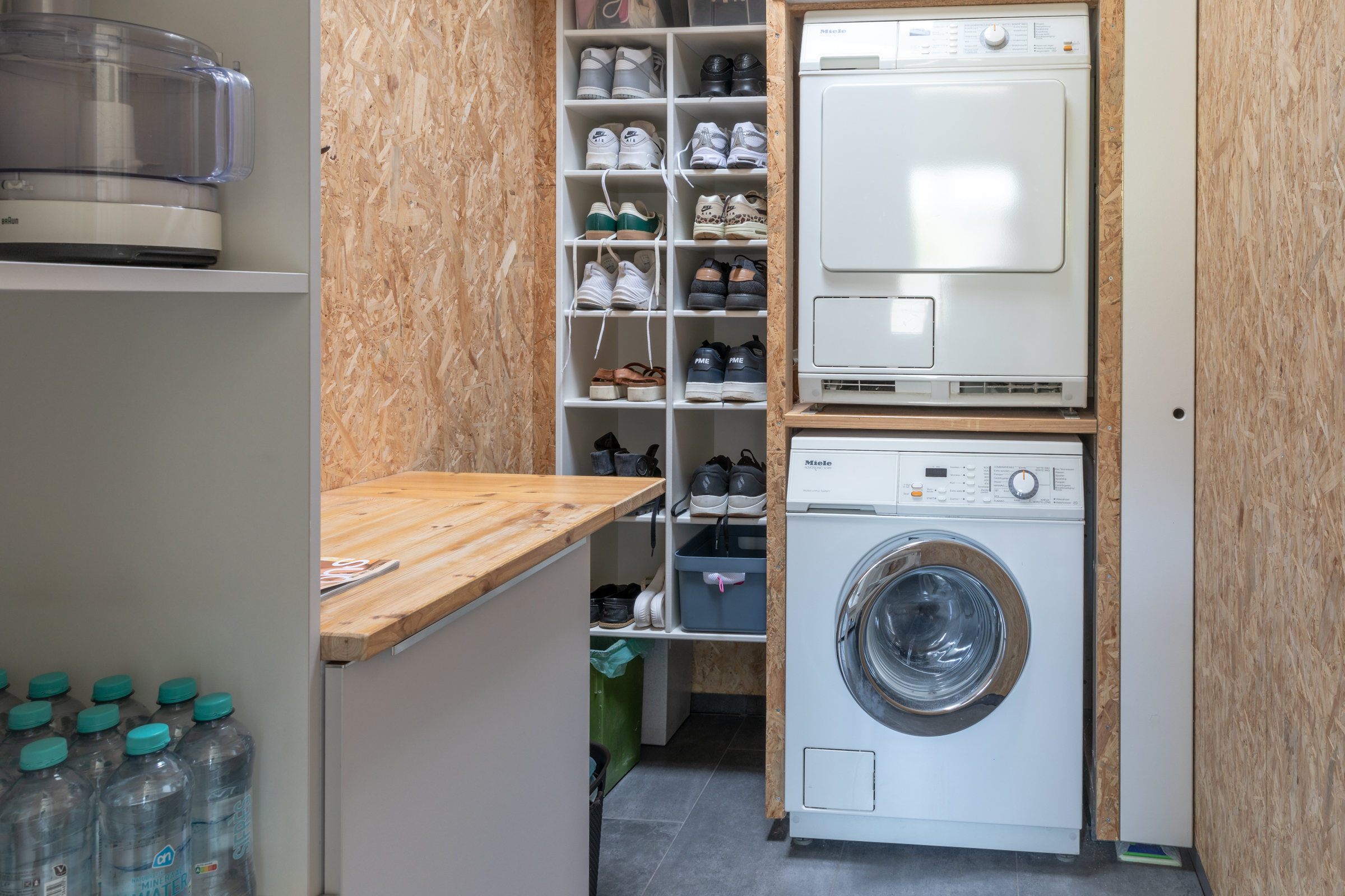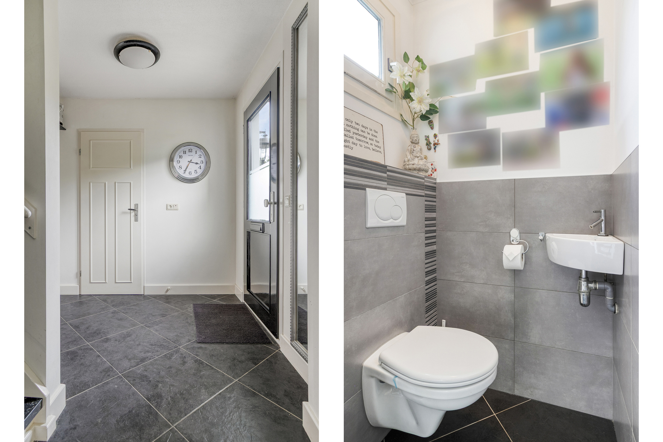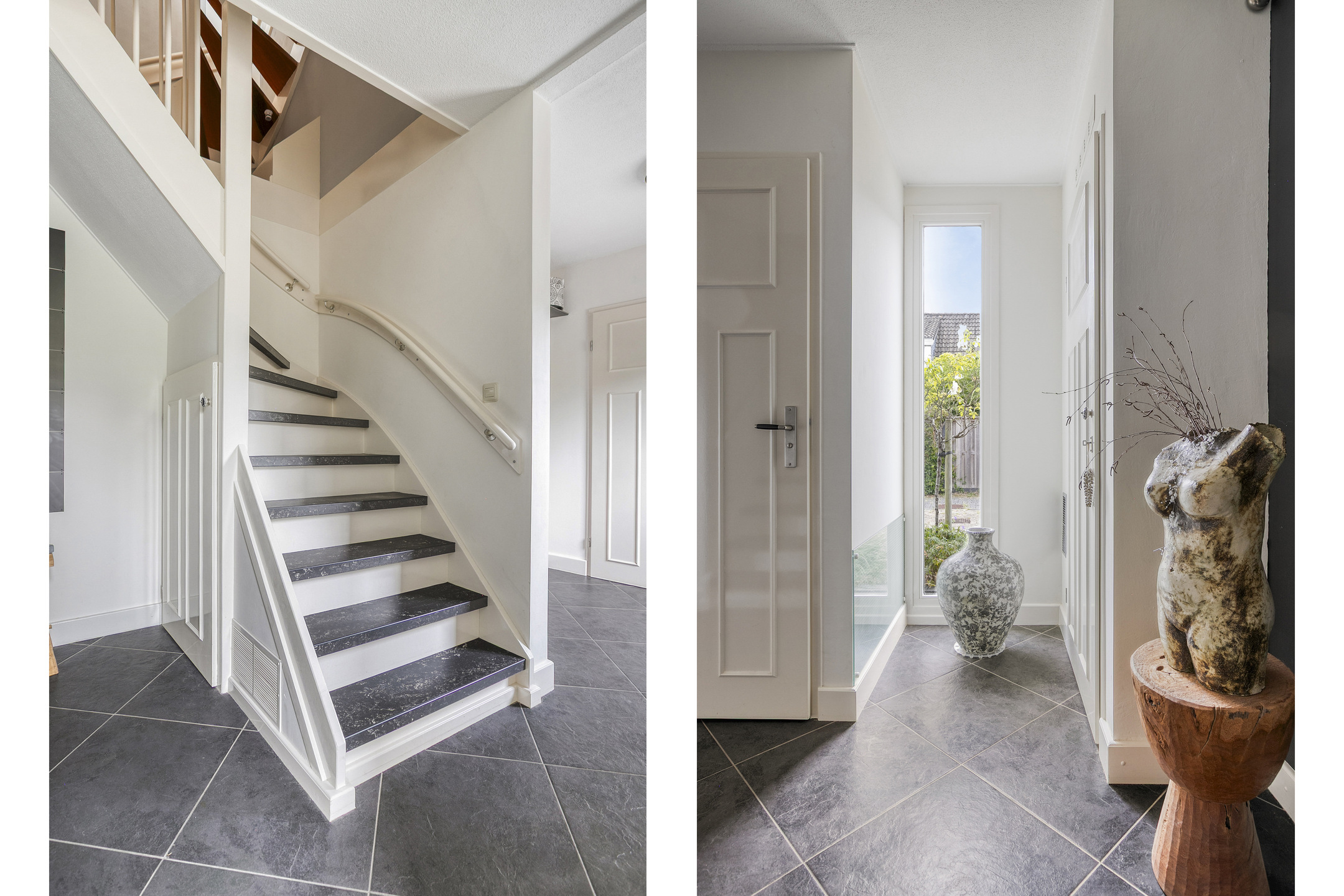 U parkeert de auto op eigen terrein op uw oprit of in uw garage met dubbele deur en u loopt naar voordeur waar u binnenkomt in de prachtige hal. In de hal vindt u de meterkast met glasvezelaansluiting en het toilet met fonteintje. U heeft vanuit de hal toegang tot de garage en tot de bijkeuken met opstelling voor de wasmachine en droger. De hal is betegeld met mooie zwarte plavuizen die matchen bij de trapopgang met zwarte staptredes en de zwarte taatsdeur welke leidt naar de woonkamer en keuken.