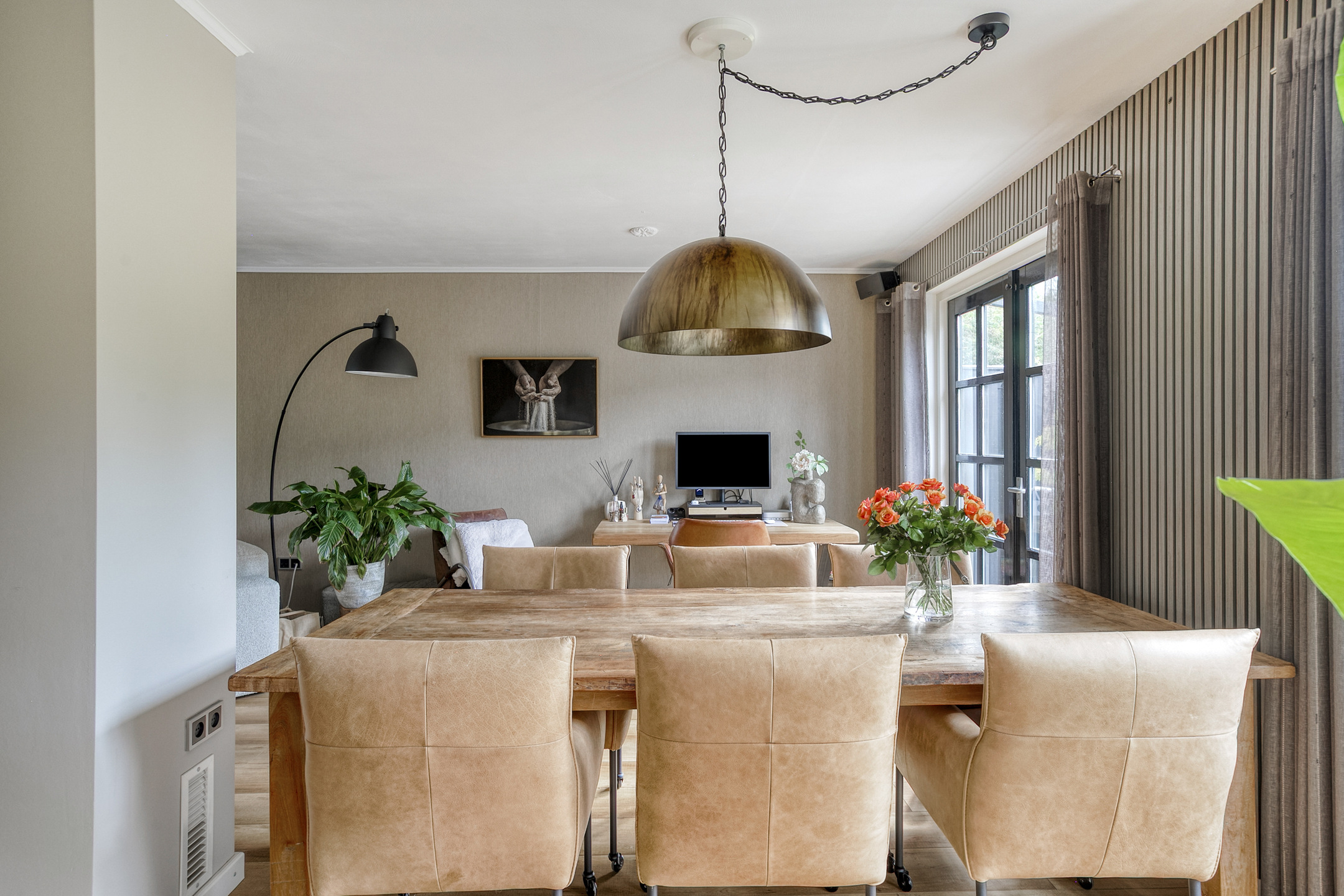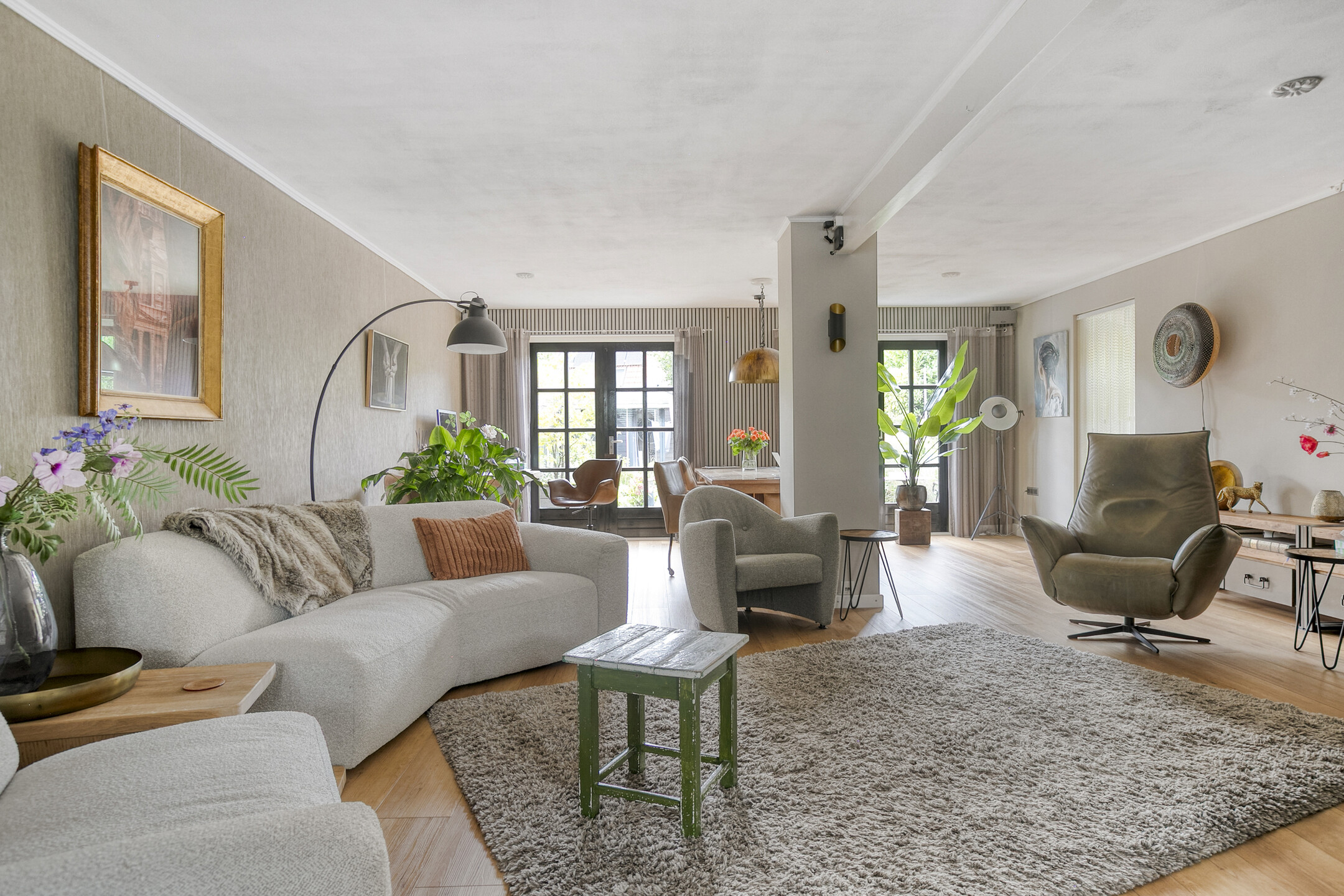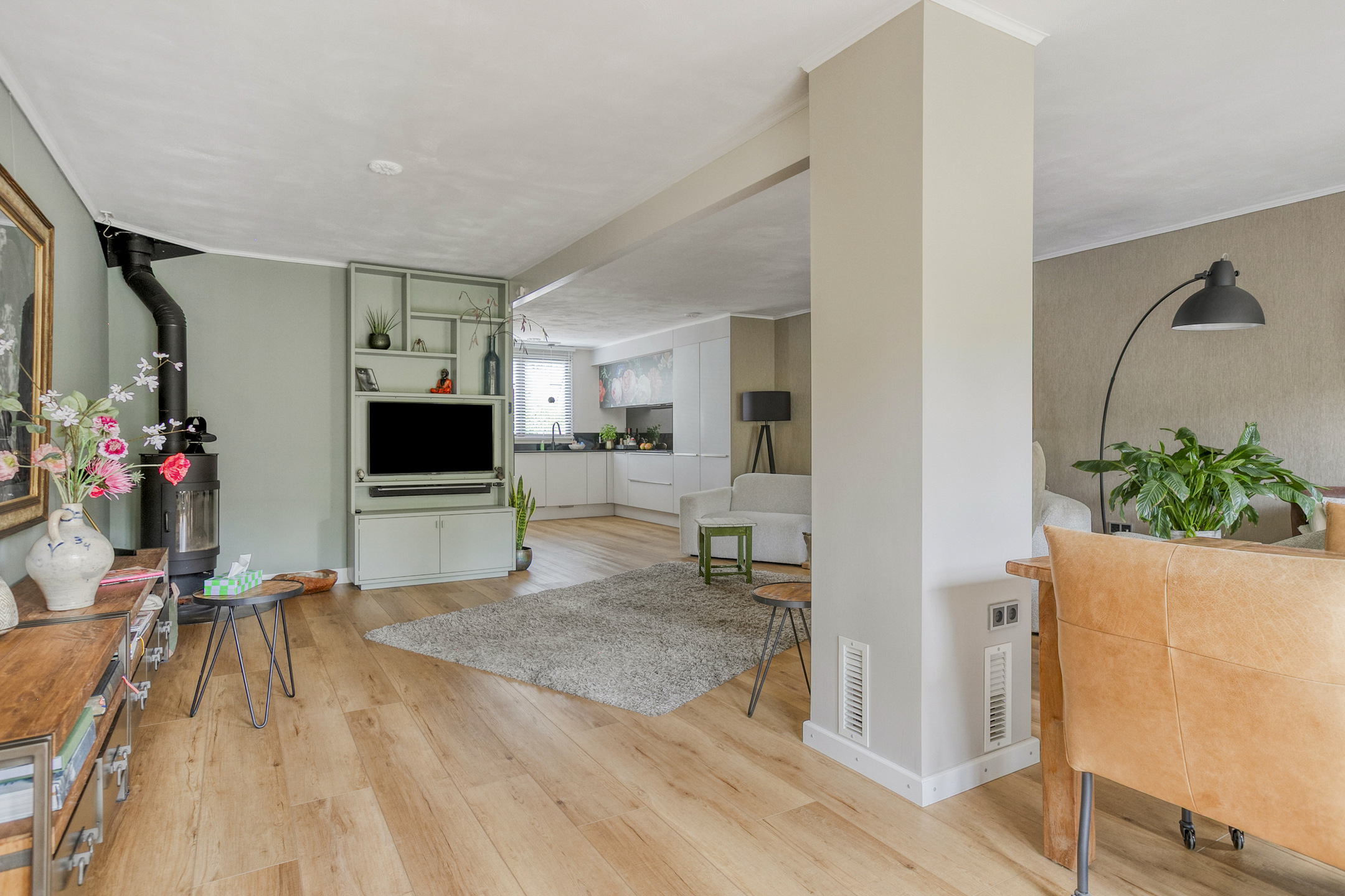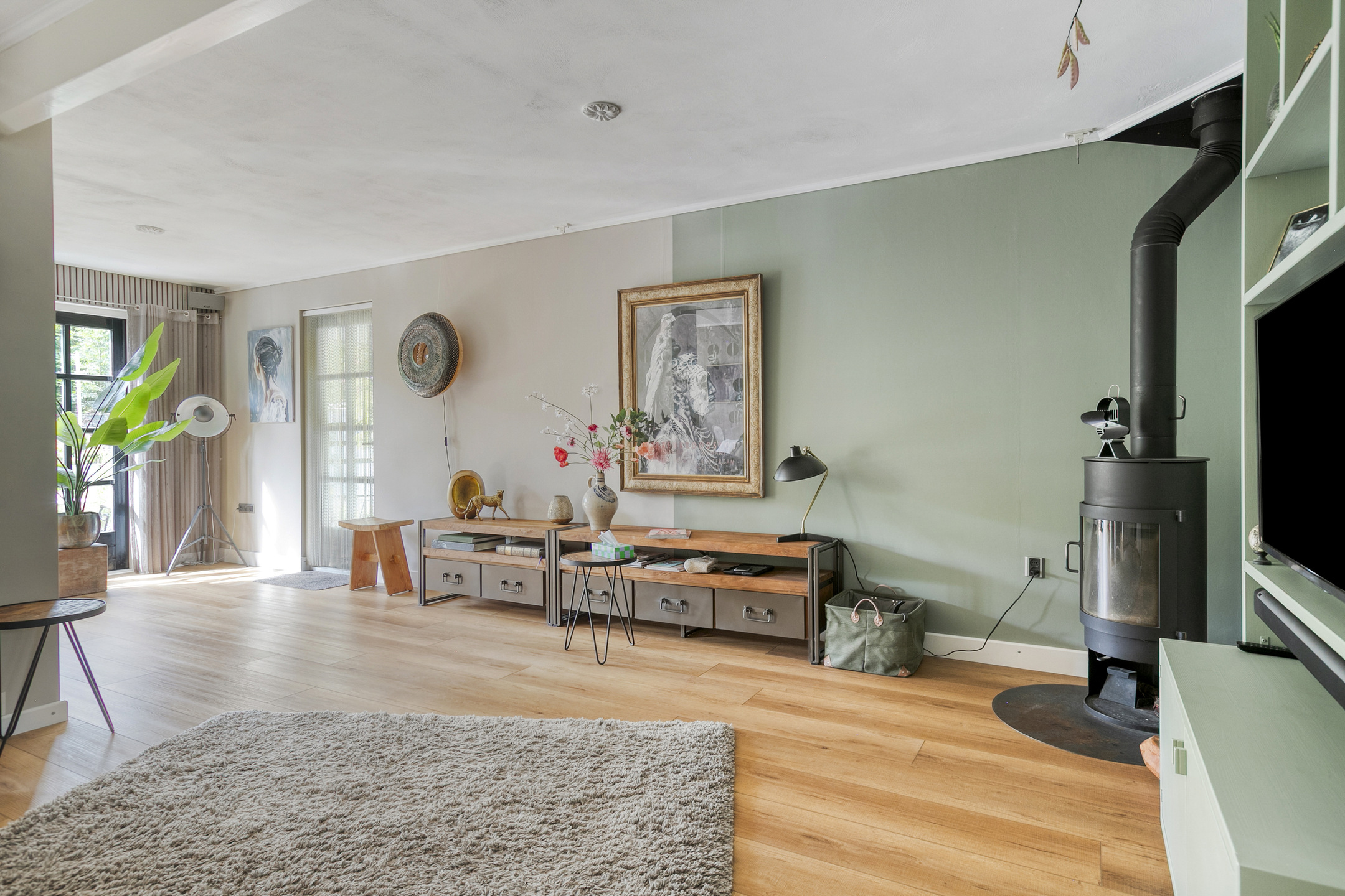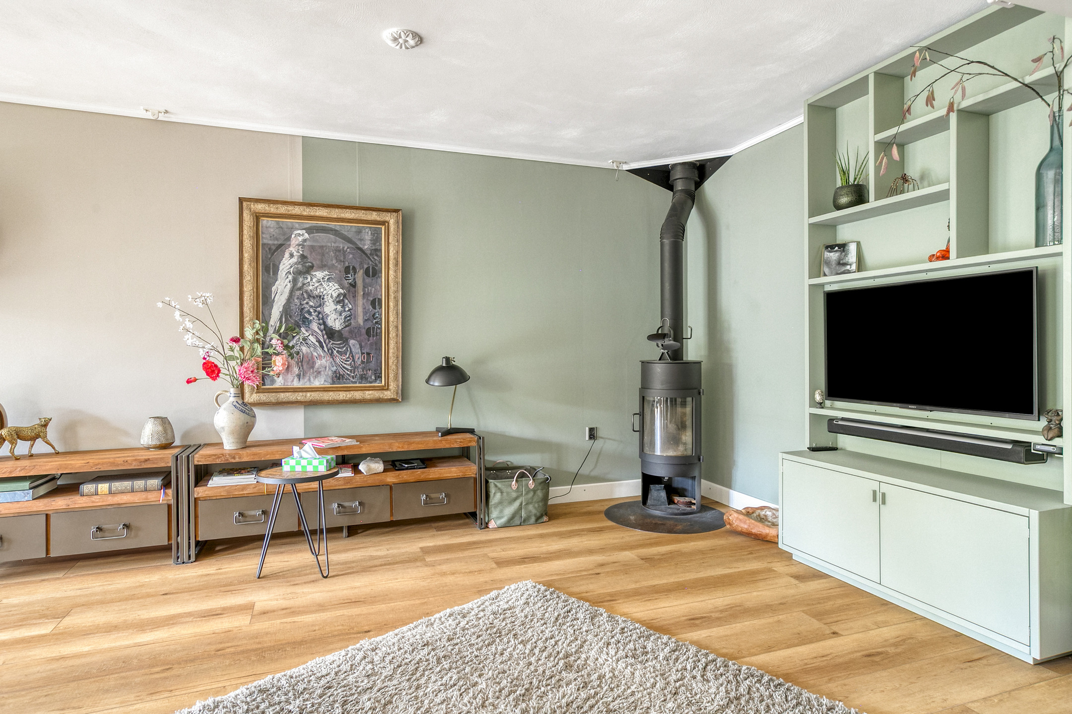 De sfeervolle uitgebouwde woonkamer is gelegen aan de achterzijde en deze is ook zeer ruim. De woonkamer beschikt over warmte tinten en houtpanelen aan de achterzijde. Er is een mooie houtkachel en is veel ruimte voor een grote zit-/ eethoek en eventueel uw werkplek. De woonkamer beschikt over een moderne PVC clickvloer. Vanuit de woonkamer heeft u een tweetal dubbele openslaande deuren en een deur aan de zijkant welke naar de achtertuin leidt. Terug in de hal bereikt u de garage, welke op dit moment in gebruik is als hobby-/ en werkruimte. Er is aan de achterzijde een separate werkruimte gecreëerd waardoor u in de toekomst eventueel genoeg ruimte heeft om de garage te kunnen ombouwen naar een slaap-/ en badkamer.
