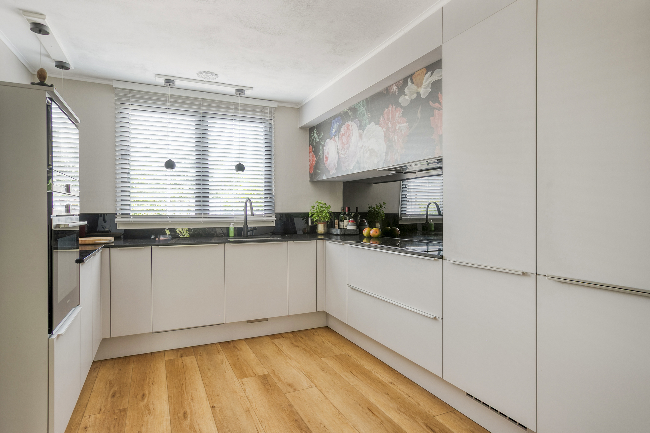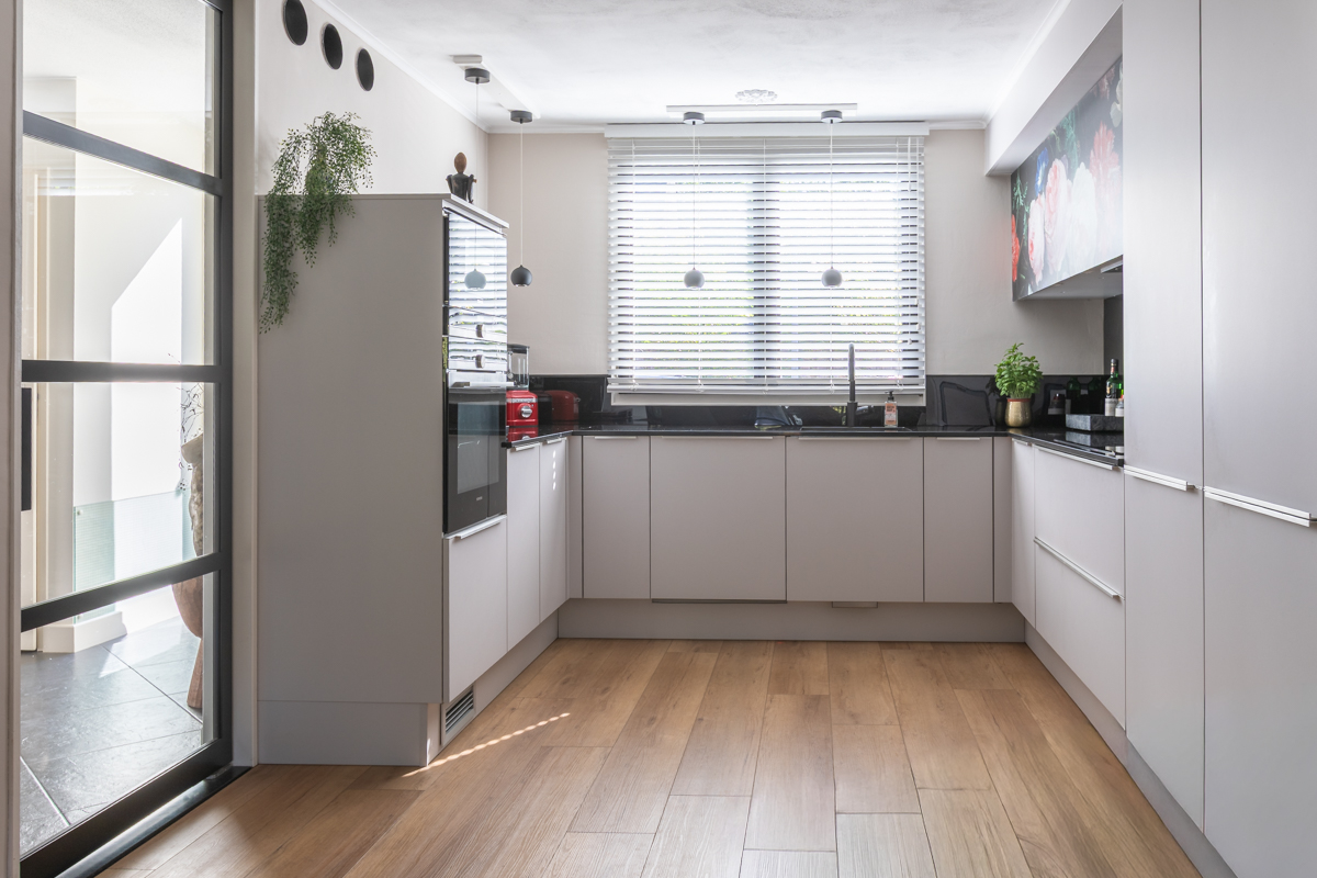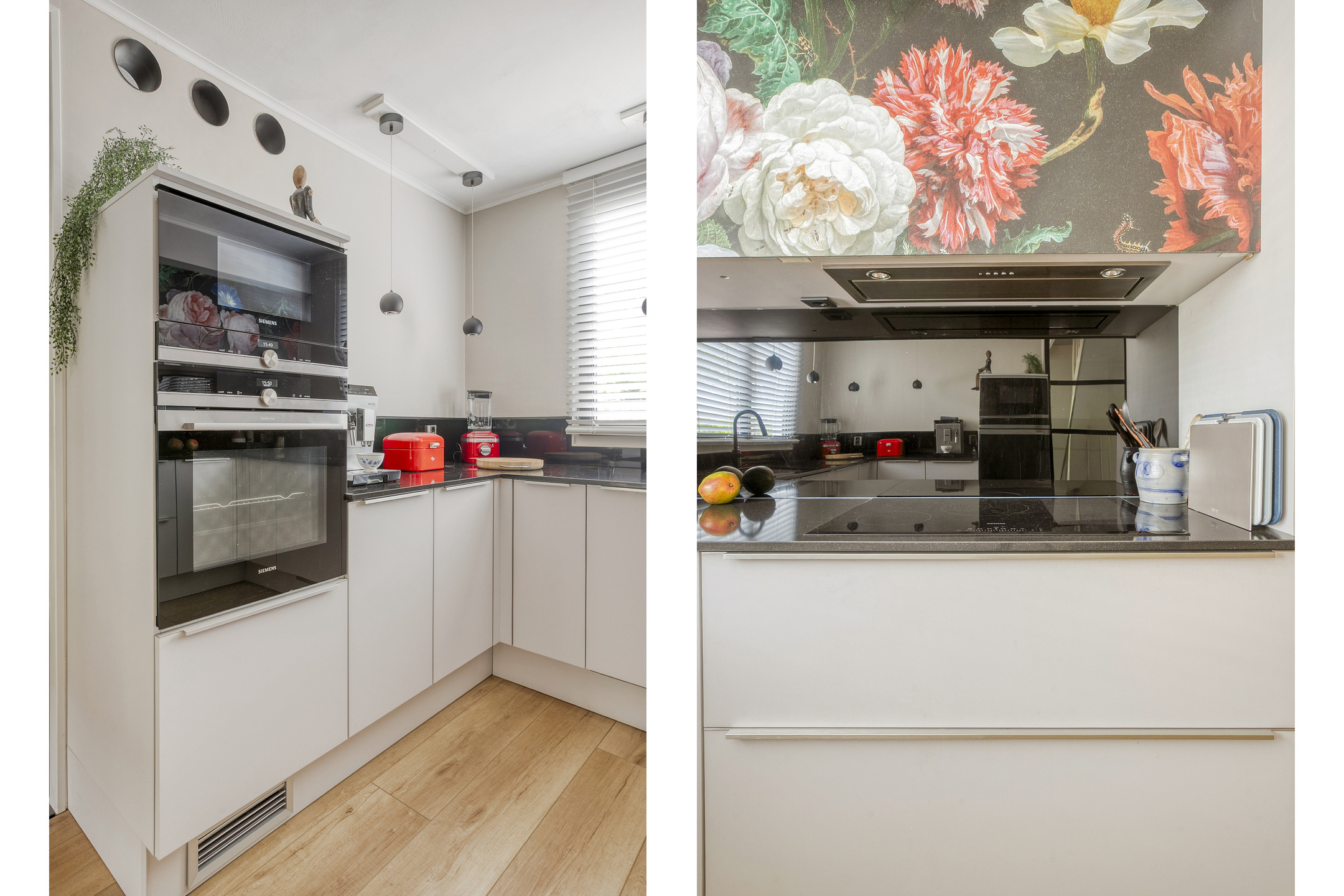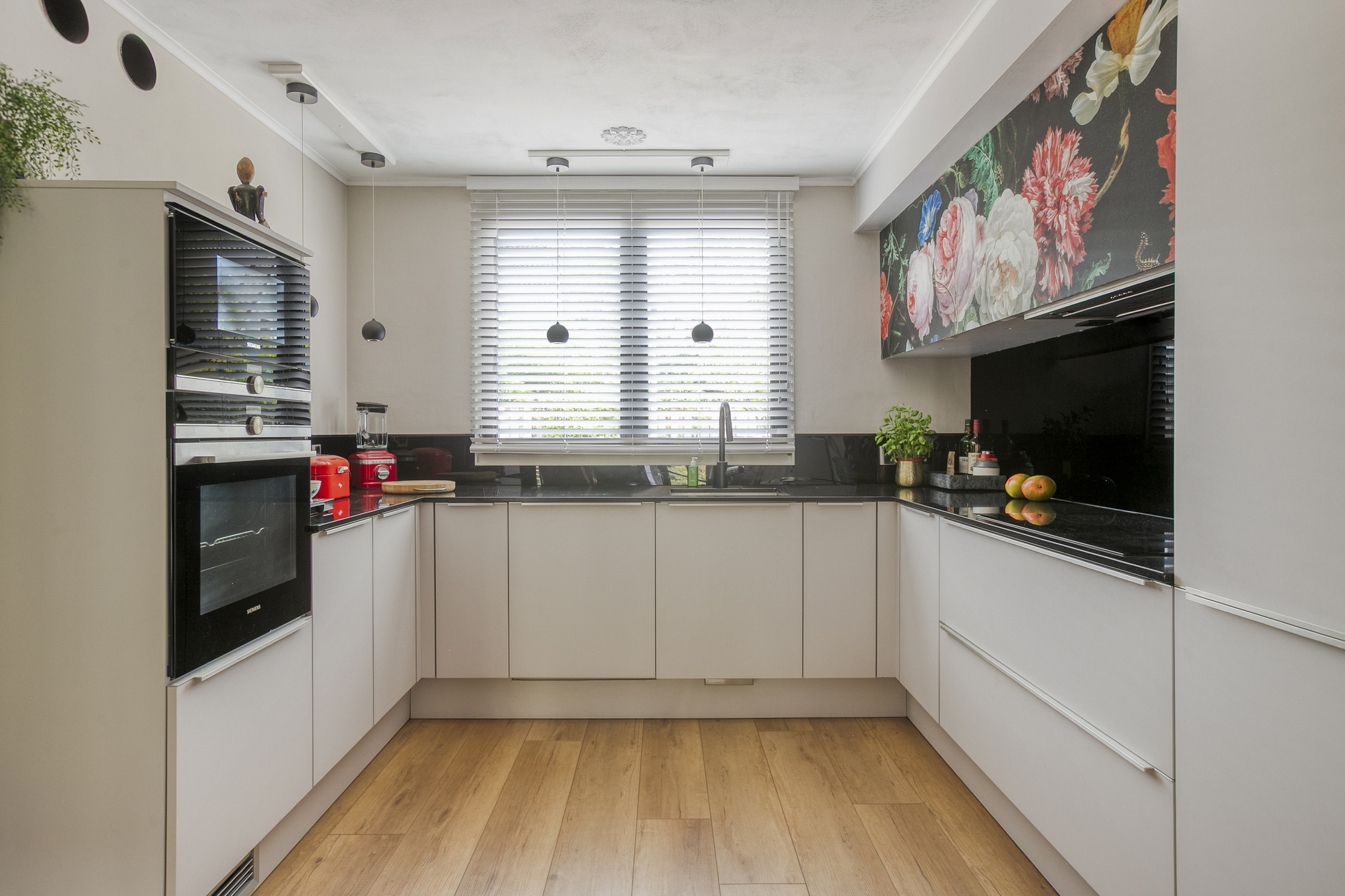 De moderne keuken uit 2020 is gelegen aan de voorzijde en deze is geplaatst in een U-vorm. De keuken is voorzien van een composiet aanrechtblad en beschikt over diverse apparatuur van Siemens waaronder de inductiekookplaat, de oven en magnetron, koelkast en vriezer. De vaatwasser en afzuigkap (welke naar buiten gaat) zijn van het merk Bosch. IIn het midden vindt u de spoelbak met daaronder een afvalsysteem met achter de plint een close-in boiler van 10 liter, waardoor u gelijk warm water heeft.