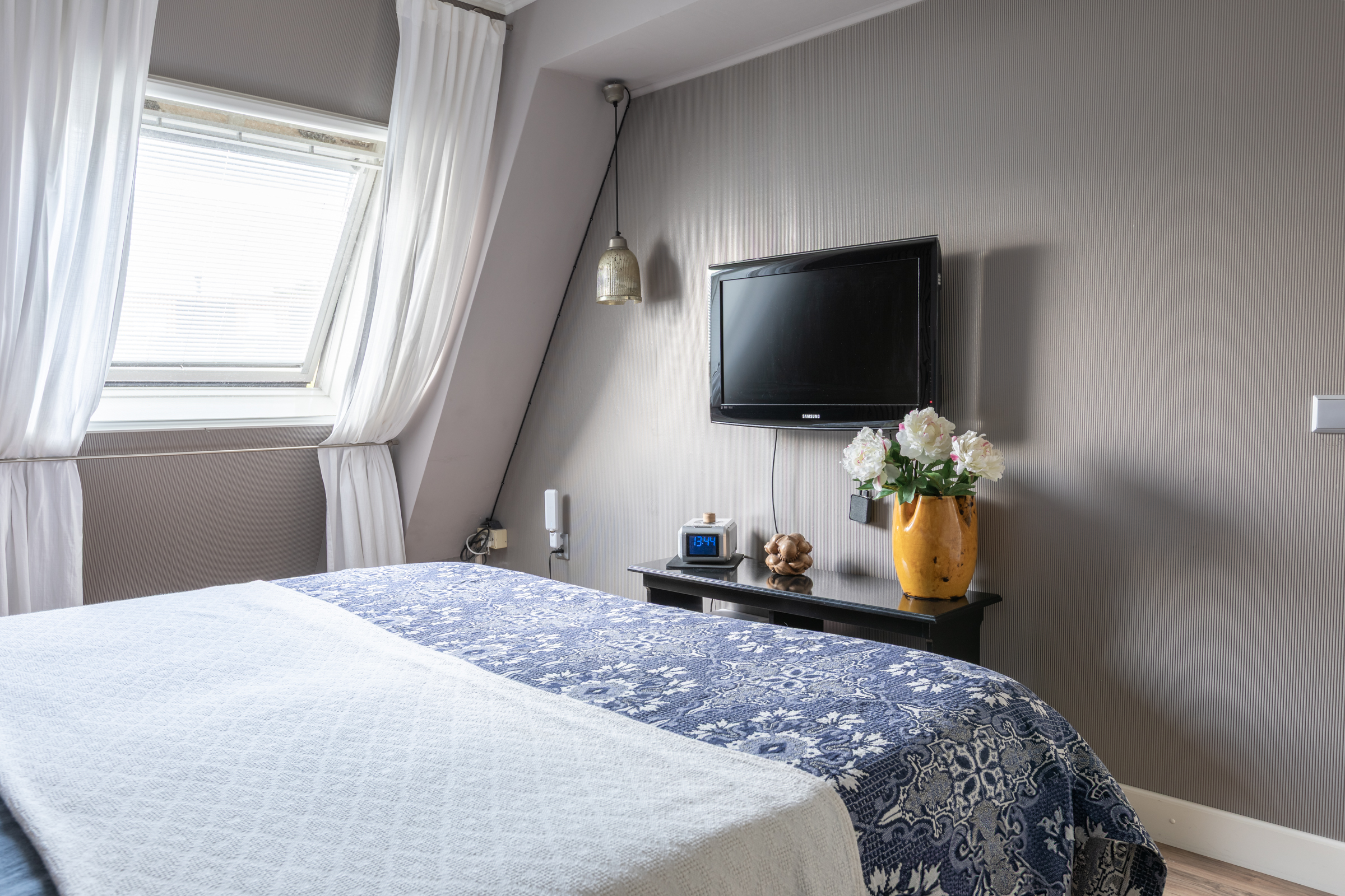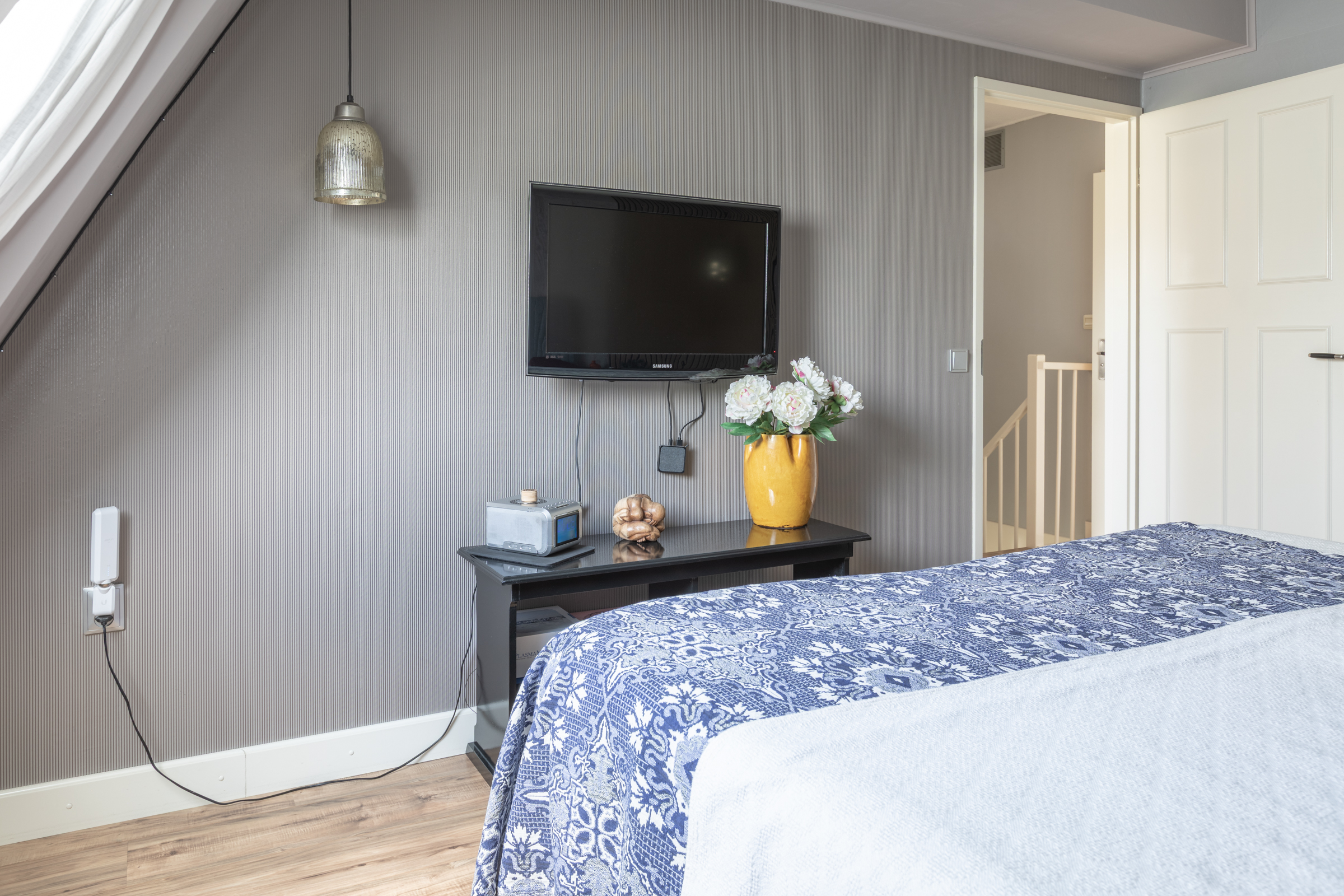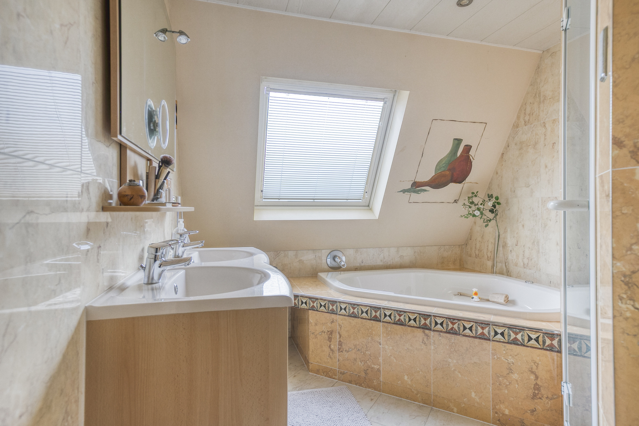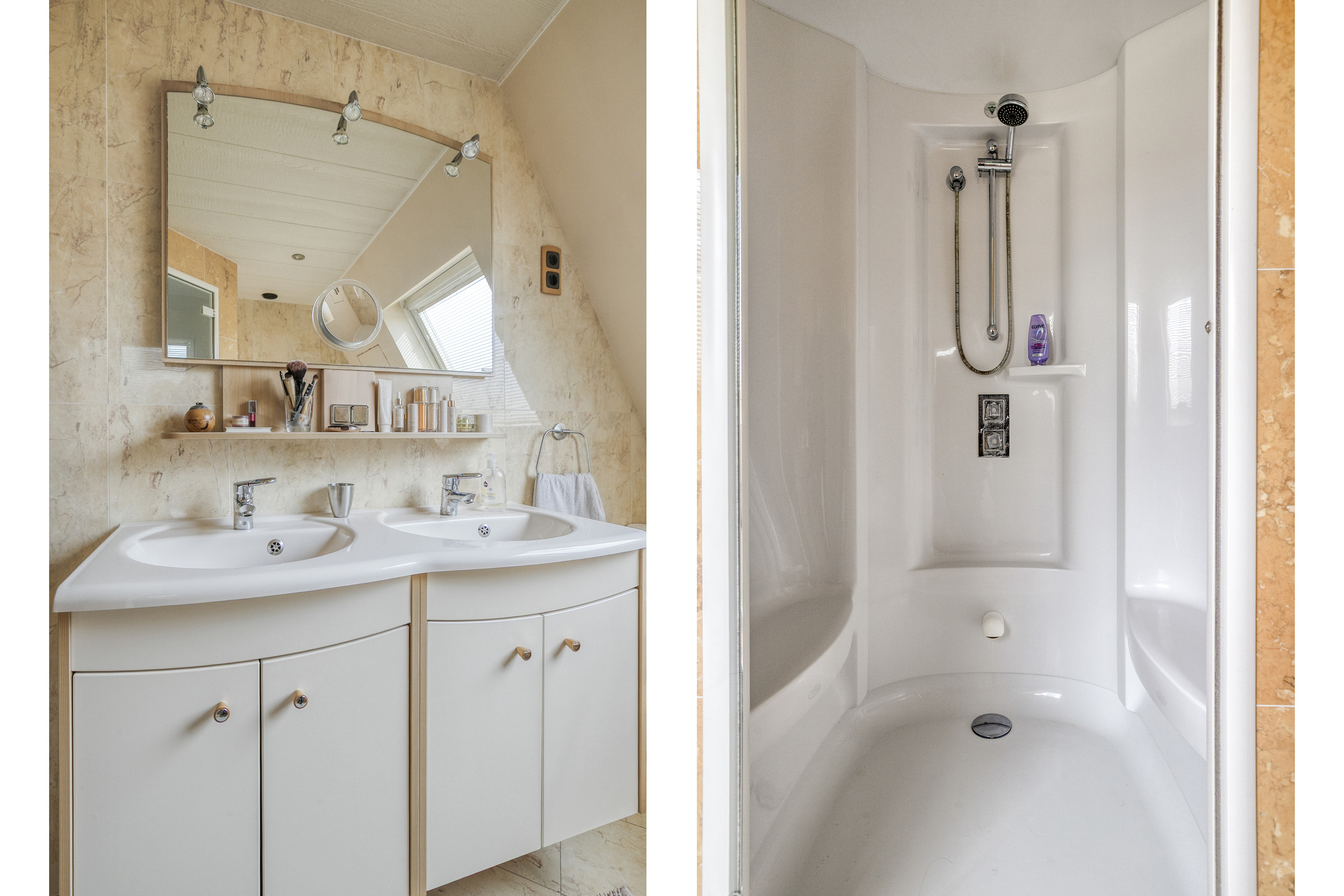U komt de trap op en komt uit op de overloop. Vanuit de overloop heeft u toegang tot 2 slaapkamers variërend in grootte. De masterbedroom is gelegen aan de achterzijde en beschikt over voldoende ruimte voor het plaatsen van een groot tweepersoonsbed en een kastenwand. Er is een dakraam met hor. Aan de voorzijde is de 2e slaapkamer welke op dit moment in gebruik is als ruime inloopkast. De kamers zijn voorzien van een nette laminaatvloer die is geïsoleerd voor het geluid. Aan de voorzijde is de saunakamer met 2e toilet. De saunakamer beschikt over een dakraam en is betegeld. Aan de achterzijde is de grote badkamer gelegen. De badkamer is voorzien van een stoomcabine met douche en zitjes, een groot ligbad (pomp van de whirlpool is stuk) en een dubbele wastafel met meubel en een spiegel. Het plafond is voorzien van inbouwspots en speakers.