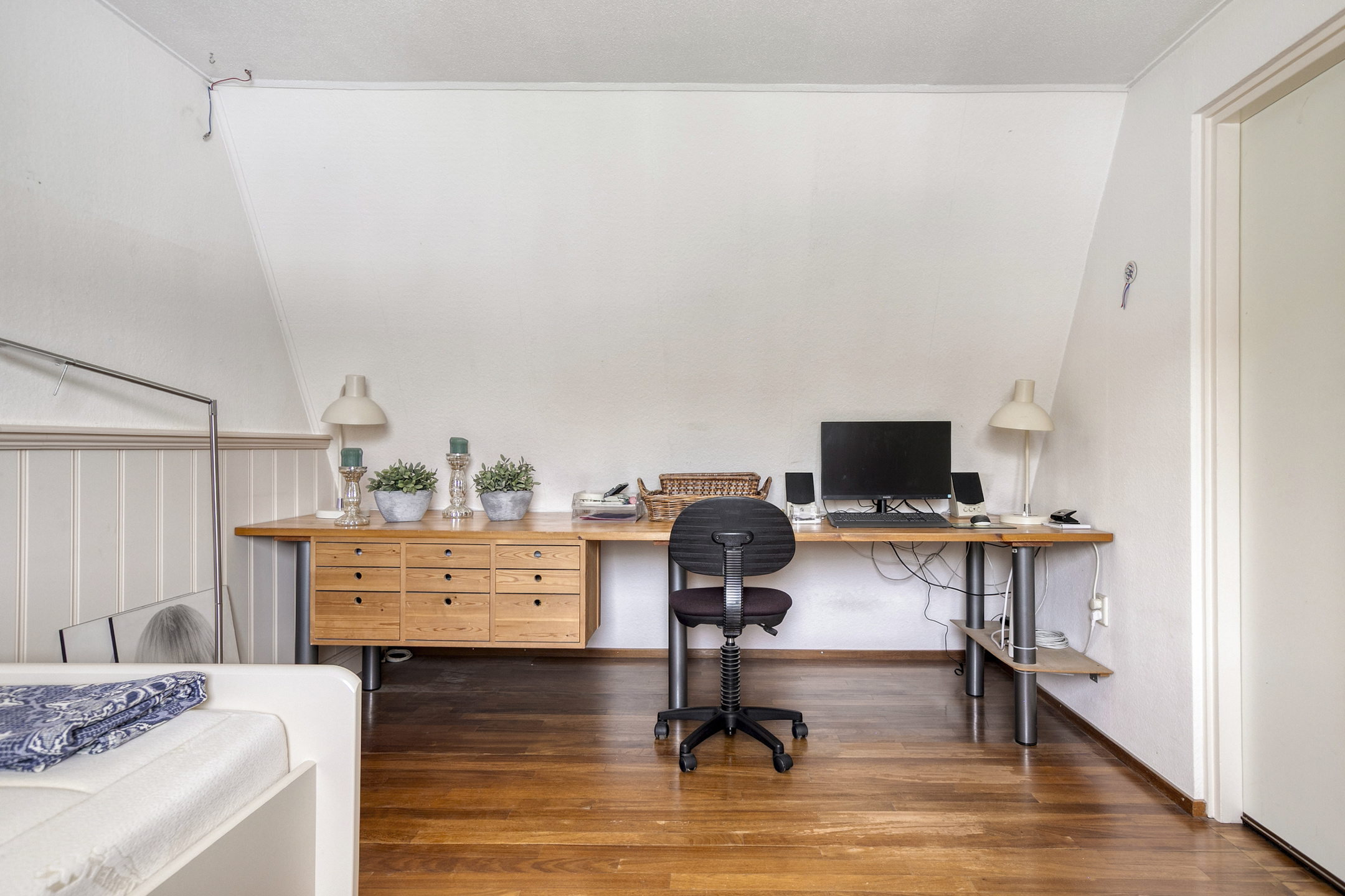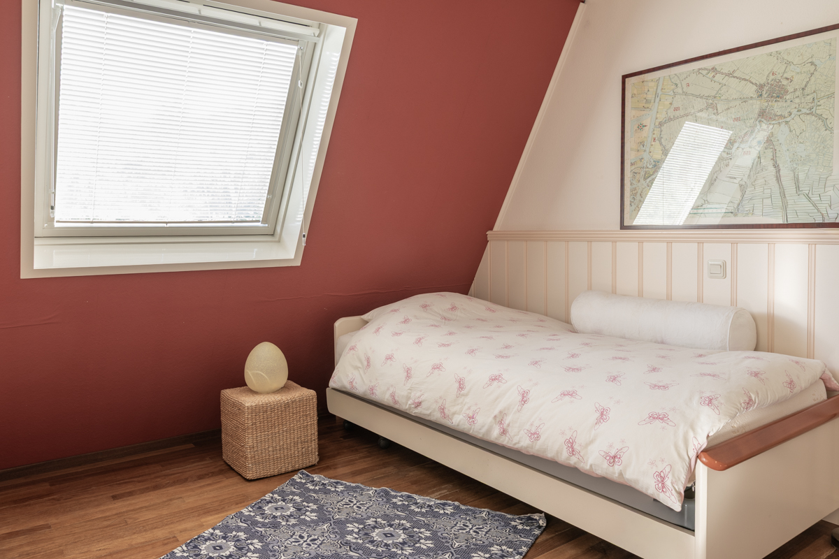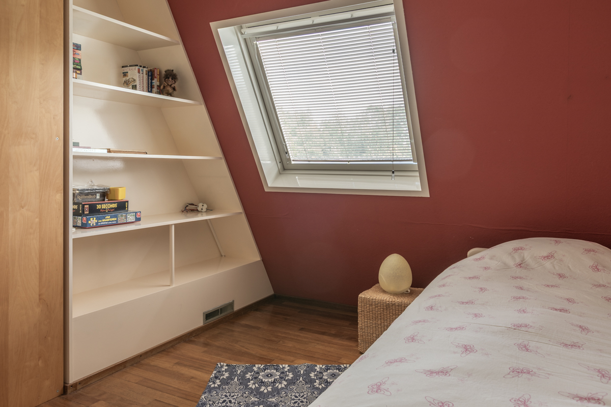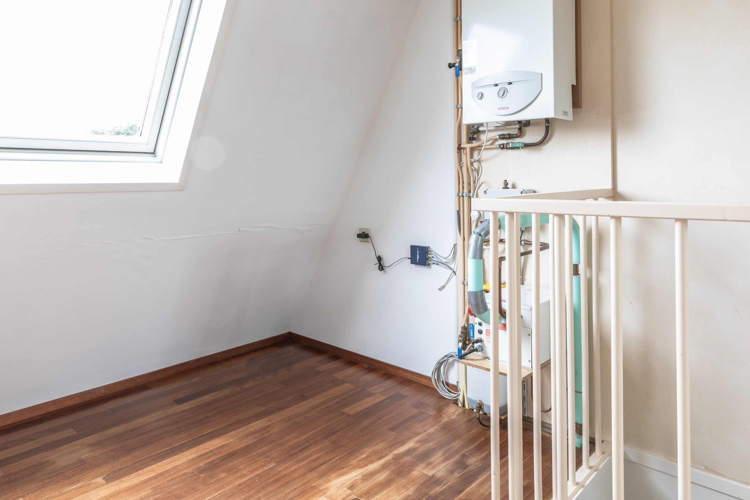 U neemt de trap en komt uit op de overloop met grote inbouwkast met schuifdeuren, de omvormer voor de 12 zonnepanelen (2019), de CV-unit (2010) luchtverwarming (met ombouw geïsoleerd tegen geluid), de badgeiser (2011) en de U betreedt de 3e slaapkamer welke voorzien is van een inbouwkast en van een groot dakraam aan de voorzijde. De vloer is voorzien van parket.