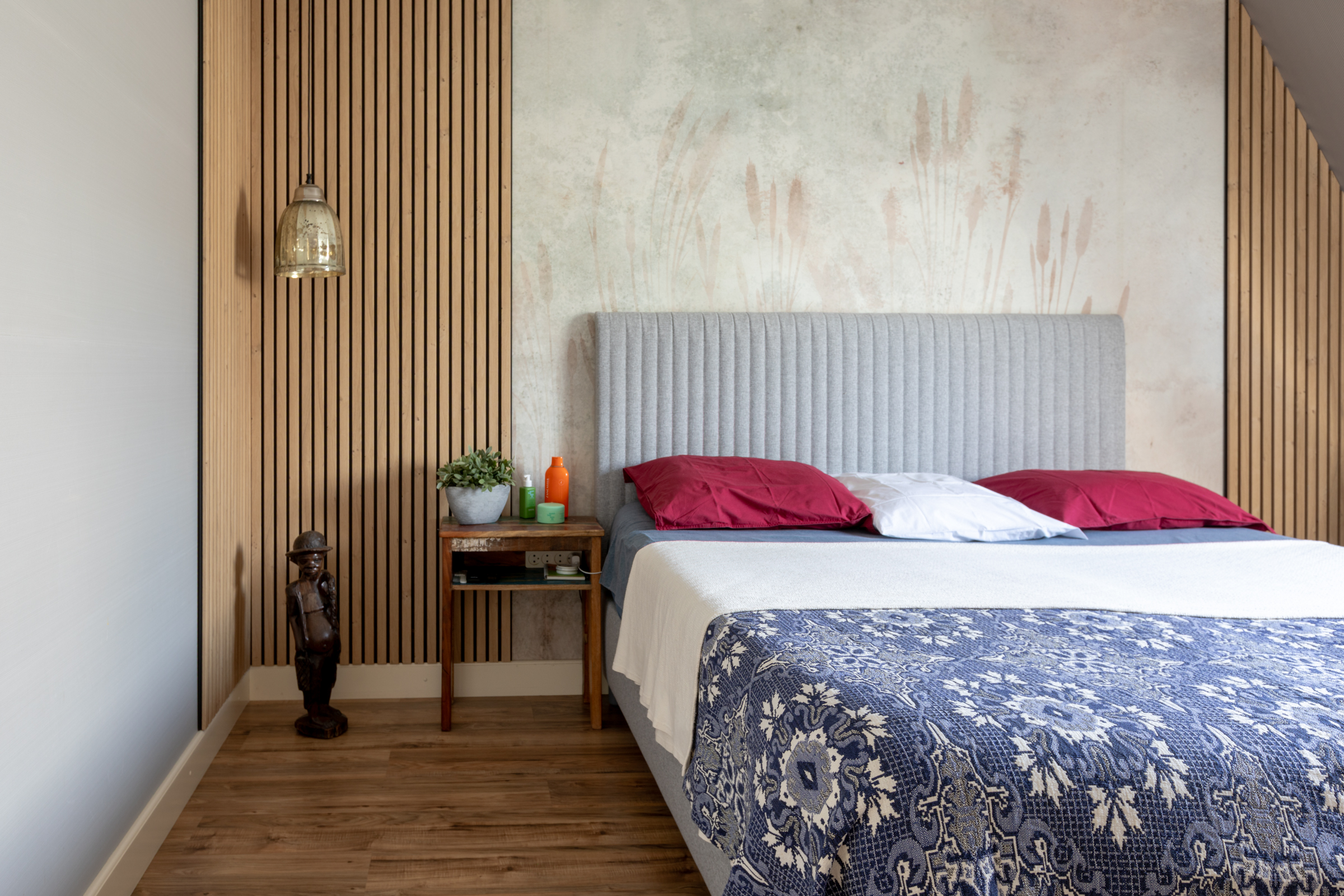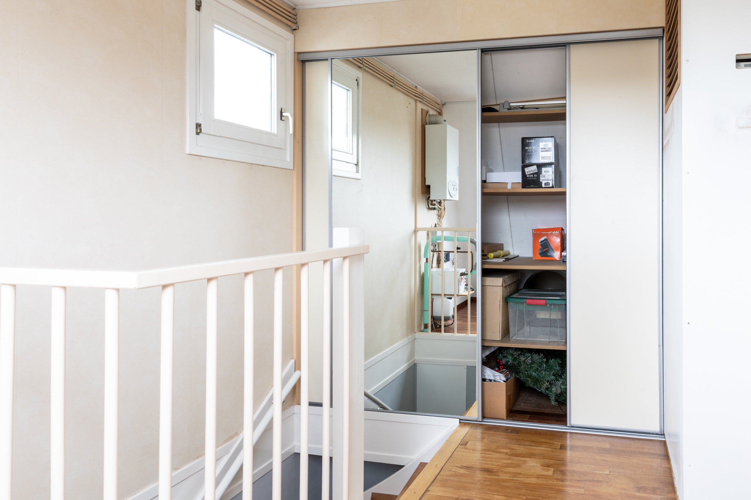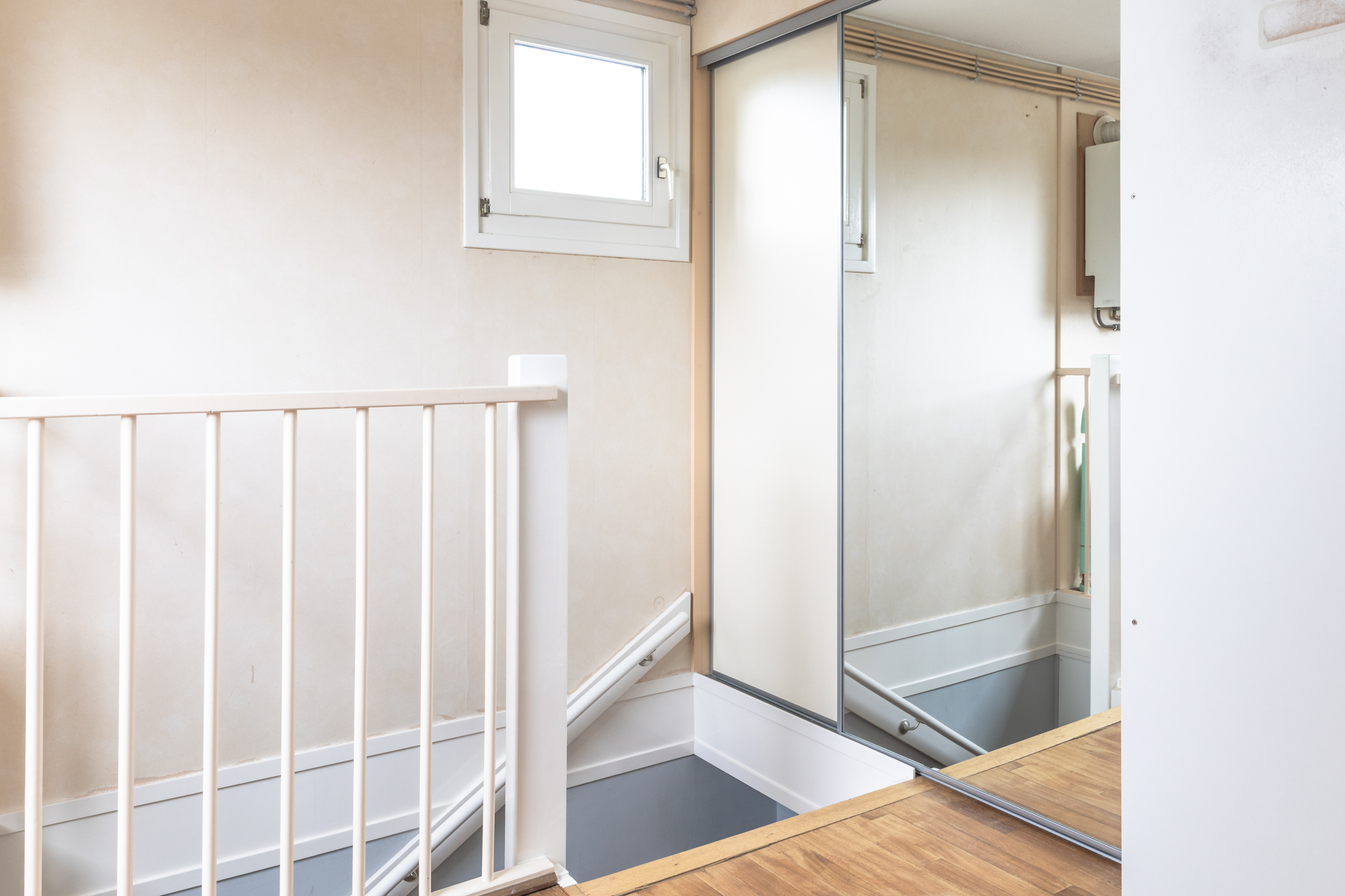 U neemt de trap en komt uit op de overloop met grote inbouwkast met schuifdeuren, de omvormer voor de 12 zonnepanelen (2019), de CV-unit (2010) luchtverwarming (met ombouw geïsoleerd tegen geluid), de badgeiser (2011) en de U betreedt de 3e slaapkamer welke voorzien is van een inbouwkast en van een groot dakraam aan de voorzijde. De vloer is voorzien van parket.