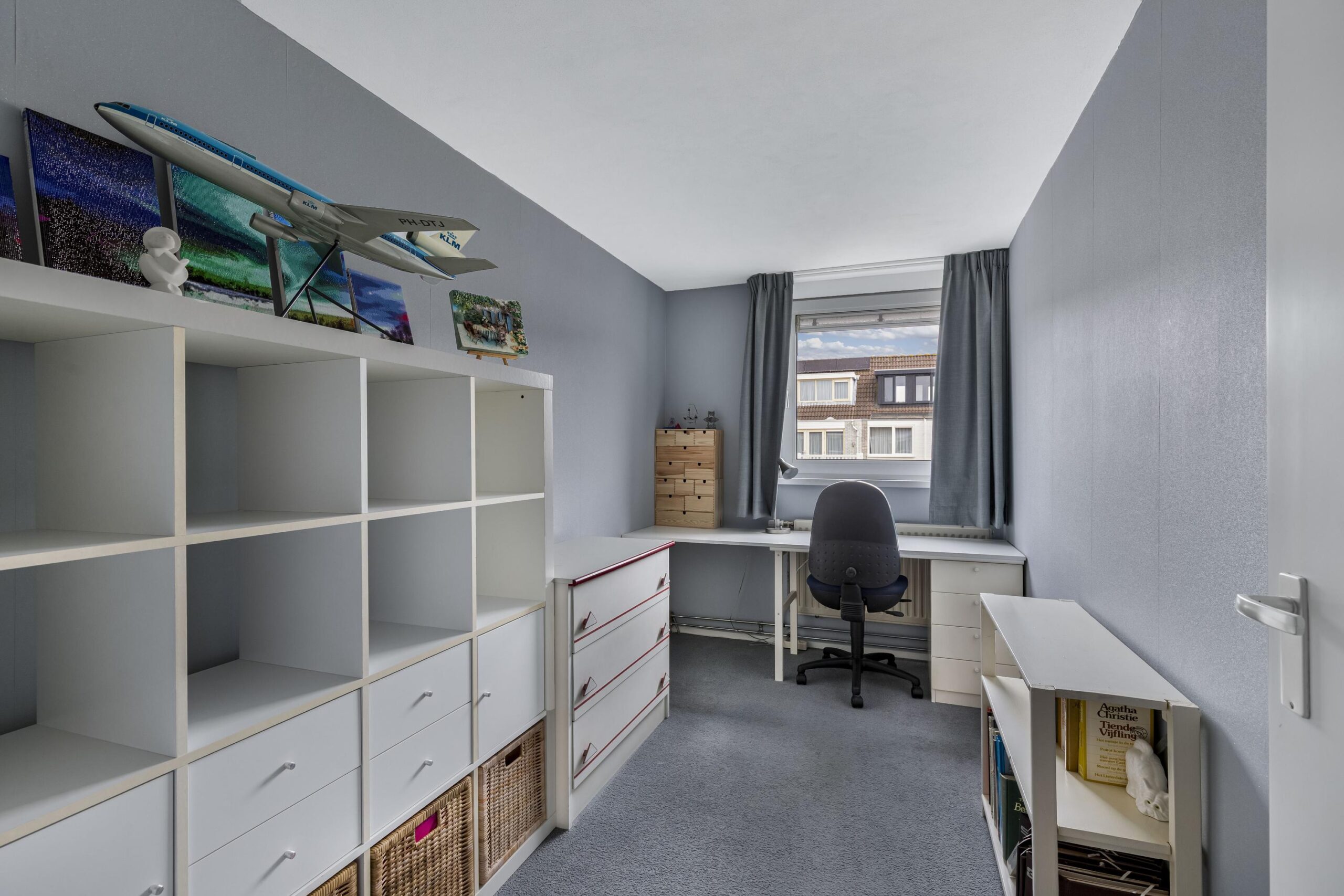 U neemt de trap naar de 2e verdieping waar u uitkomt op de overloop, hier is op dit moment een werkruimte gecreëerd en staat de droger. Vanuit de overloop heeft u toegang tot de slaapkamer met groot dakraam aan de voorzijde. Er is veel bergruimte door de diverse knieschotten en de vliering welke boven de overloop en slaapkamer is gerealiseerd.