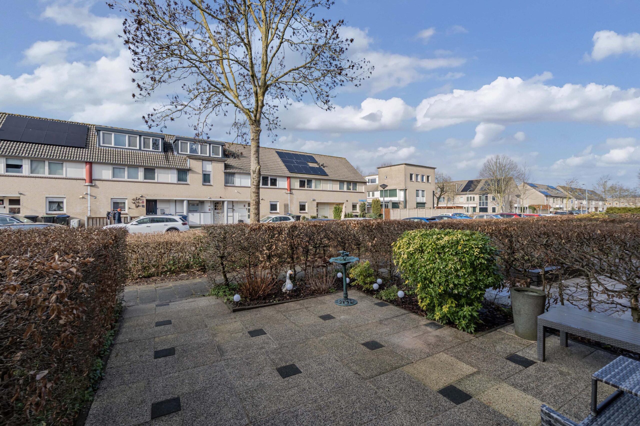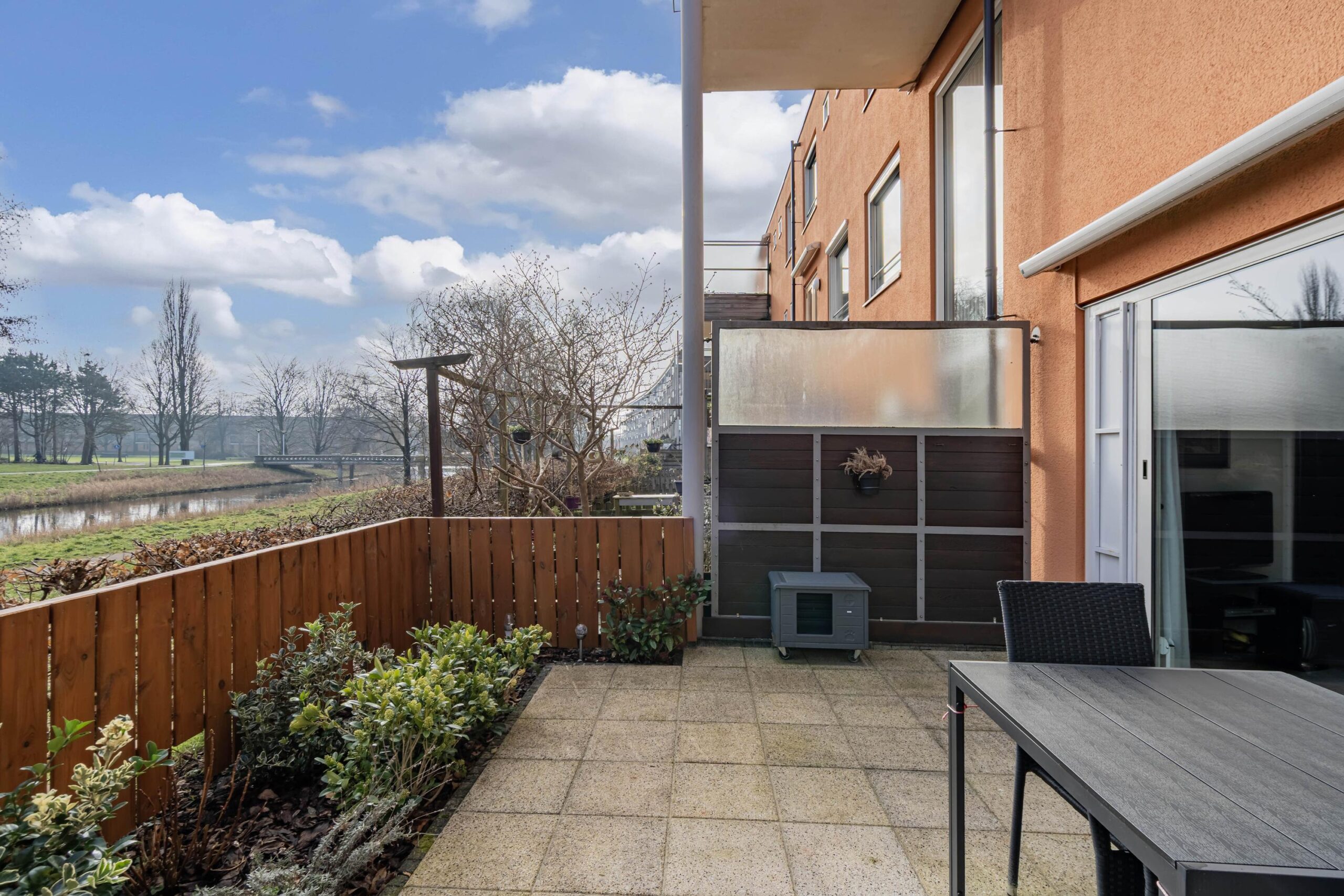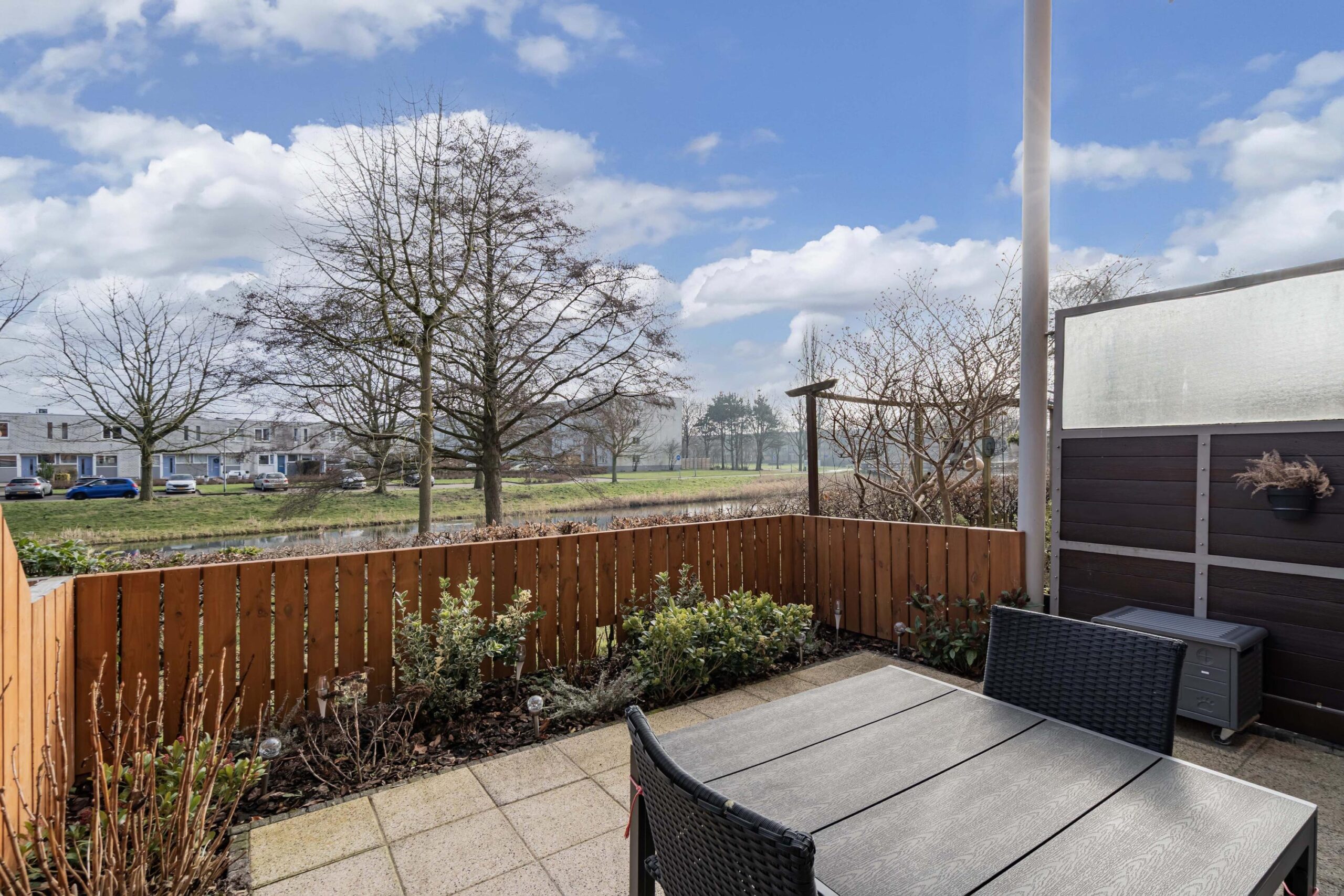 Zowel de voor- als achtertuin zijn keurig aangelegd en goed onderhouden. De achtertuin ligt gunstig op het zuidoosten, waardoor u hier volop van de zon kunt genieten. De tuin is volledig betegeld, omheind met houten schuttingen (schuttingen en tuinhek in augustus in de beits gezet) en biedt een prachtig uitzicht over het water en het omliggende groen. Daarnaast beschikt de tuin over een groot elektrisch zonnescherm (voorzien van een nieuwe motor) en een buitenkraan aan de voor- en achtergevel – perfect voor zomerse dagen en gezellige momenten buiten.