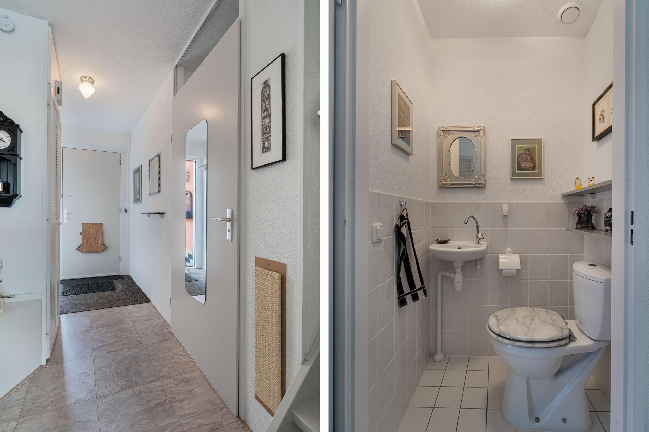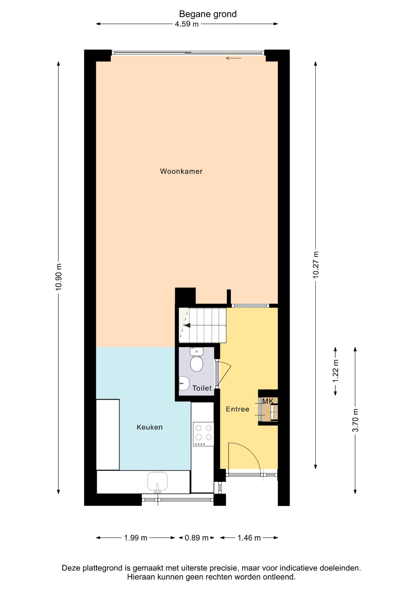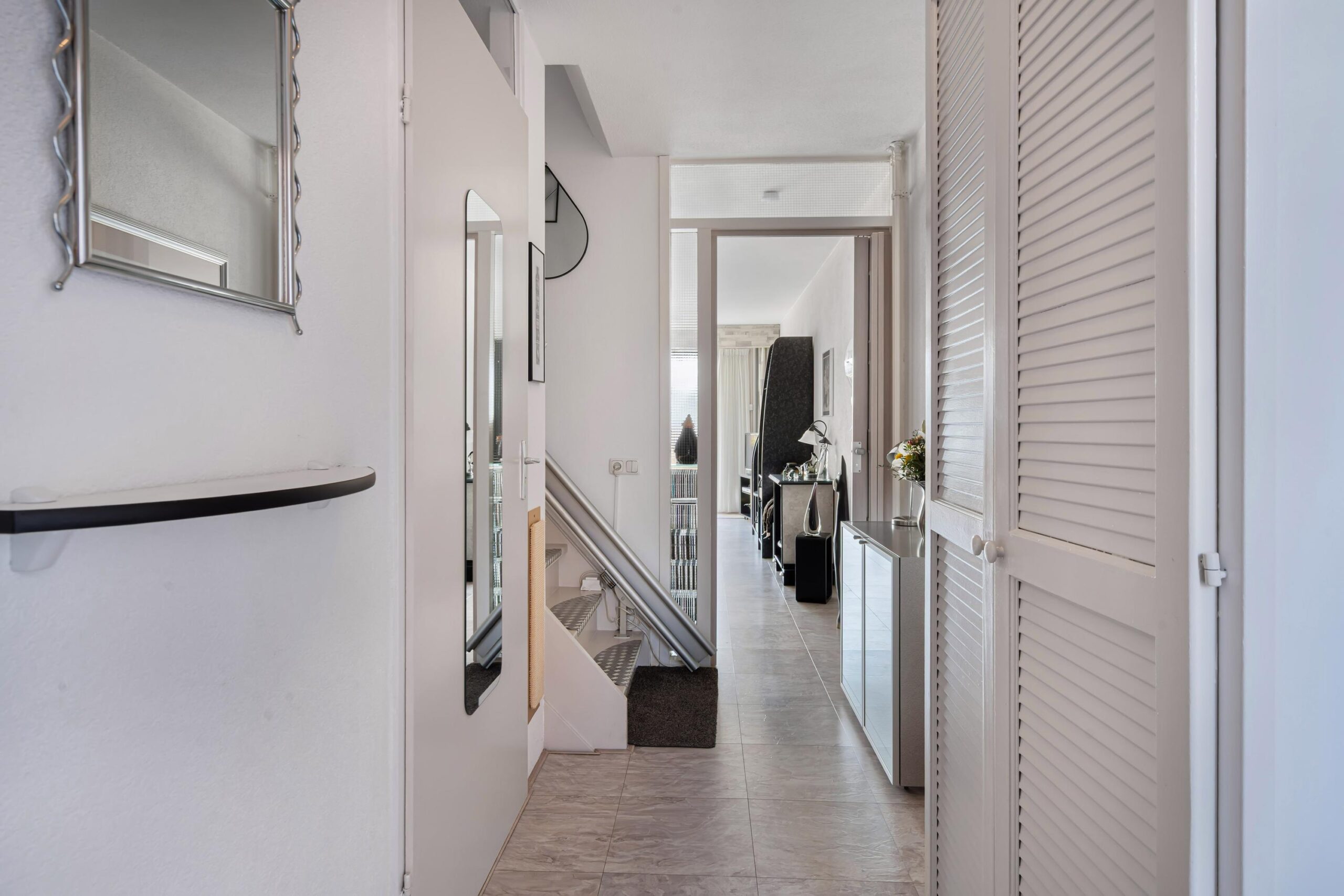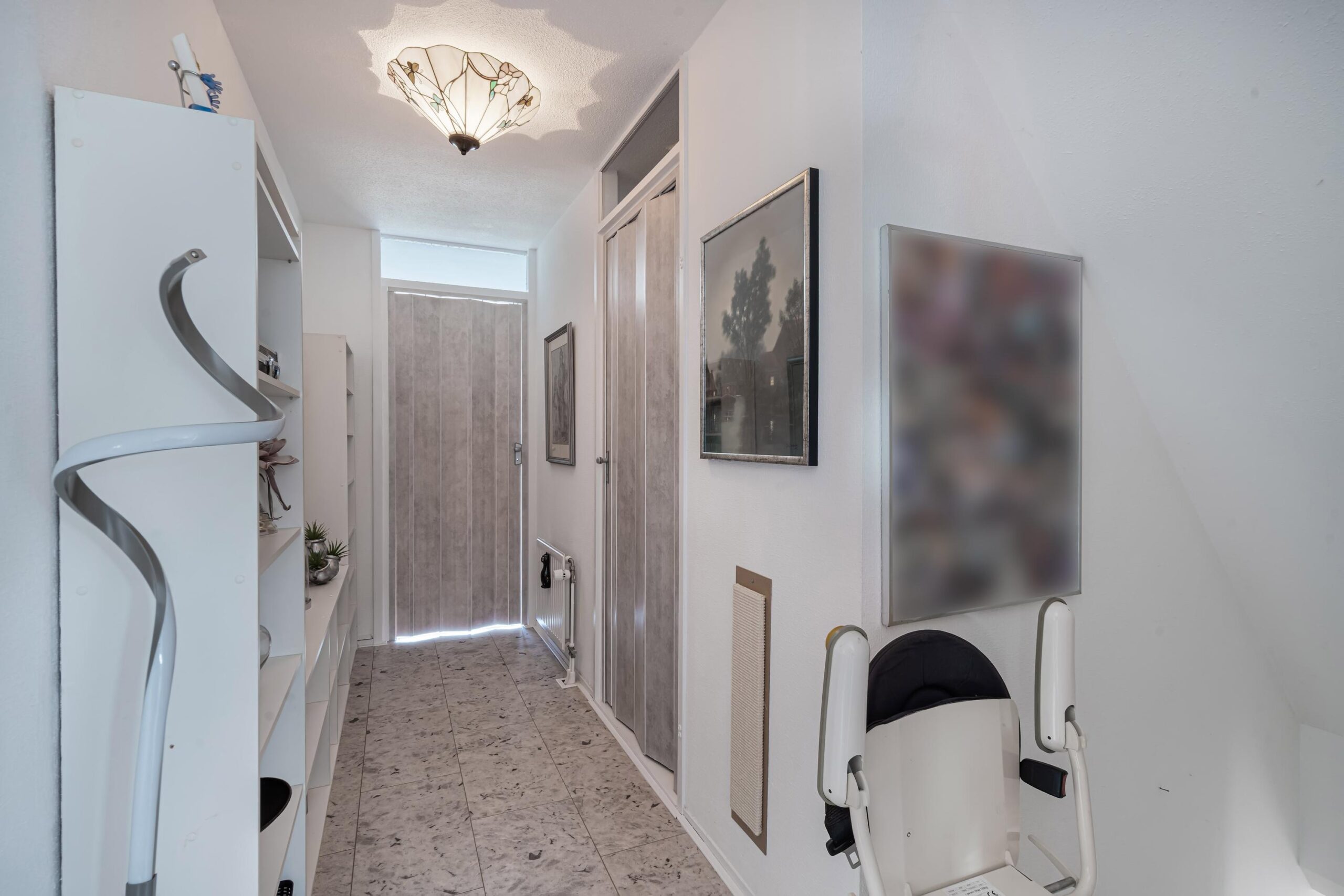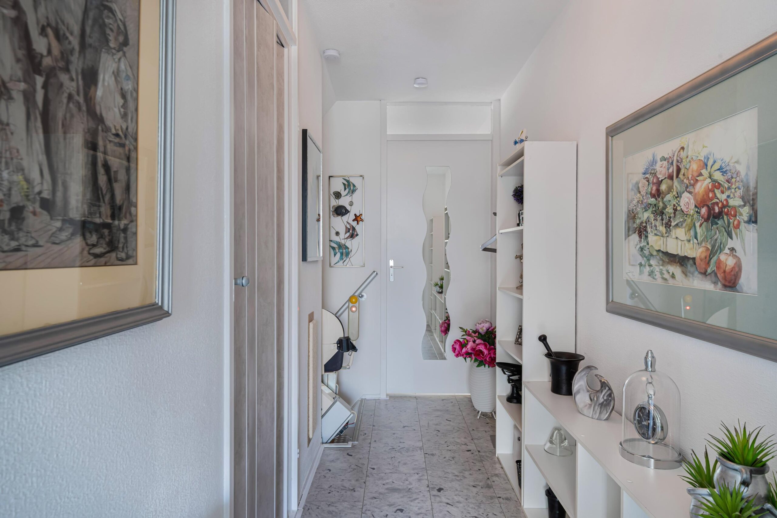 Via de entree komt u binnen in een ruime hal met meterkast, een nette toiletruimte met fonteintje, de trapopgang naar de eerste verdieping en voldoende ruimte voor een garderobe.
