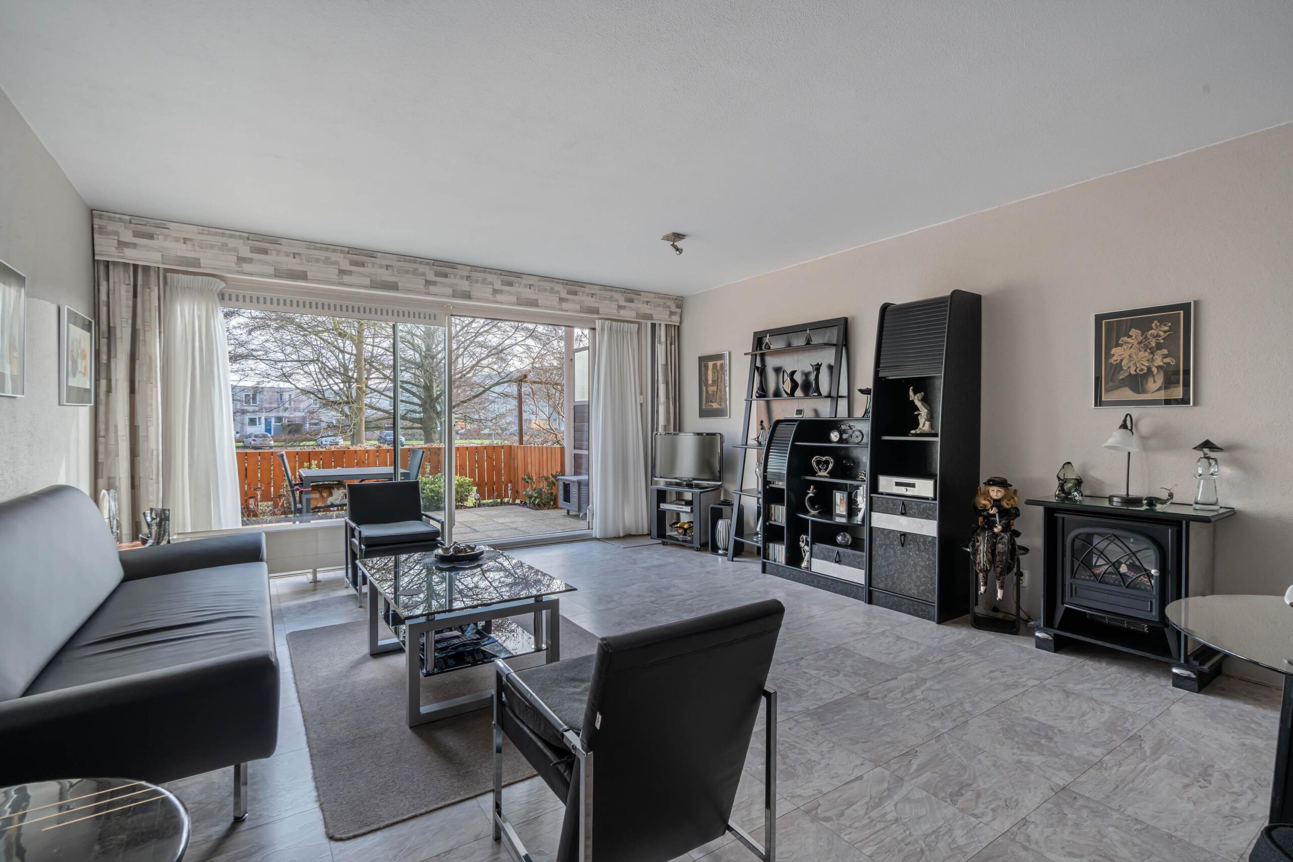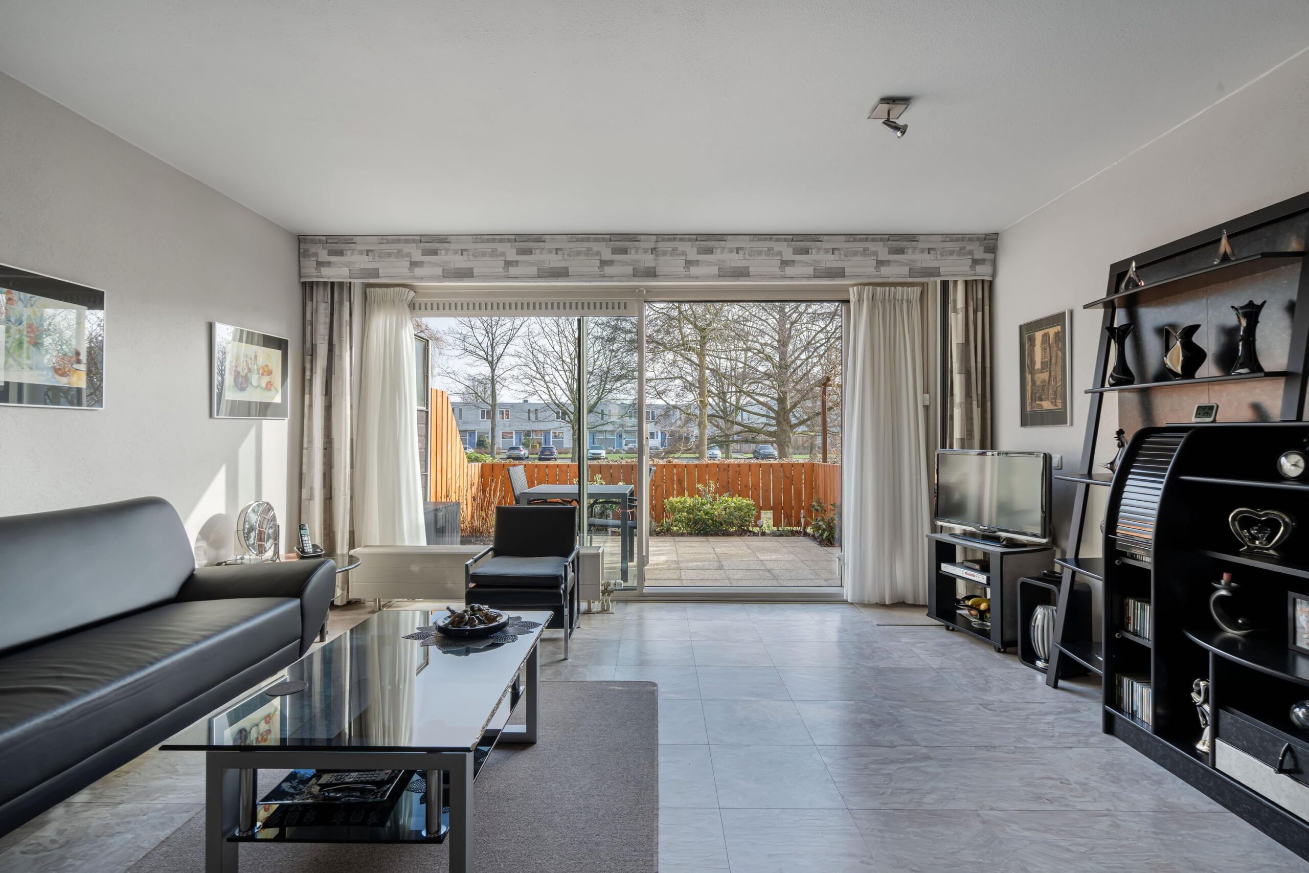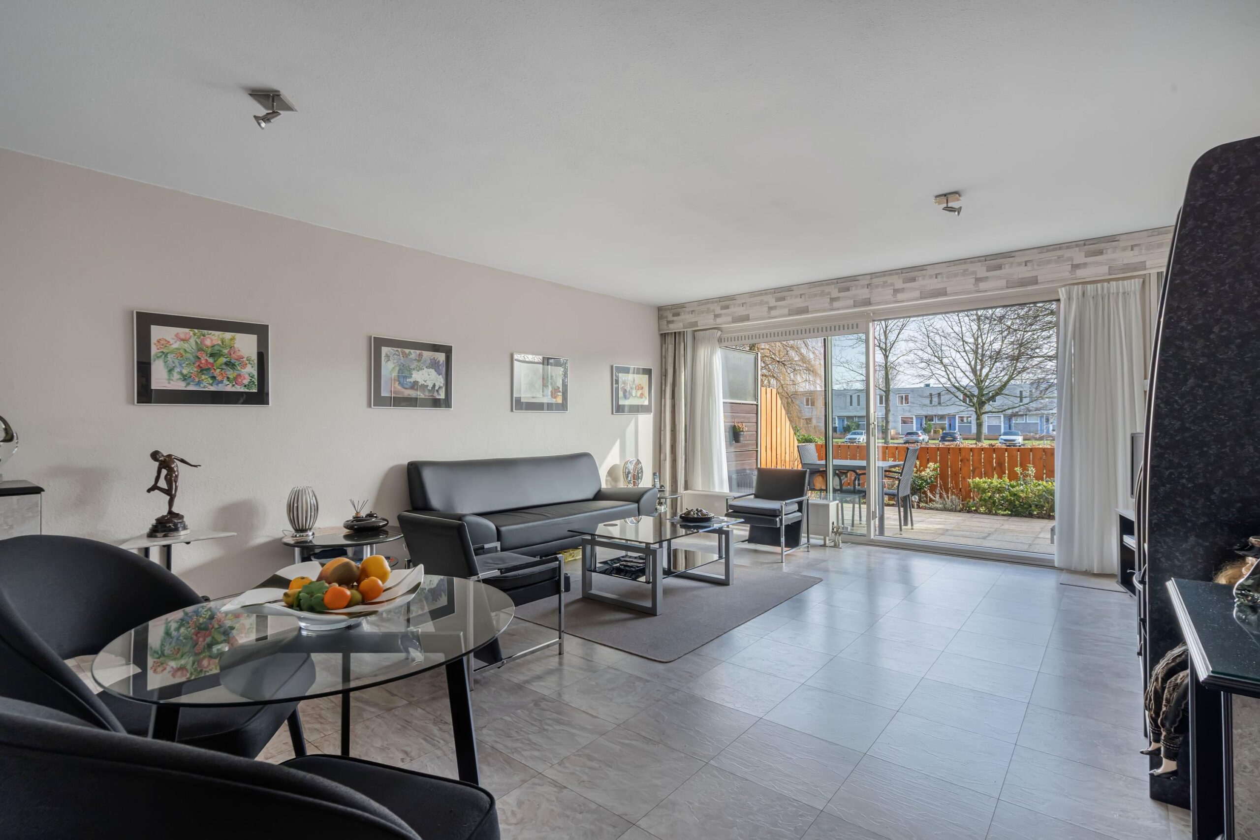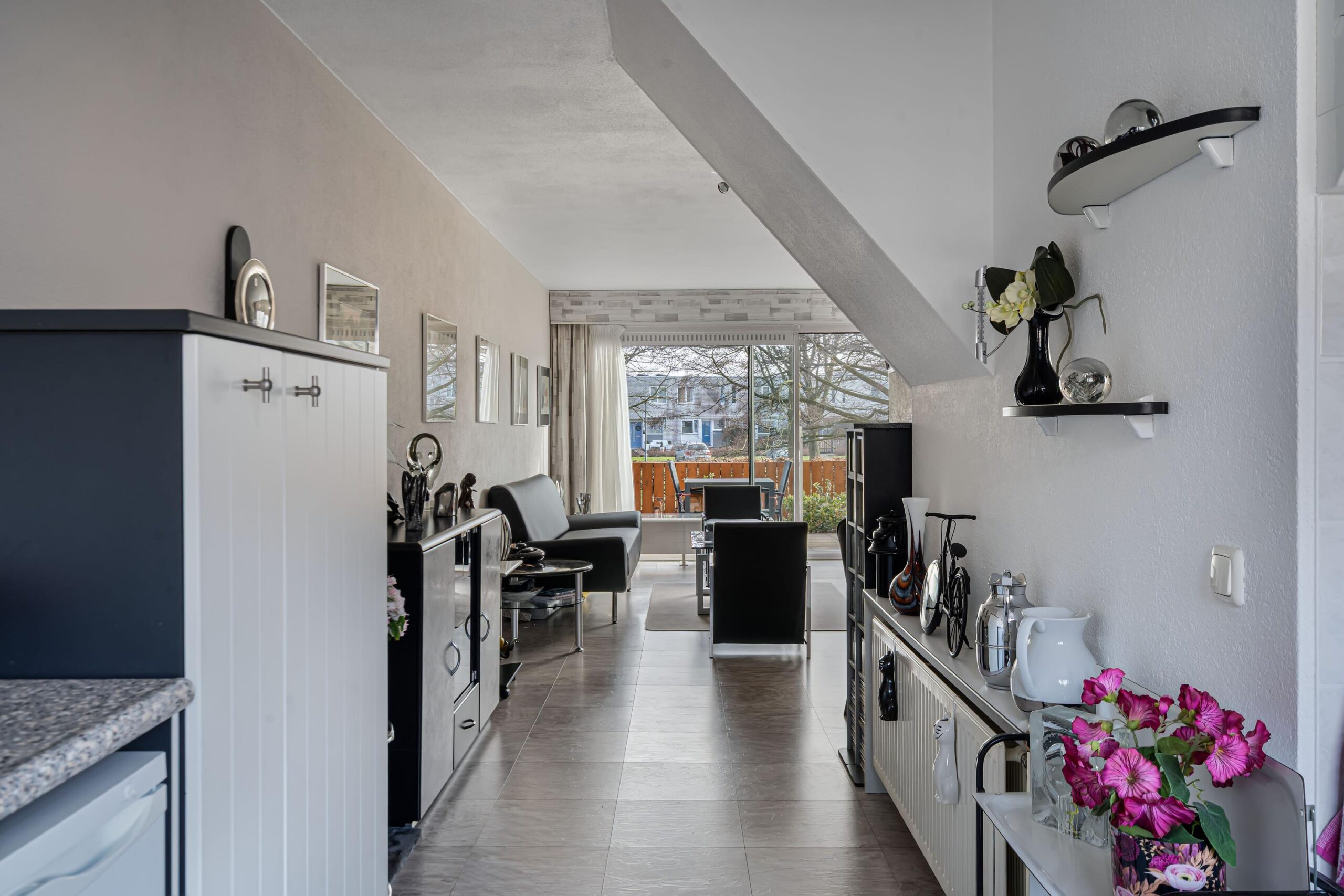 - Lichte woonkamer met grote schuifpui;