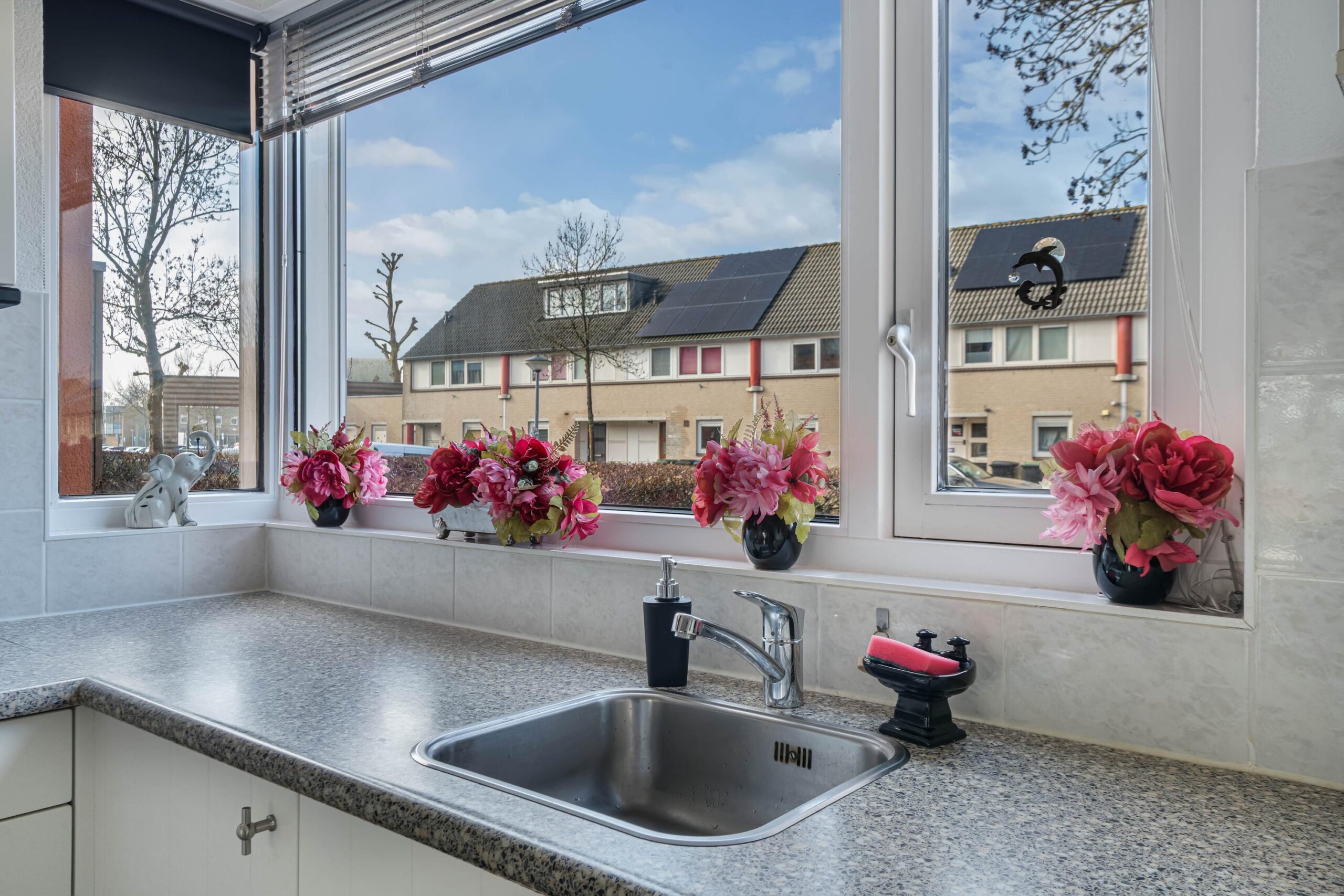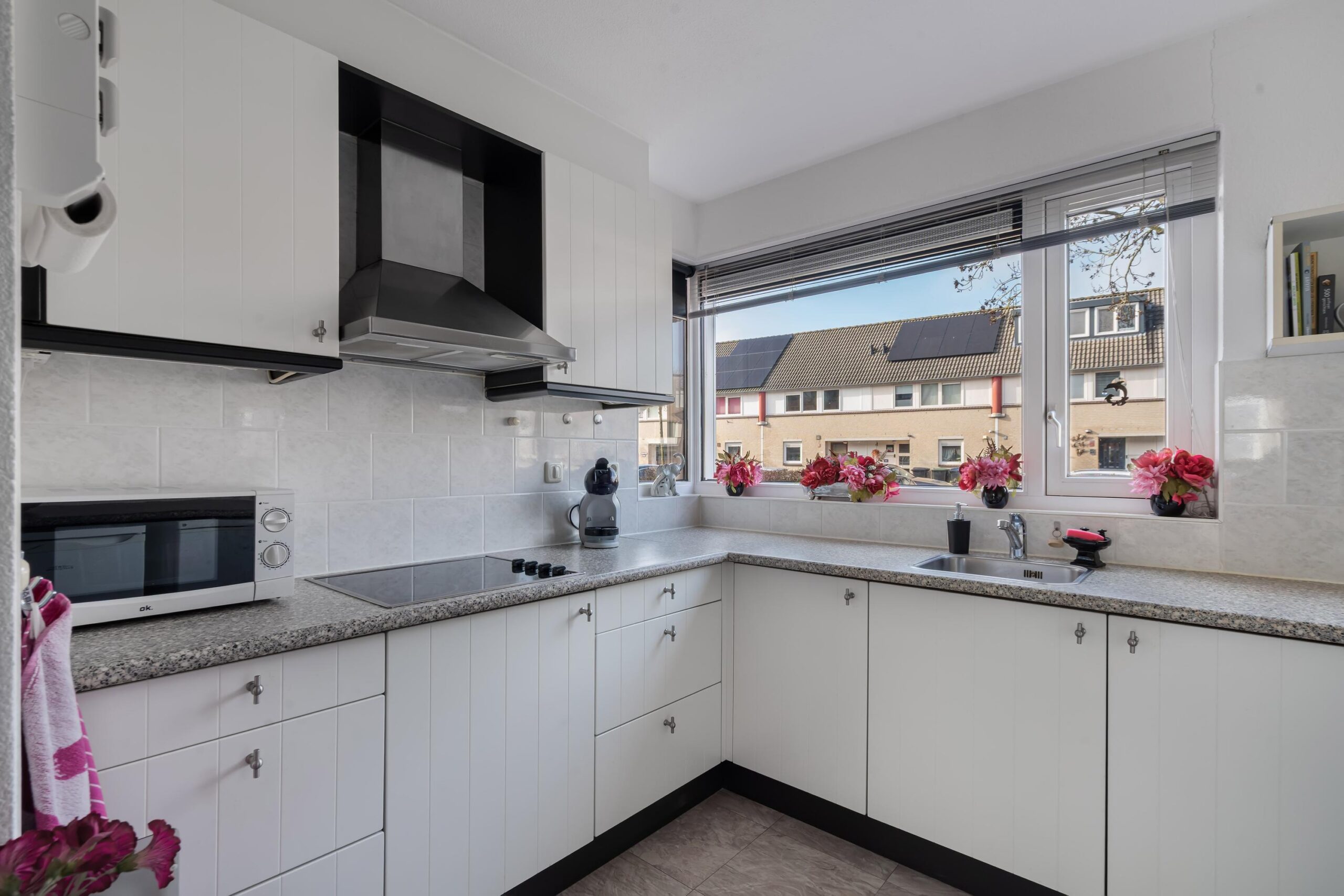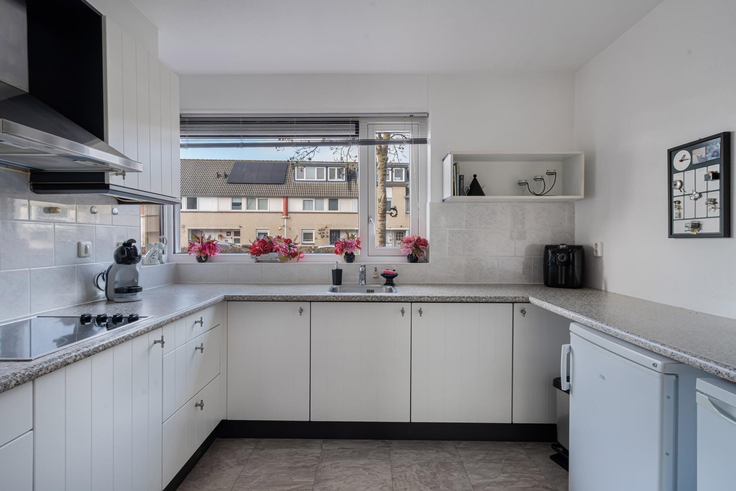 De leefruimte is prettig en logisch ingedeeld. Aan de voorzijde bevindt zich de open keuken, uitgevoerd in een praktische U-opstelling met veel werk- en kastruimte. Het kunststof aanrechtblad is onderhoudsvriendelijk en de keuken is uitgerust met diverse apparatuur, waaronder een keramische kookplaat met afzuigkap, een koelkast en een vriezer. Dankzij de nieuwe screens bij het keukenraam geniet u hier van extra comfort en privacy.