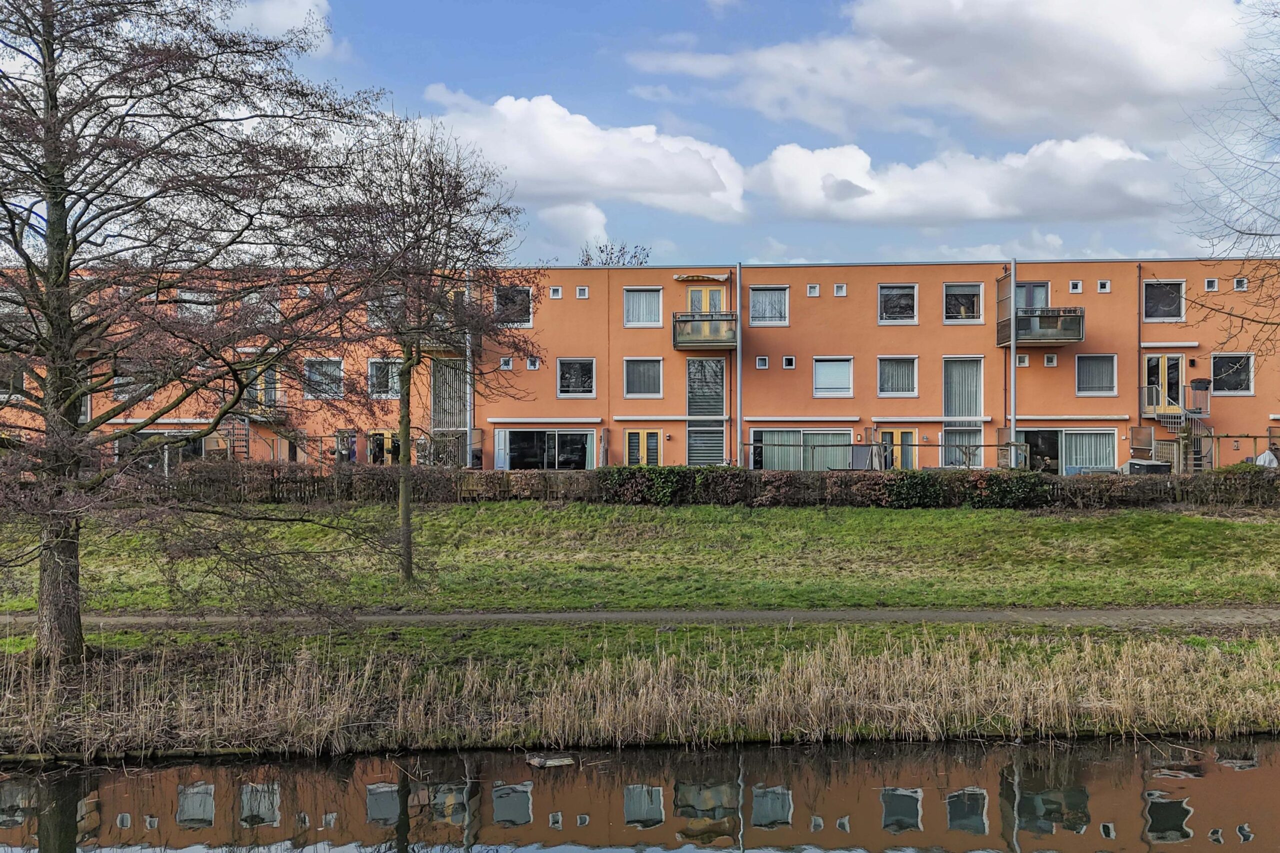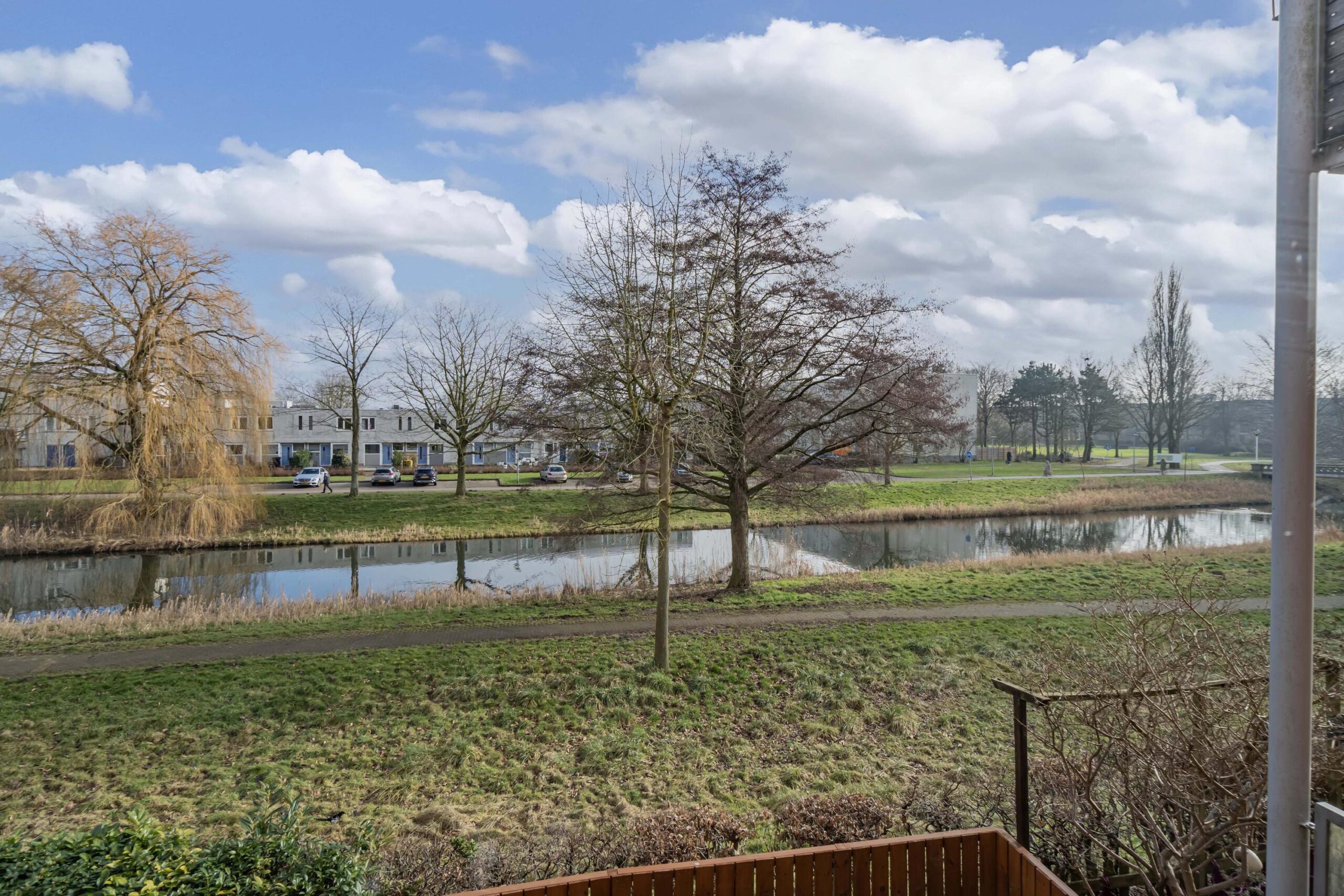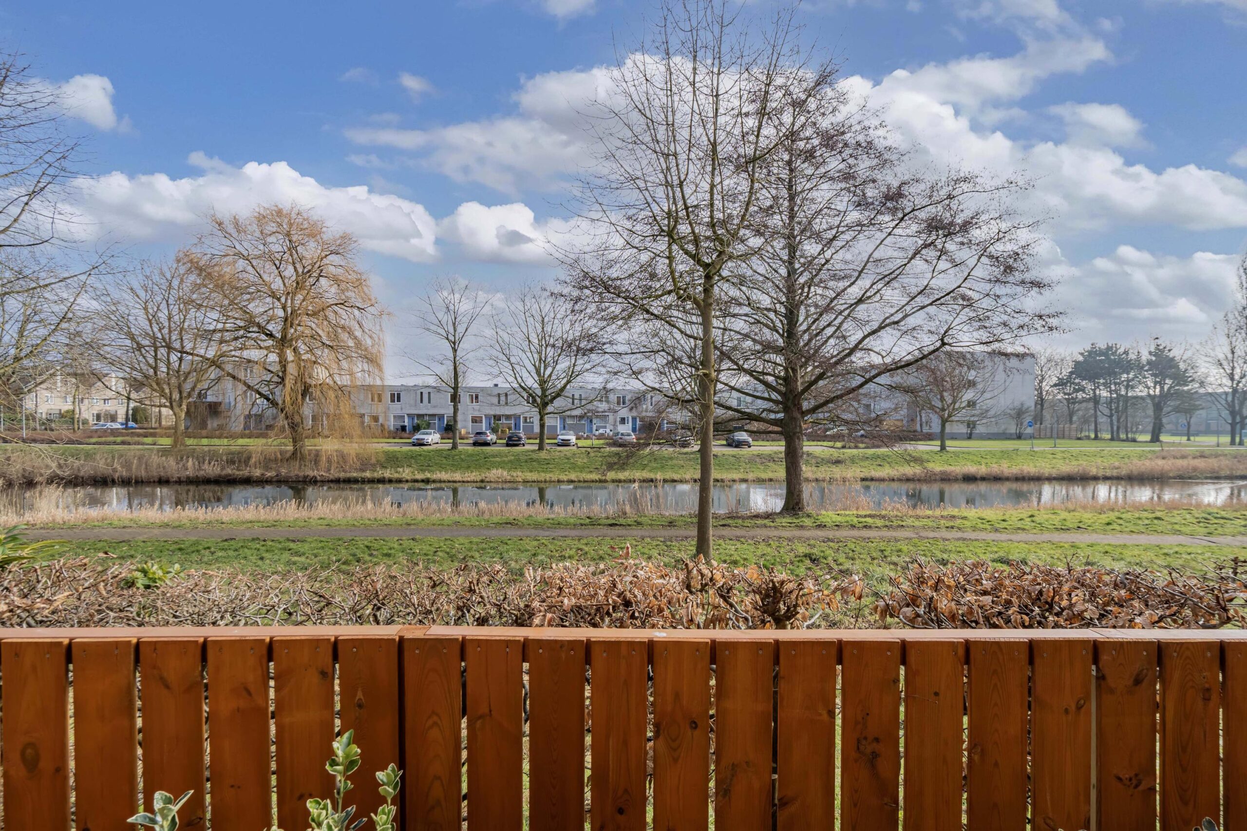 Aan de achterzijde van de woning ligt de ruime en lichte woonkamer. De grote schuifpui zorgt voor een mooie lichtinval en een directe verbinding met buiten. Vanuit de woonkamer kijkt u uit over de tuin, het water en het groen van het Muzenpark – een uitzicht dat elk seizoen weer anders en bijzonder is. De gehele begane grond is afgewerkt met een nette laminaatvloer, wat zorgt voor een rustige en verzorgde uitstraling.