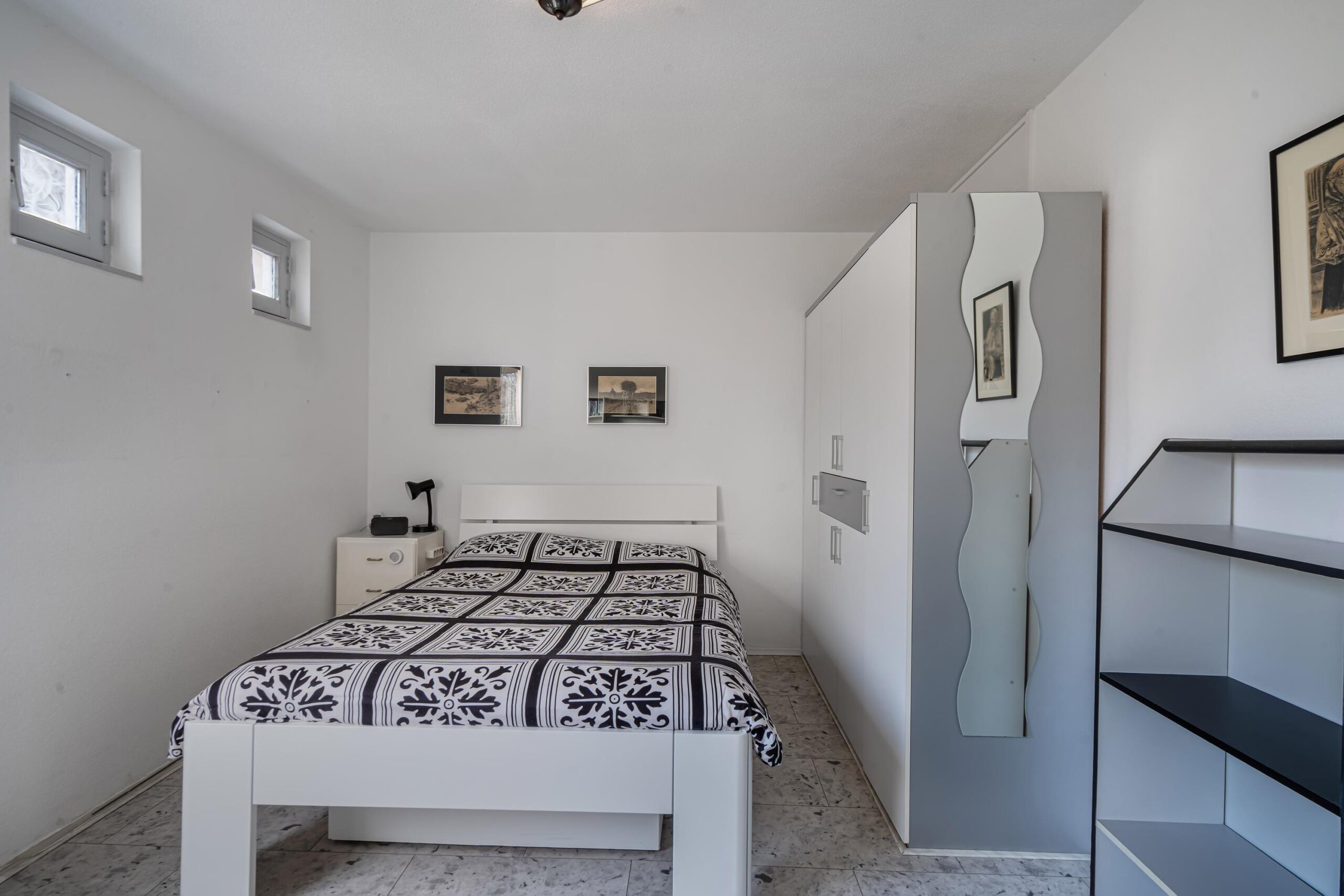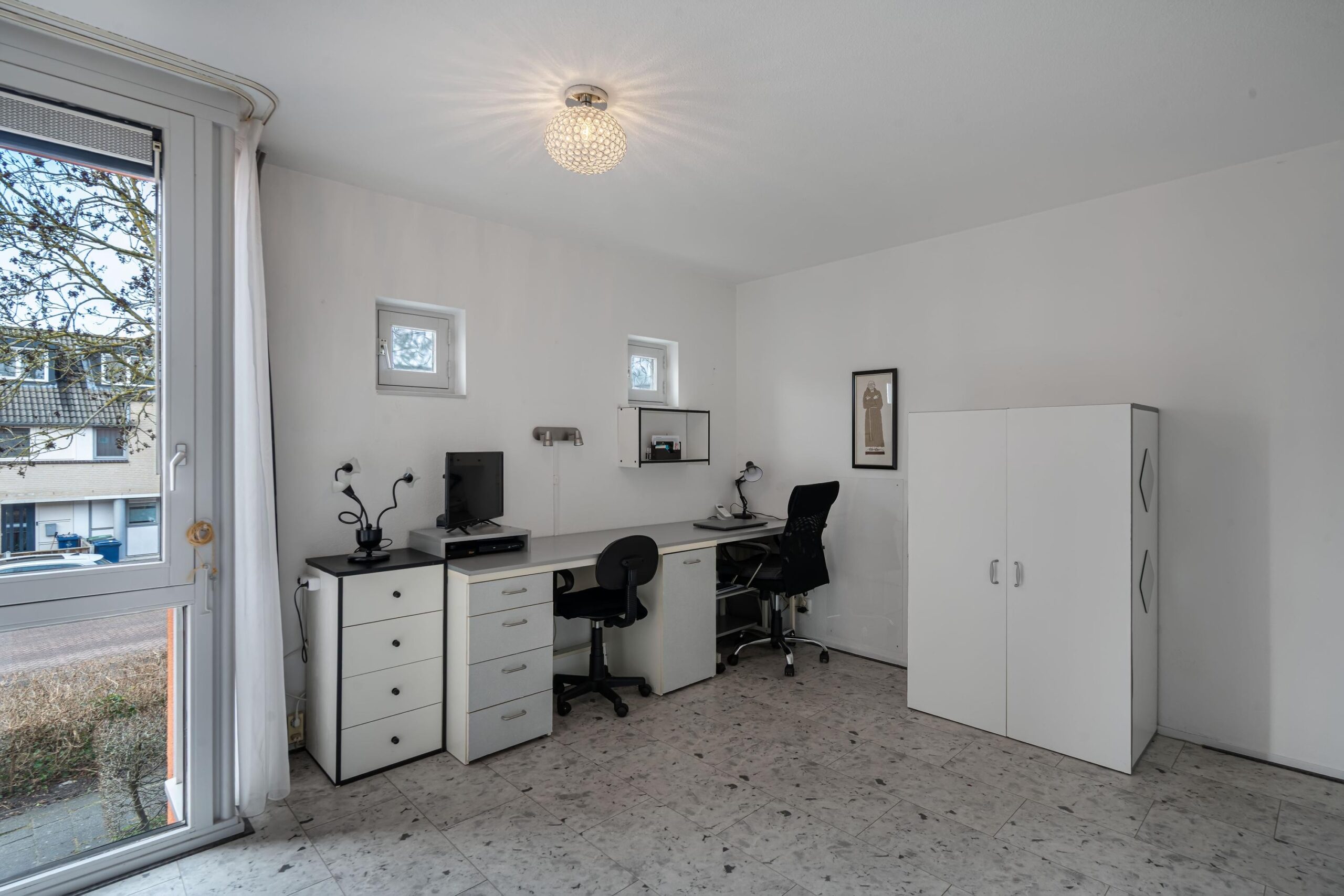 De tweede slaapkamer, gelegen aan de achterzijde, biedt een prachtig en vrij uitzicht over het park en het water. Deze kamer kan desgewenst eenvoudig weer worden verbonden met de walk-in closet. Op de gehele verdieping ligt een nette laminaatvloer en zijn luxe, op maat gemaakte vouwdeuren geplaatst. Voor extra wooncomfort zijn alle kleinere ramen voorzien van horren.