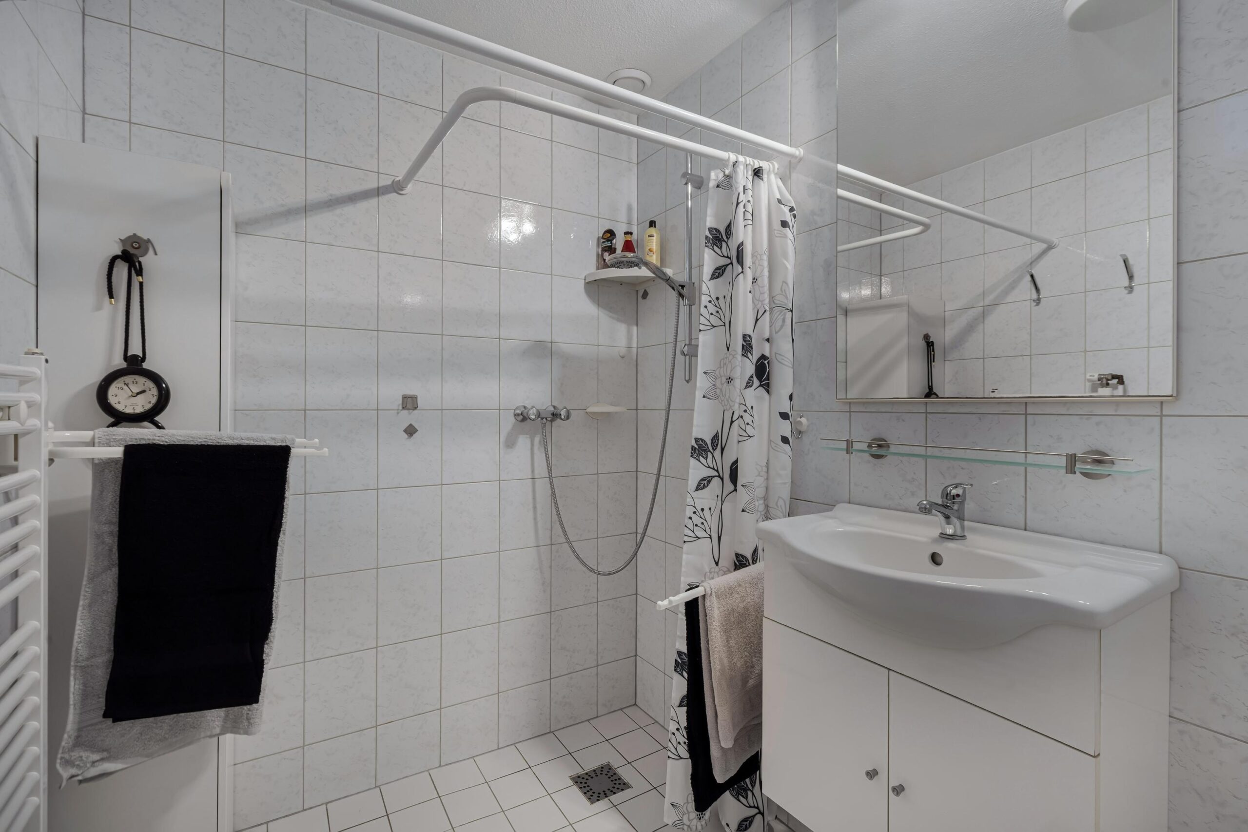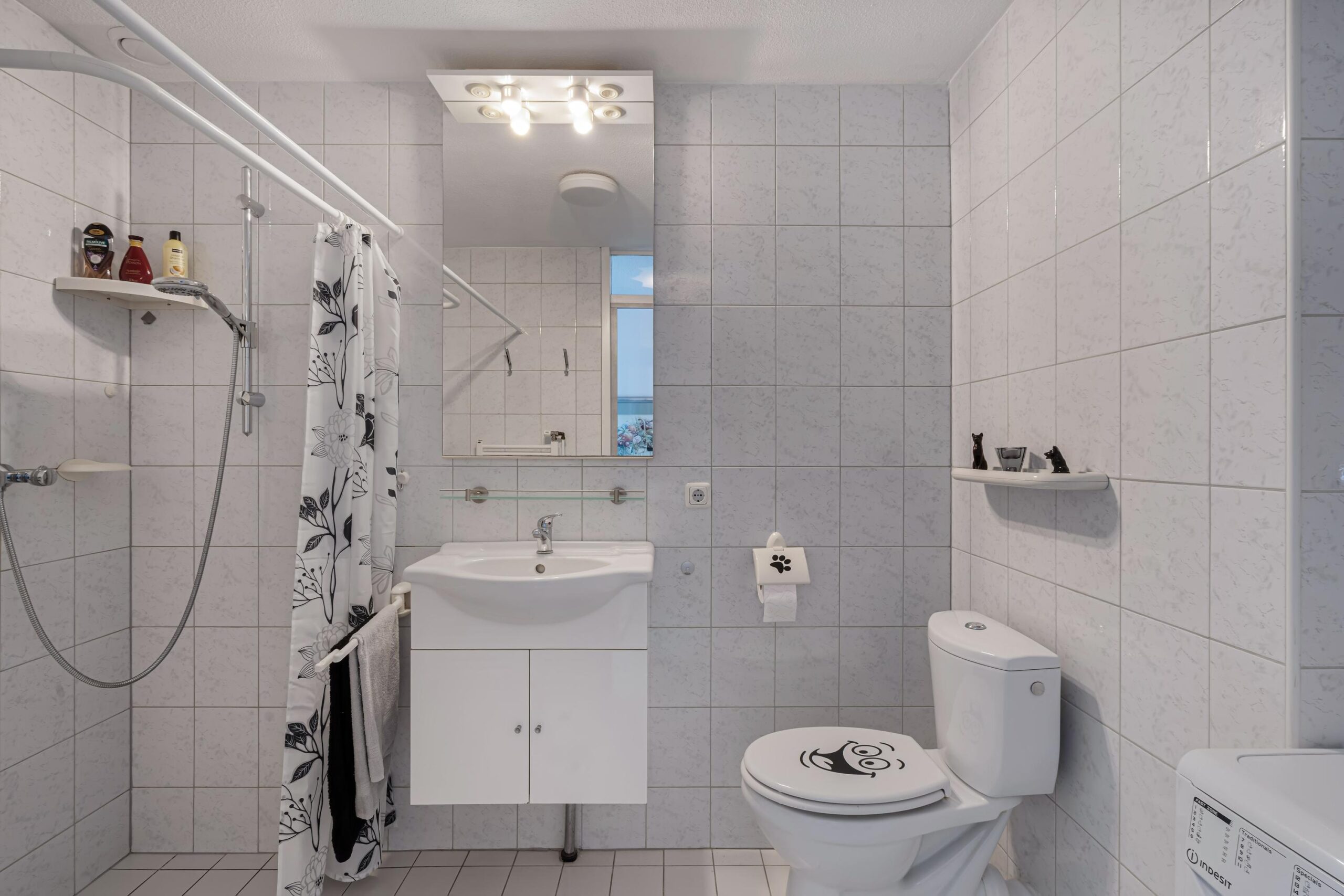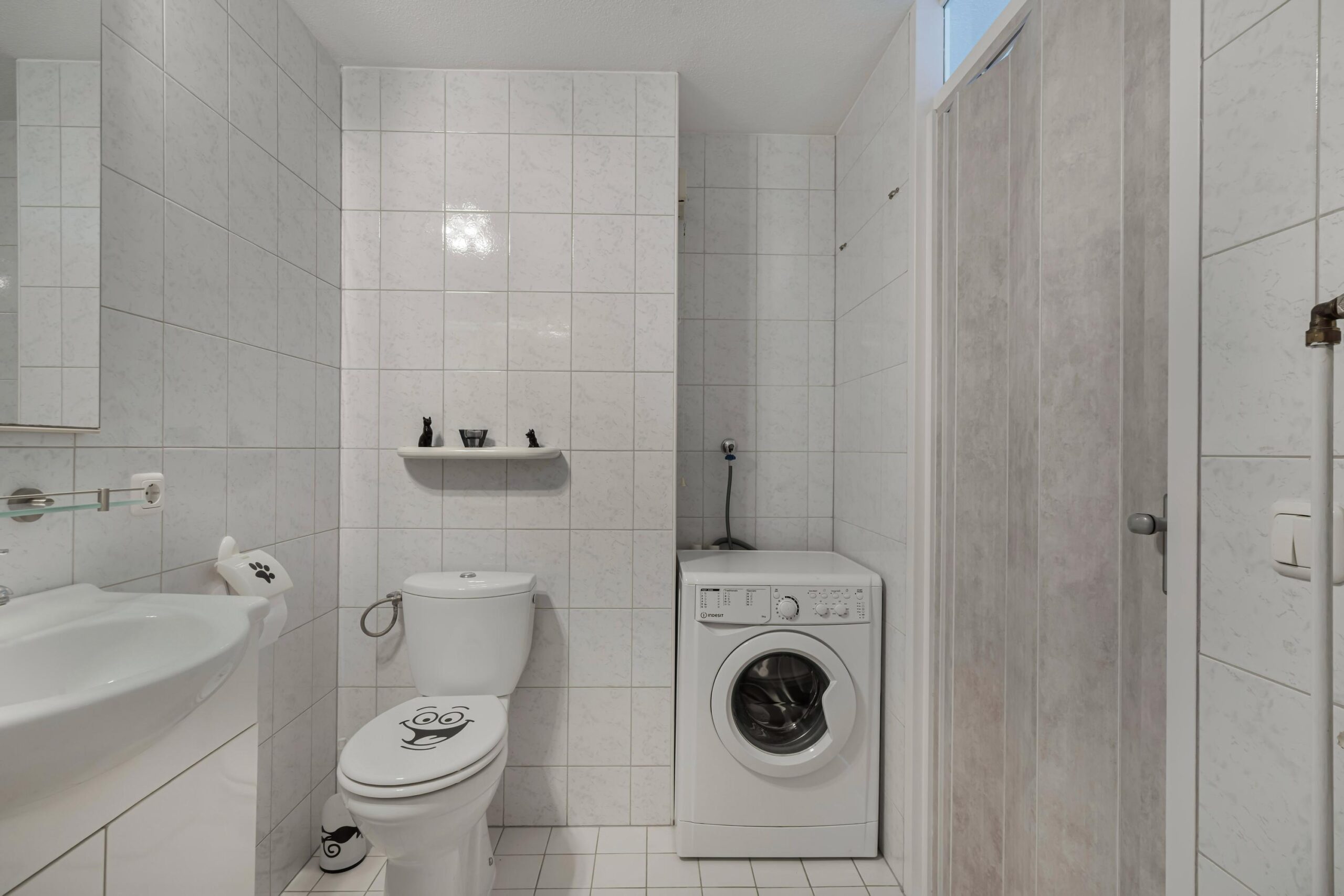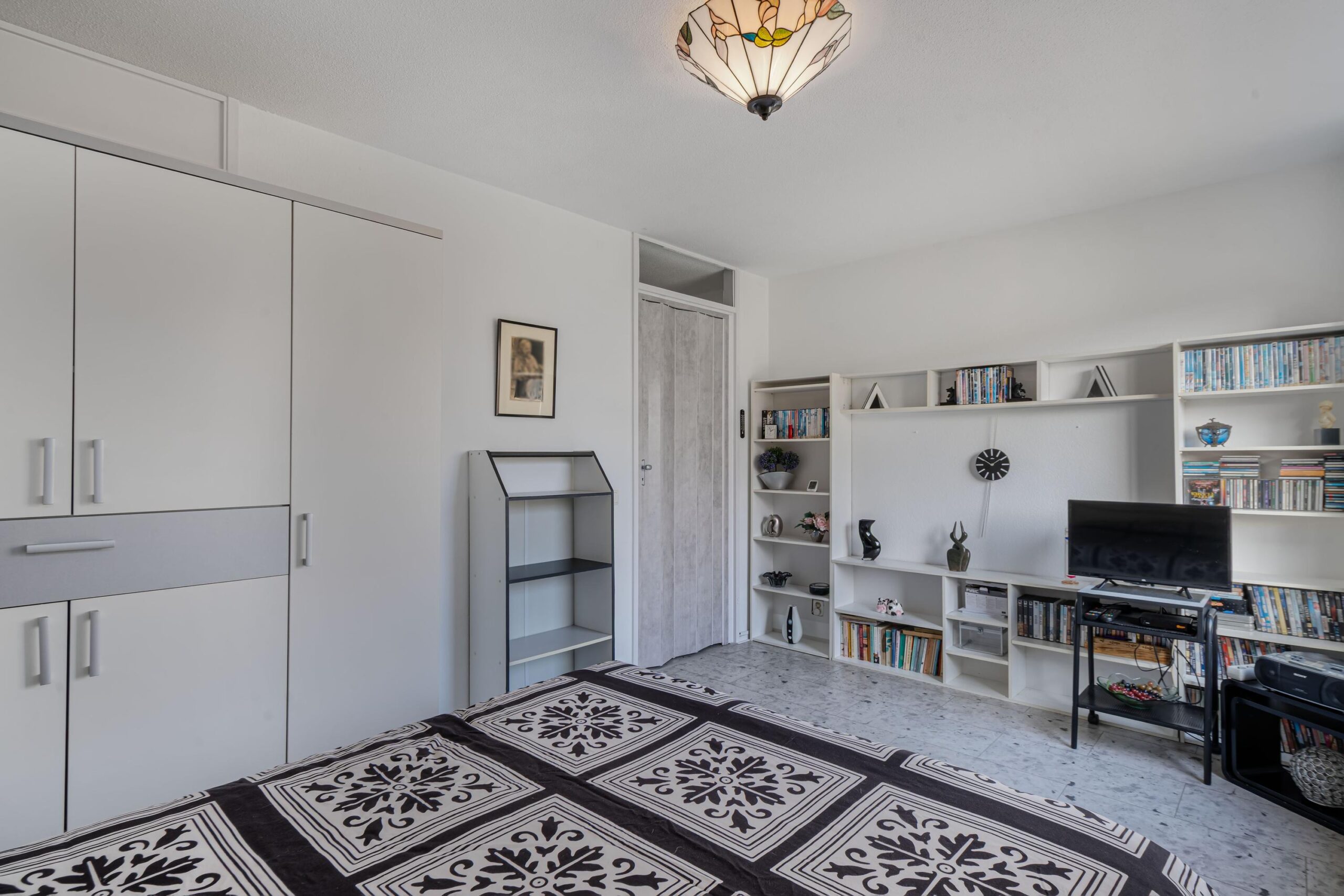 De slaapkamer aan de voorzijde is royaal van formaat en beschikt over een praktische walk-in closet, ideaal voor extra bergruimte. De badkamer is centraal in de woning gelegen en volledig tot aan het plafond betegeld. Deze is voorzien van een inloopdouche, wastafel, tweede toilet en de aansluiting voor de wasmachine.