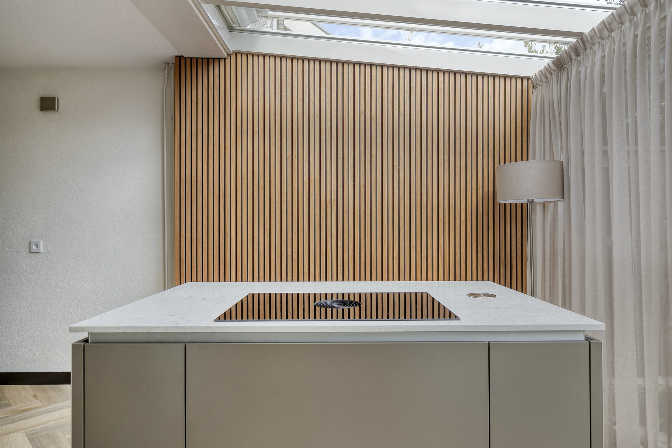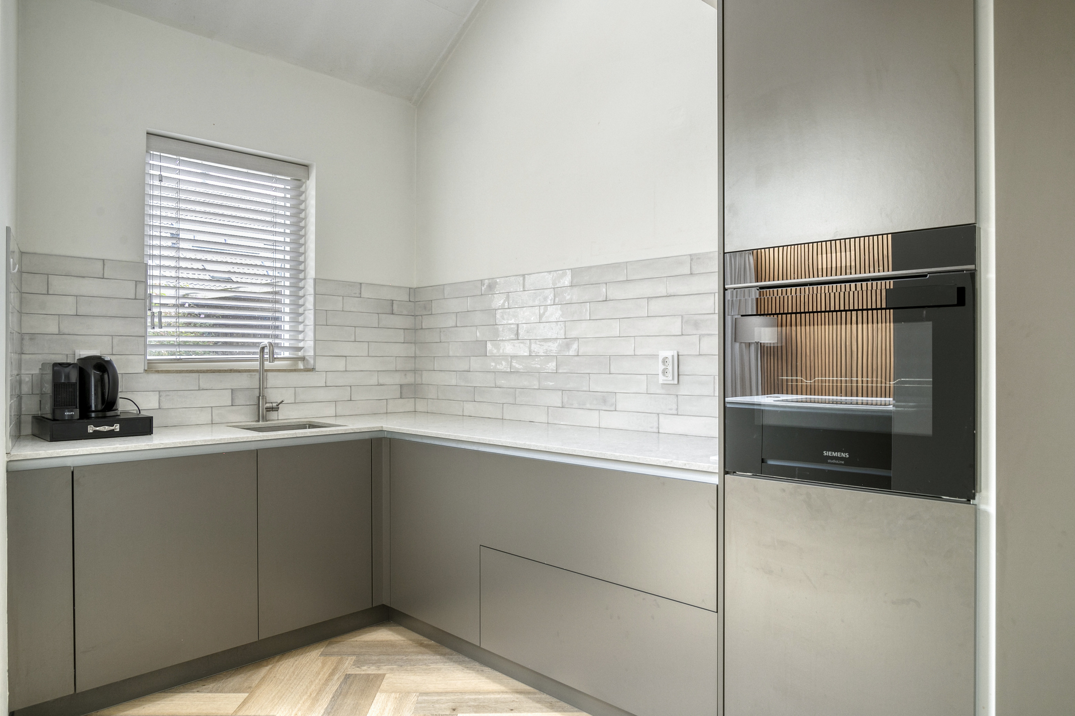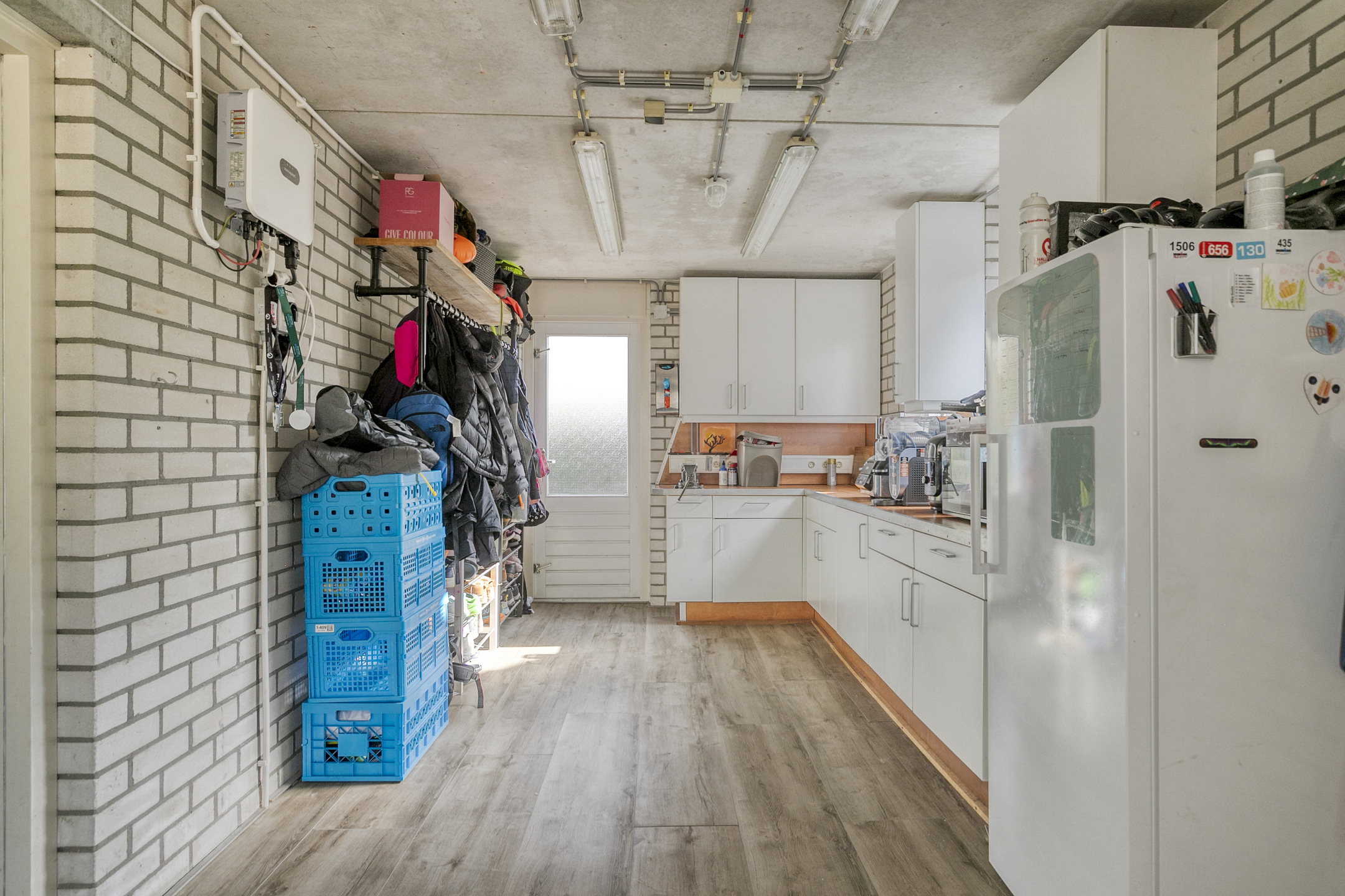 De keuken beschikt over een kookeiland met een luxe composiet werkblad met ingebouwde BORA kookplaats met geïntegreerde afzuiging, veel kastruimte en stopcontacten. Aan de andere zijde is de keuken in een hoekopstelling voorzien van inbouwapparatuur waaronder de vaatwasser, een zeer grote koelkast met freshzones, een oven met zelfreinigende functie (Siemens Studioline) en diverse kastruimtes en grote lades. Naast de keuken is de toegang tot de bijkeuken. In de bijkeuken bevindt zich de aansluiting voor de wasmachine en droger en heeft u toegang tot de voormalige garage. In de garage is een pui en een loopdeur geplaatst en staat een groot keukenblok welke u goed kunt gebruiken als hobbyruimte. Hier vindt u tevens de omvormer voor de 10 zonnepanelen (2024). Er is een laminaatvloer gelegd en er is een aansluiting voor de buitenkraan. Via de garage heeft u toegang tot de achtertuin.