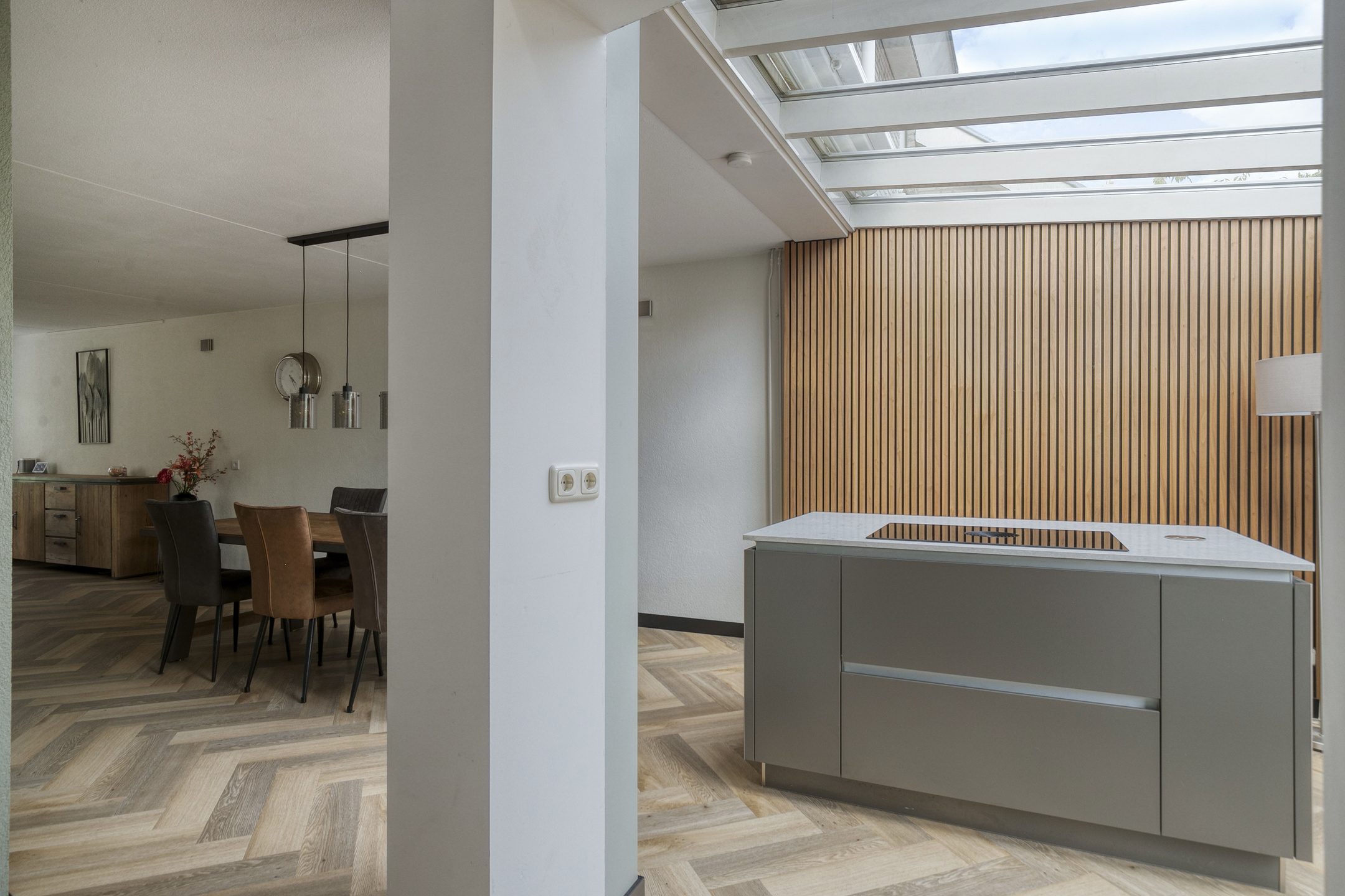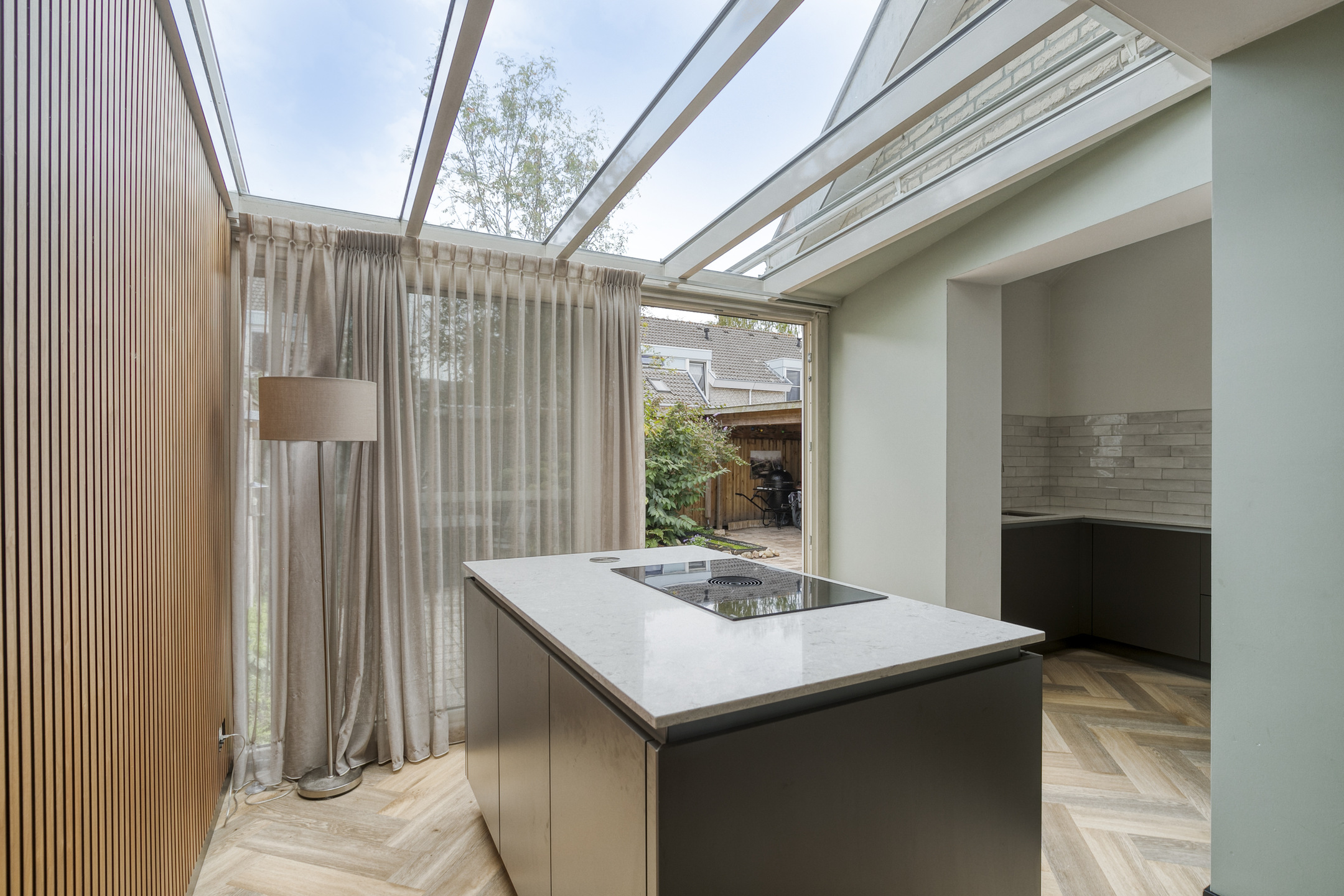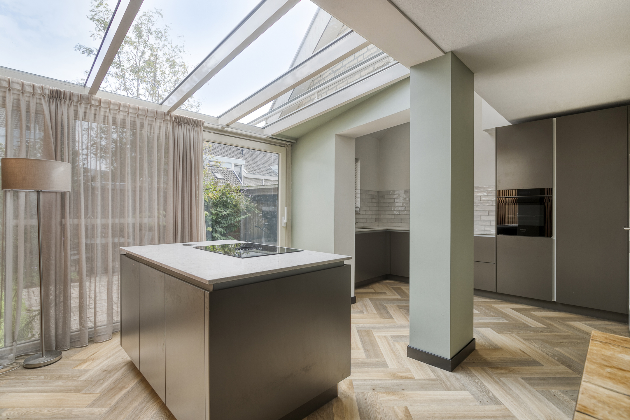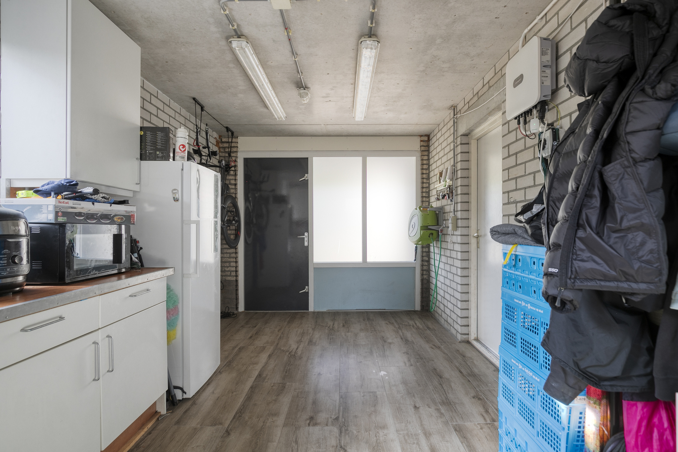 De keuken beschikt over een kookeiland met een luxe composiet werkblad met ingebouwde BORA kookplaats met geïntegreerde afzuiging, veel kastruimte en stopcontacten. Aan de andere zijde is de keuken in een hoekopstelling voorzien van inbouwapparatuur waaronder de vaatwasser, een zeer grote koelkast met freshzones, een oven met zelfreinigende functie (Siemens Studioline) en diverse kastruimtes en grote lades. Naast de keuken is de toegang tot de bijkeuken. In de bijkeuken bevindt zich de aansluiting voor de wasmachine en droger en heeft u toegang tot de voormalige garage. In de garage is een pui en een loopdeur geplaatst en staat een groot keukenblok welke u goed kunt gebruiken als hobbyruimte. Hier vindt u tevens de omvormer voor de 10 zonnepanelen (2024). Er is een laminaatvloer gelegd en er is een aansluiting voor de buitenkraan. Via de garage heeft u toegang tot de achtertuin.