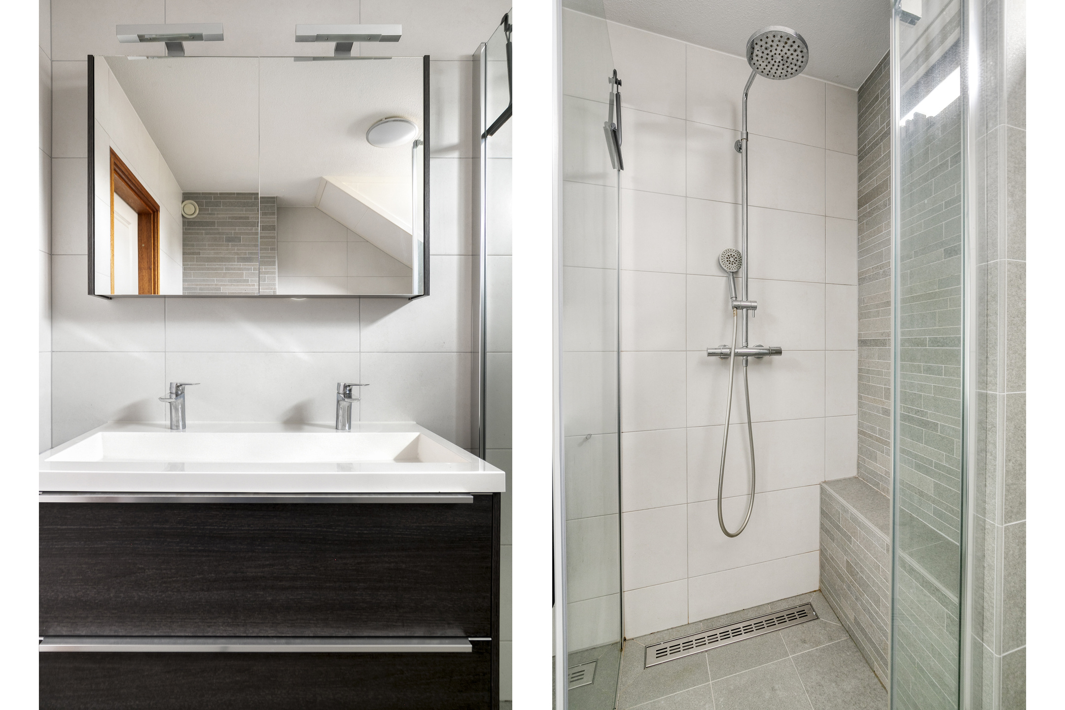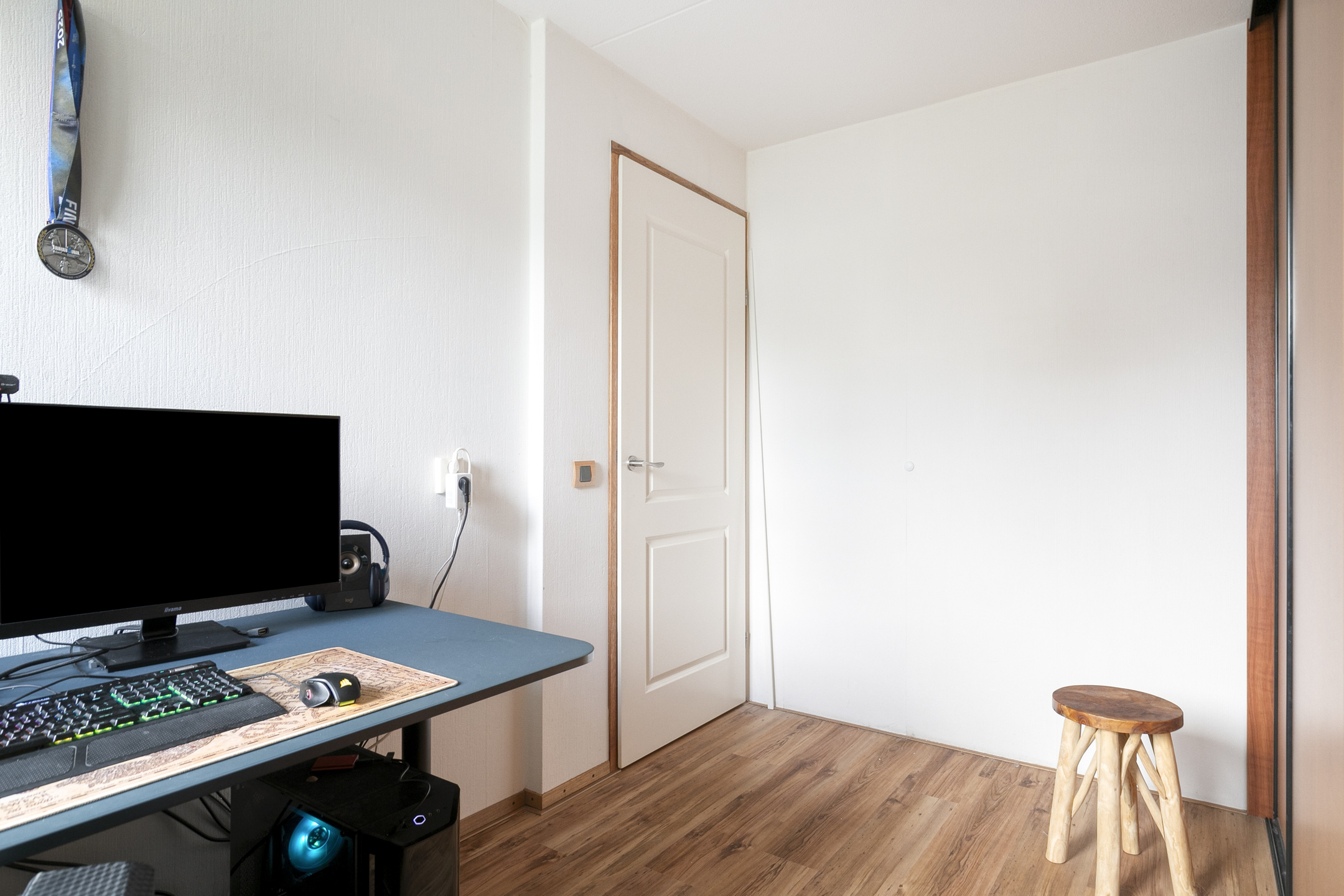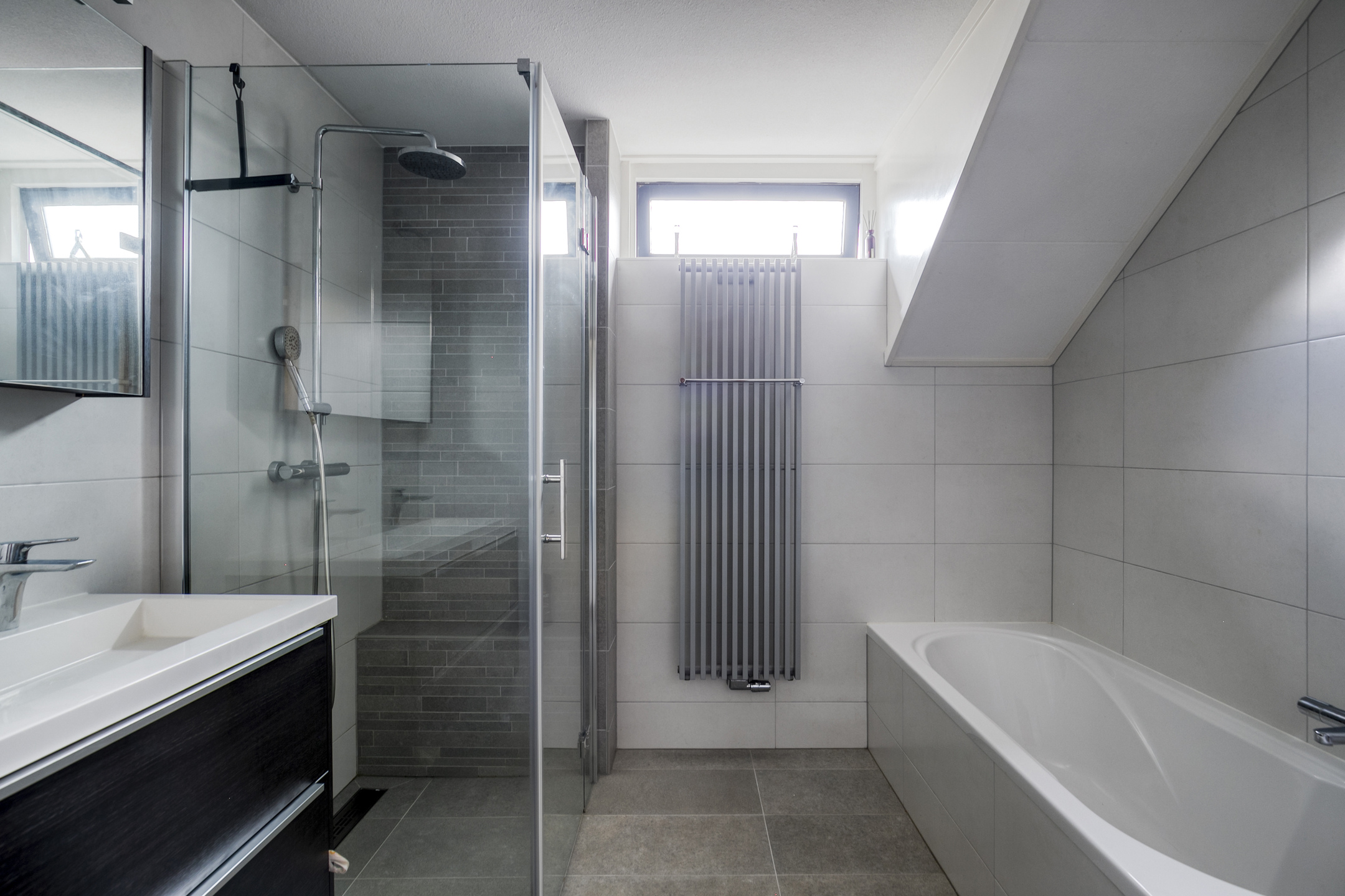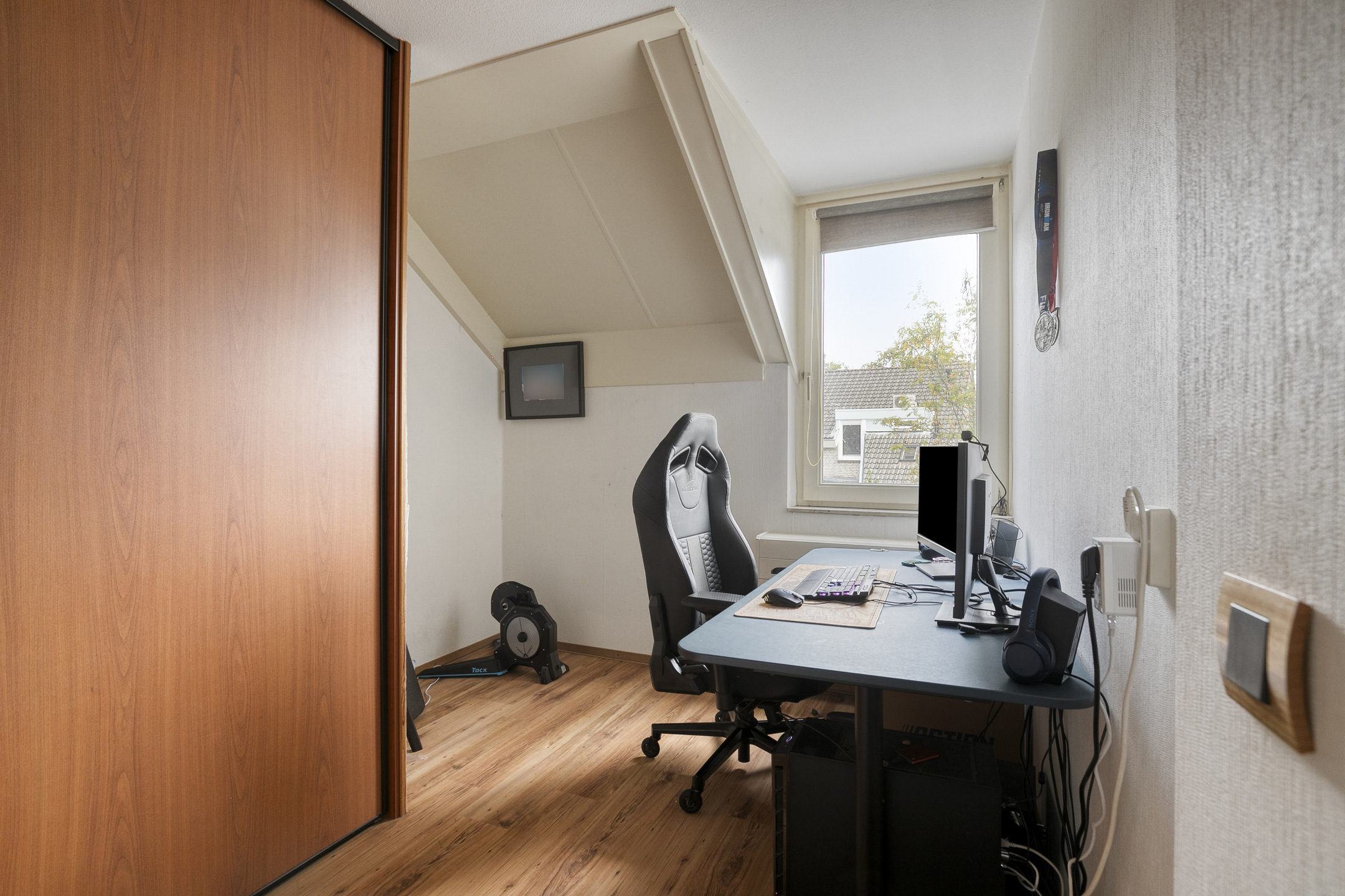 Middels de trap bereikt u de ruime overloop. De overloop biedt toegang tot een grote slaapkamer aan de voorzijde, welke op dit moment in gebruik is als ouderslaapkamer. Hier is een airco geplaatst en 1 1/5 maand geleden een nieuwe laminaatvloer (over tapijt), er is hier verlichting met een draadloze schakelaar, naast deze slaapkamer is een grote inloopkast gemaakt met een vaste kast met schuifdeuren. Aan de achterzijde is de 2e slaapkamer gelegen welke op dit moment in gebruik is als kantoor met inbouwkast. Het is makkelijk om hier een goede slaapkamer van te maken. Naast deze slaapkamer bevindt zich de moderne badkamer (2015). De badkamer heeft een moderne grijze en witte tegel en is voorzien van een ligbad met handdouche, 2e toilet, een douche met regen-/ en handdouche, een wastafelmeubel met grote wasbak en dubbele kranen, een spiegelkast met verlichting en een designradiator. Boven de garage bevindt zich de 3e slaapkamer. Deze is zeer ruim en licht met aan beide zijde raampartijen. De gehele verdieping is voorzien van een nette laminaatvloer.