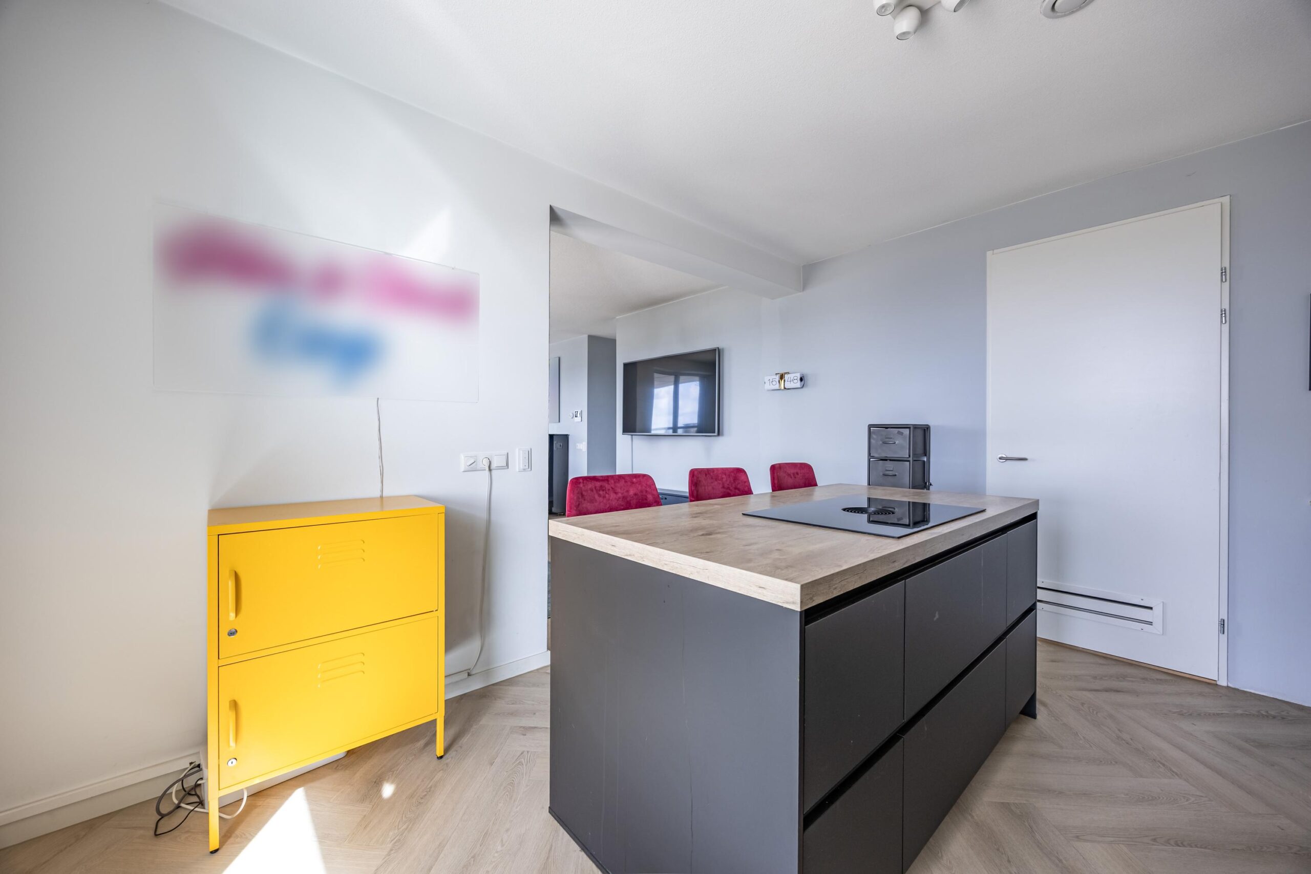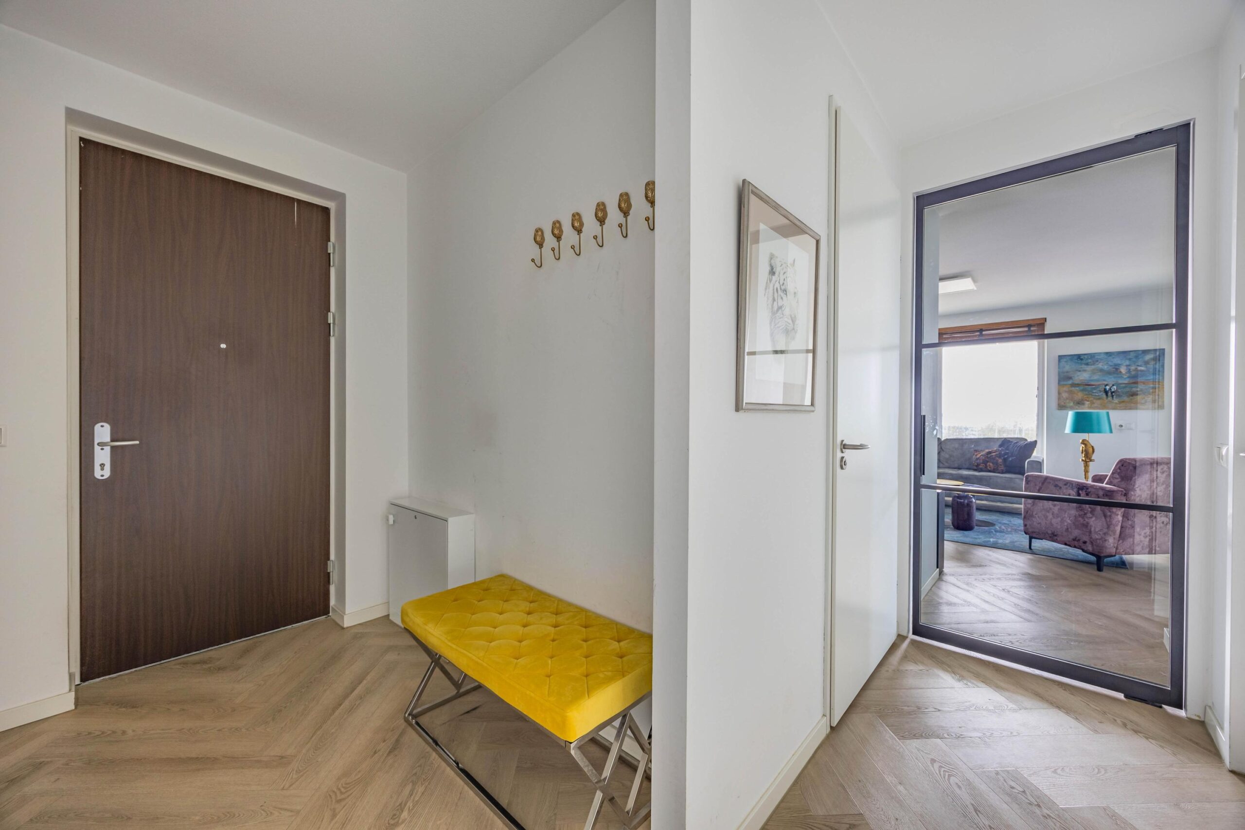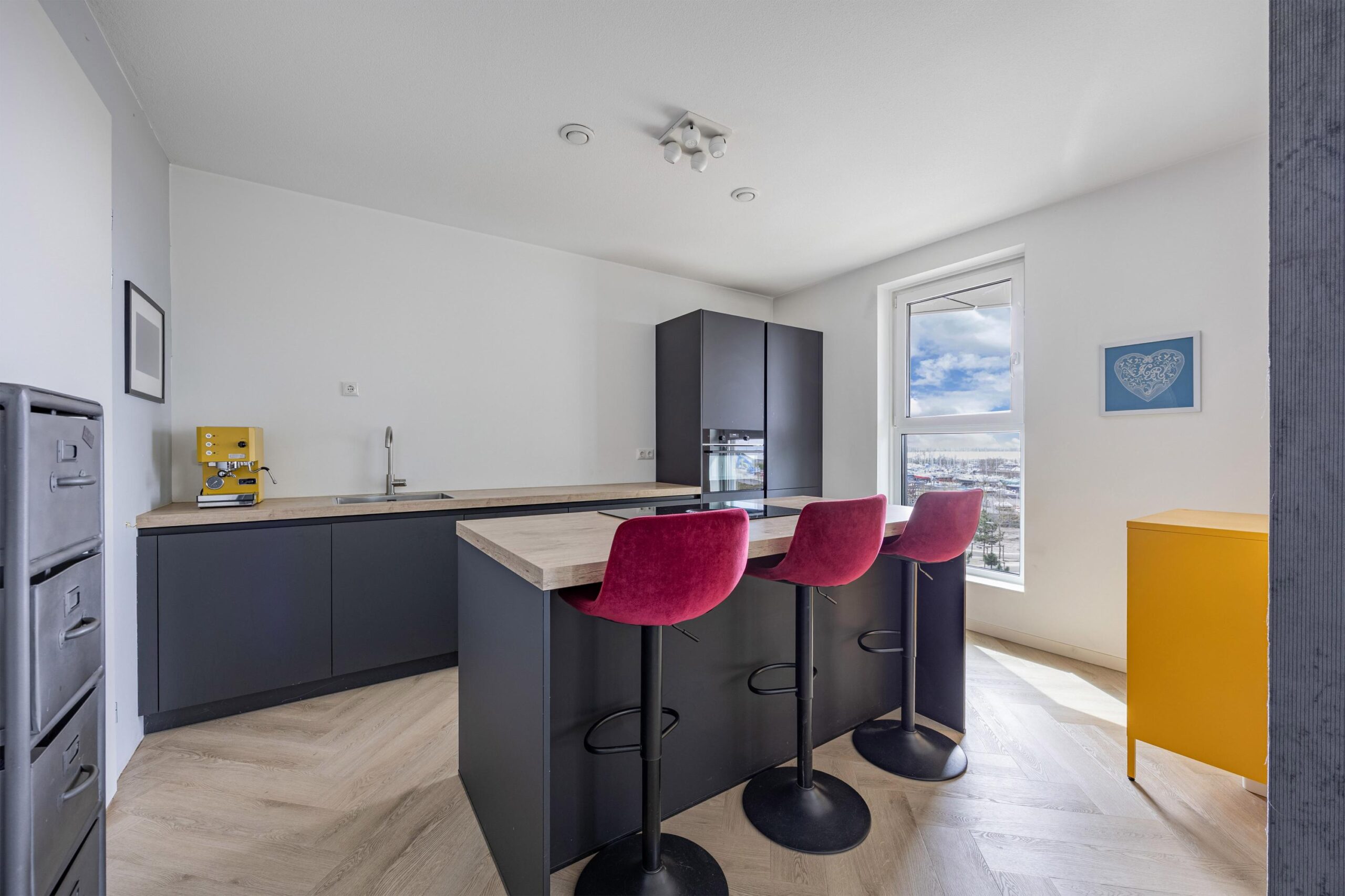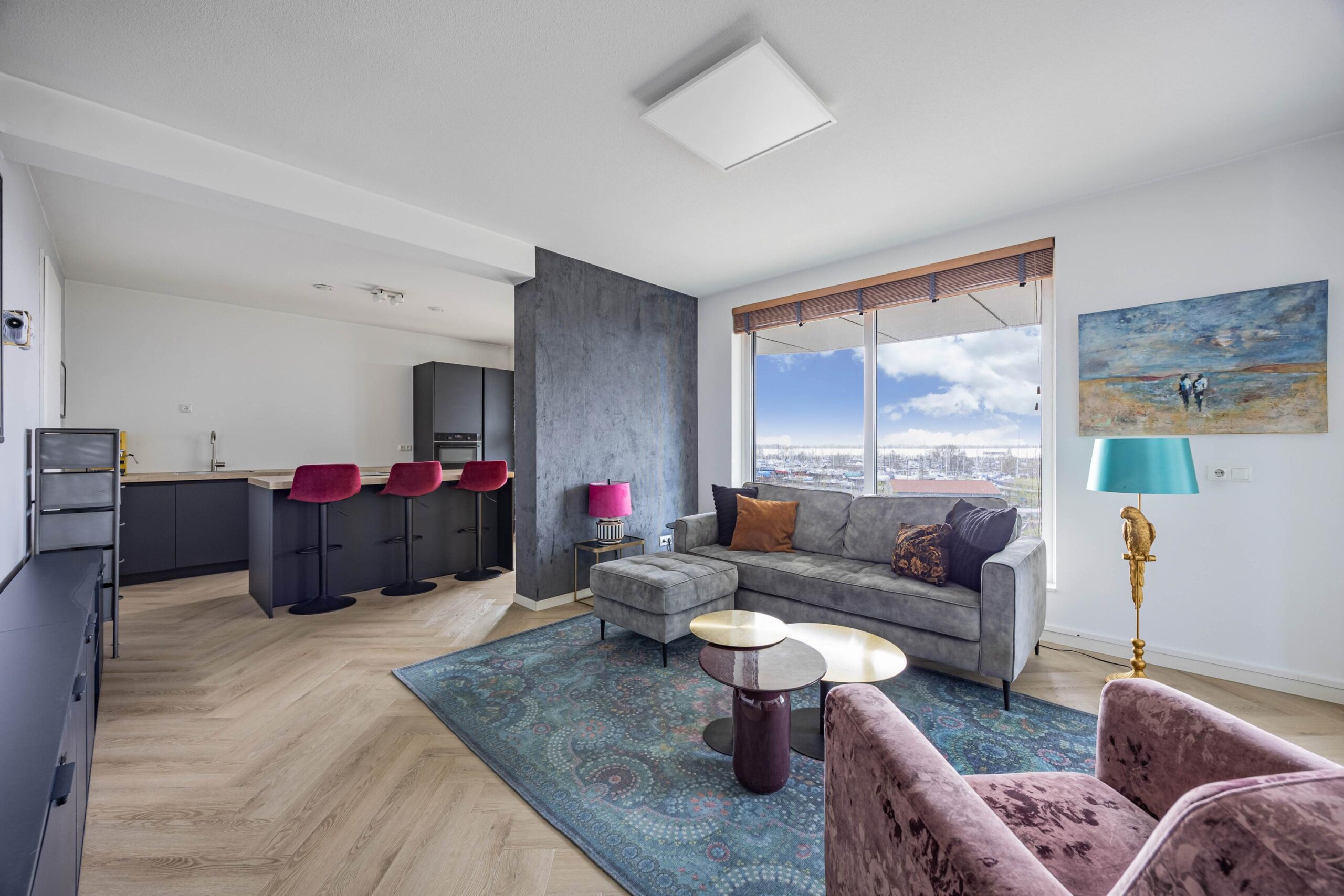 De entree van het complex is ruim en verzorgd en geeft toegang tot de liften, trappenhuis, parkeergarage en bergingen. Eenmaal binnen in het appartement voelt u direct de prettige sfeer. De strakke afwerking, de PVC vloer met vloerverwarming zorgen voor een rustige basis. U komt binnen in de ruime hal met voldoende ruimte voor de garderobe. Via de gang en de stalen taatsdeur komt u uit in het woongedeelte. De woonkamer is licht en speels opgezet en biedt een fraai uitzicht over het de haven en boulevard. Hier is in het midden volop ruimte voor een gezellige zithoek en aan de rechterzijde een heerlijke plek voor een eettafel waar u lange avonden in de avondzon kunt doorbrengen met vrienden of familie.