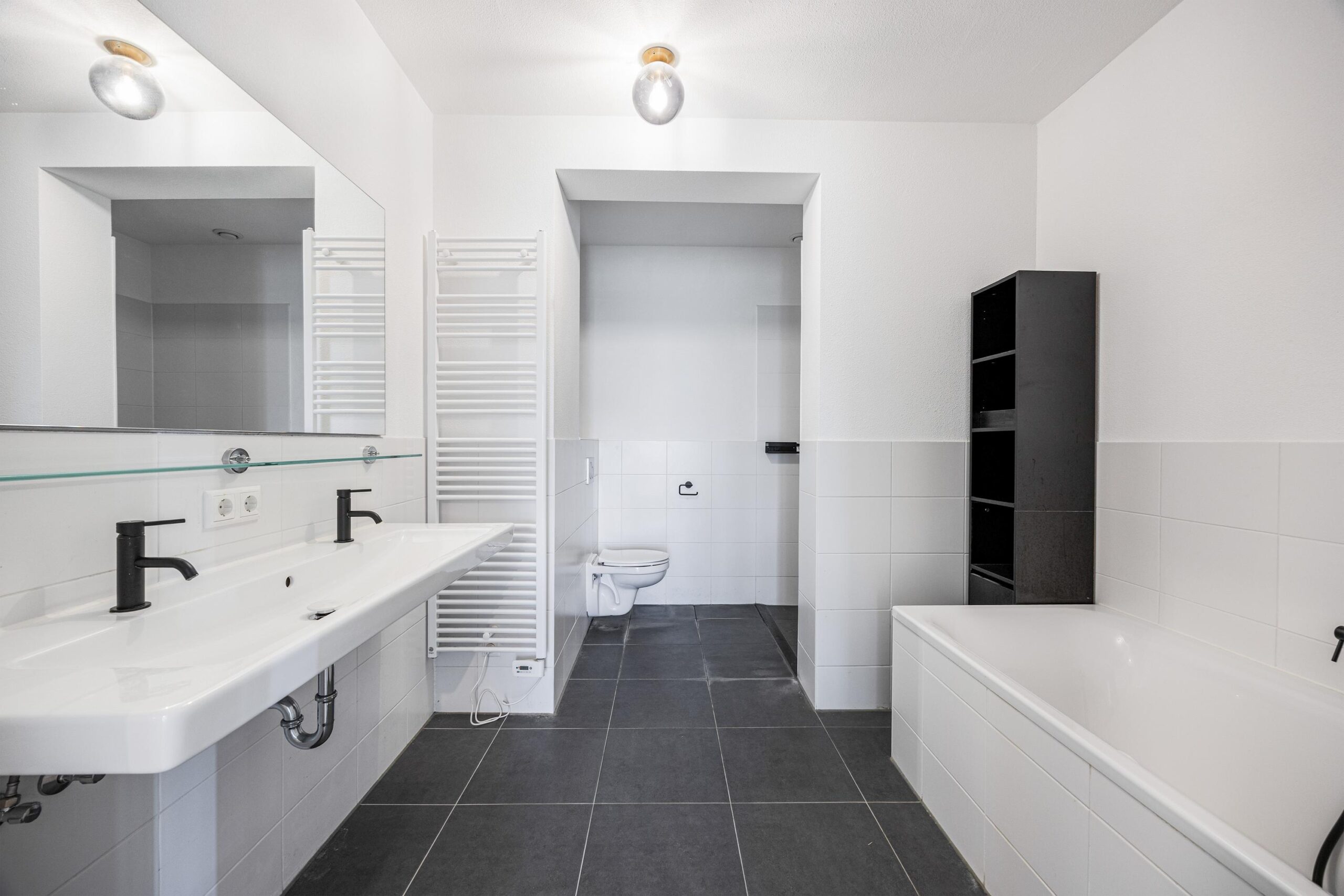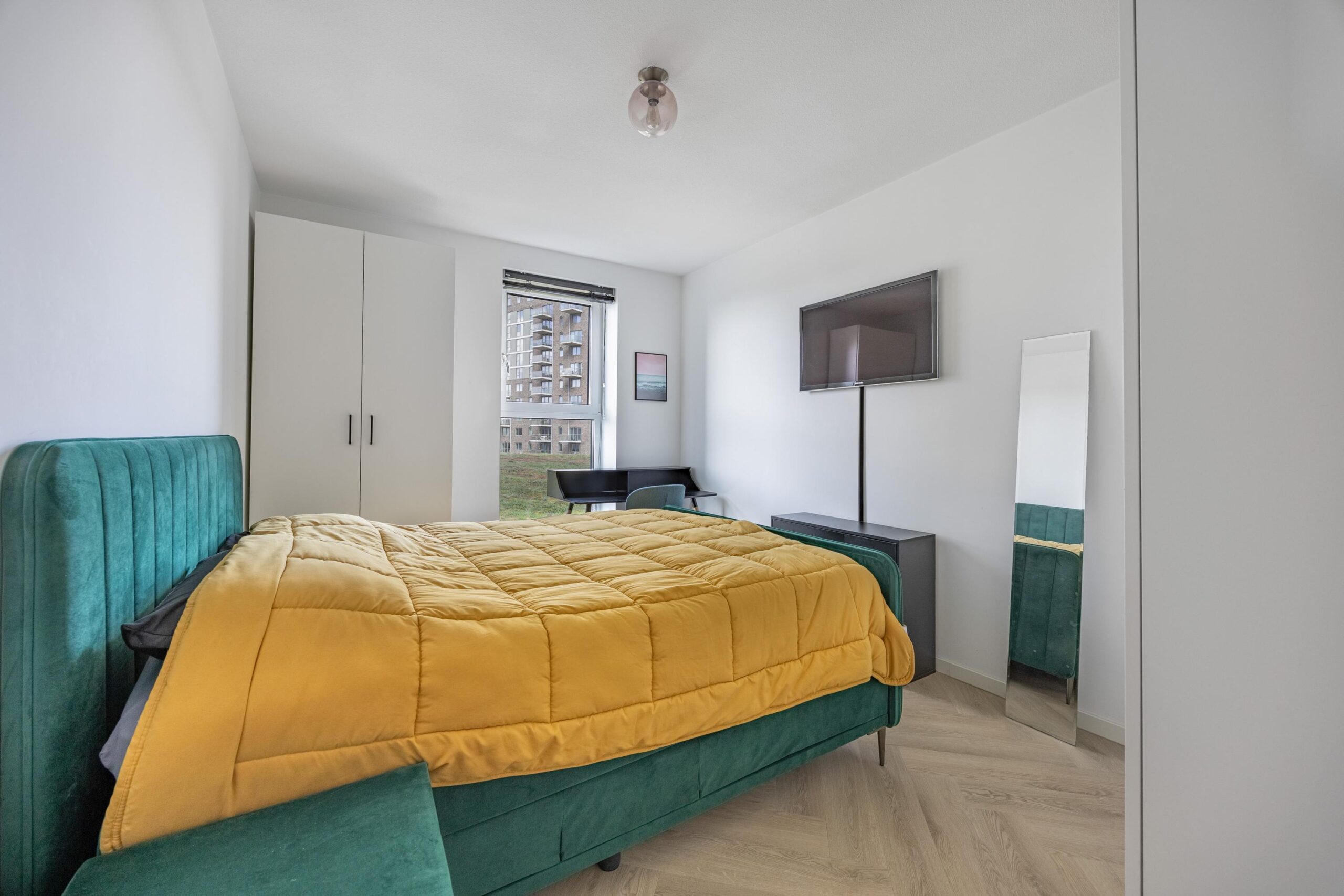 De slaapkamers zijn aan de zijkant gelegen en zijn licht en rustig gelegen met uitzicht op het groene sedumdak. De badkamer is ruim en verzorgd uitgevoerd met een ligbad, een inloopdouche, een wastafel met 2 kranen, spiegel, een handdoekradiator en toilet. In de hal is een separate, tweede, toilet uitgevoerd in dezelfde nette stijl.