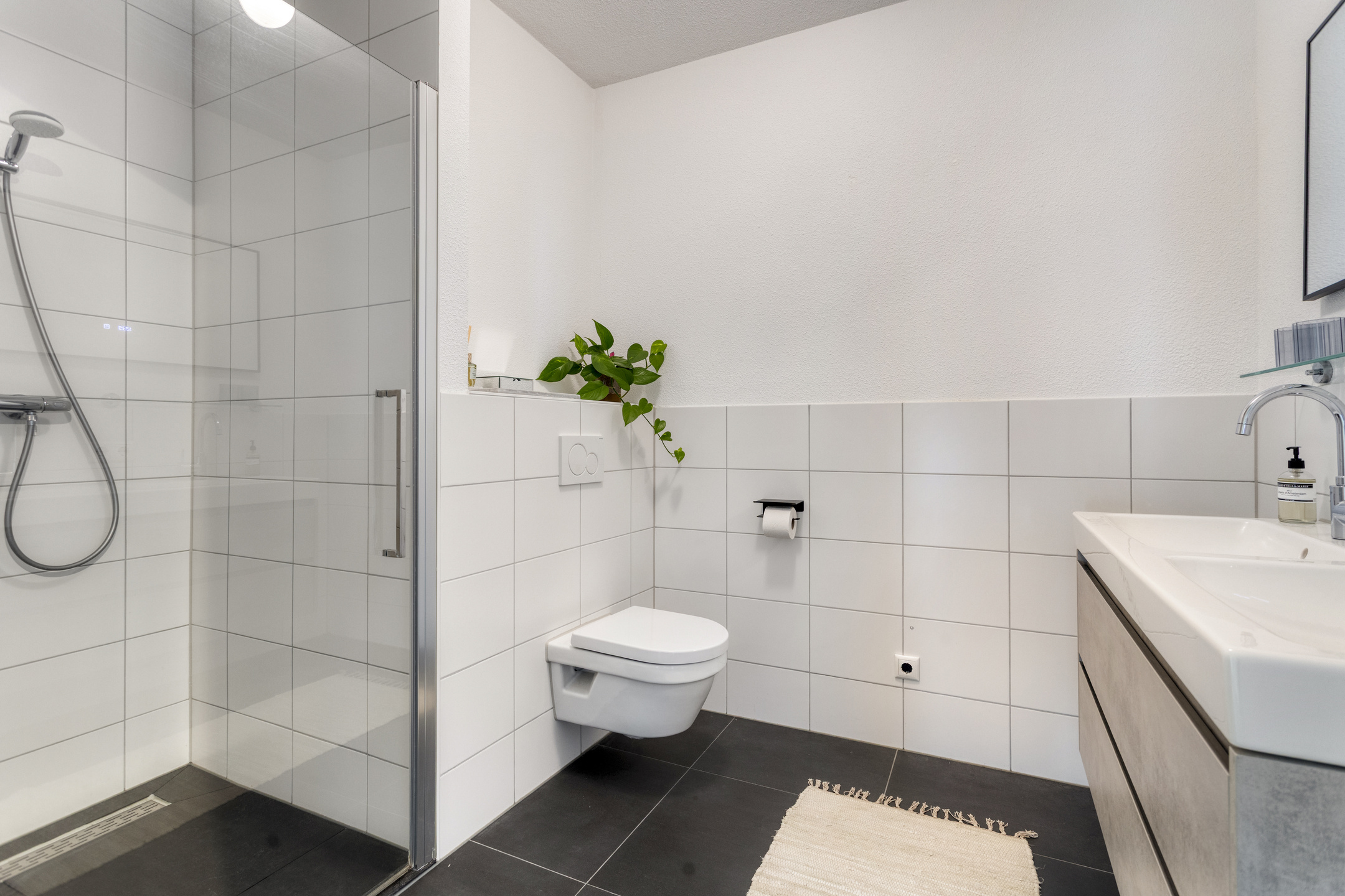 Aan de overzijde van de gang heeft u toegang tot de badkamer. De badkamer is voorzien van een witte wandtegel en een antraciet kleur vloertegel. De badkamer beschikt over een inloopdouche met glazen deur, een 2e toilet en een dubbel wastafelmeubel met daarboven een spiegel met ledverlichting en verwarming. Tevens zijn er stopcontacten in de badkamer aanwezig.