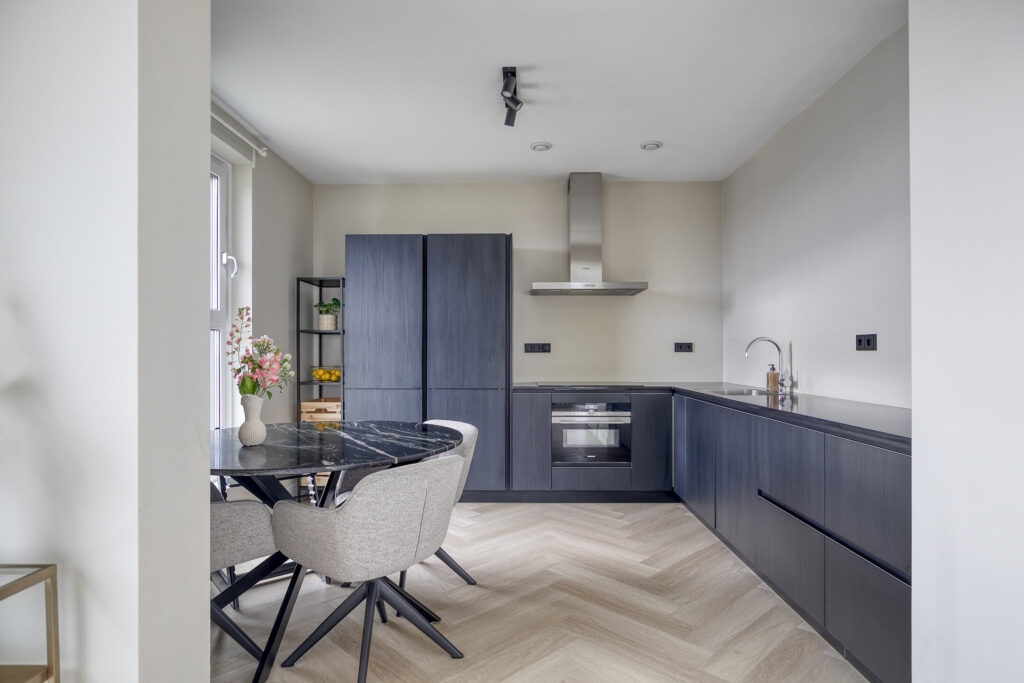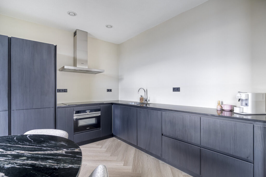 Er is een open keuken met ruimte voor het plaatsen van een eettafel. De keuken is in L-opstelling en heeft een antraciete kleurstelling met een zwart composiet aanrechtblad en veel kastruimte. De keuken is voorzien van Siemens apparatuur waaronder een inductiekookplaat met 5 zones met daarboven een afzuigkap. Er is een combi-oven, een vaatwasser en een koel-vriescombinatie. Naast de keuken vindt u de ruime inpandige berging met de wasmachine aansluiting en WTW-installatie.